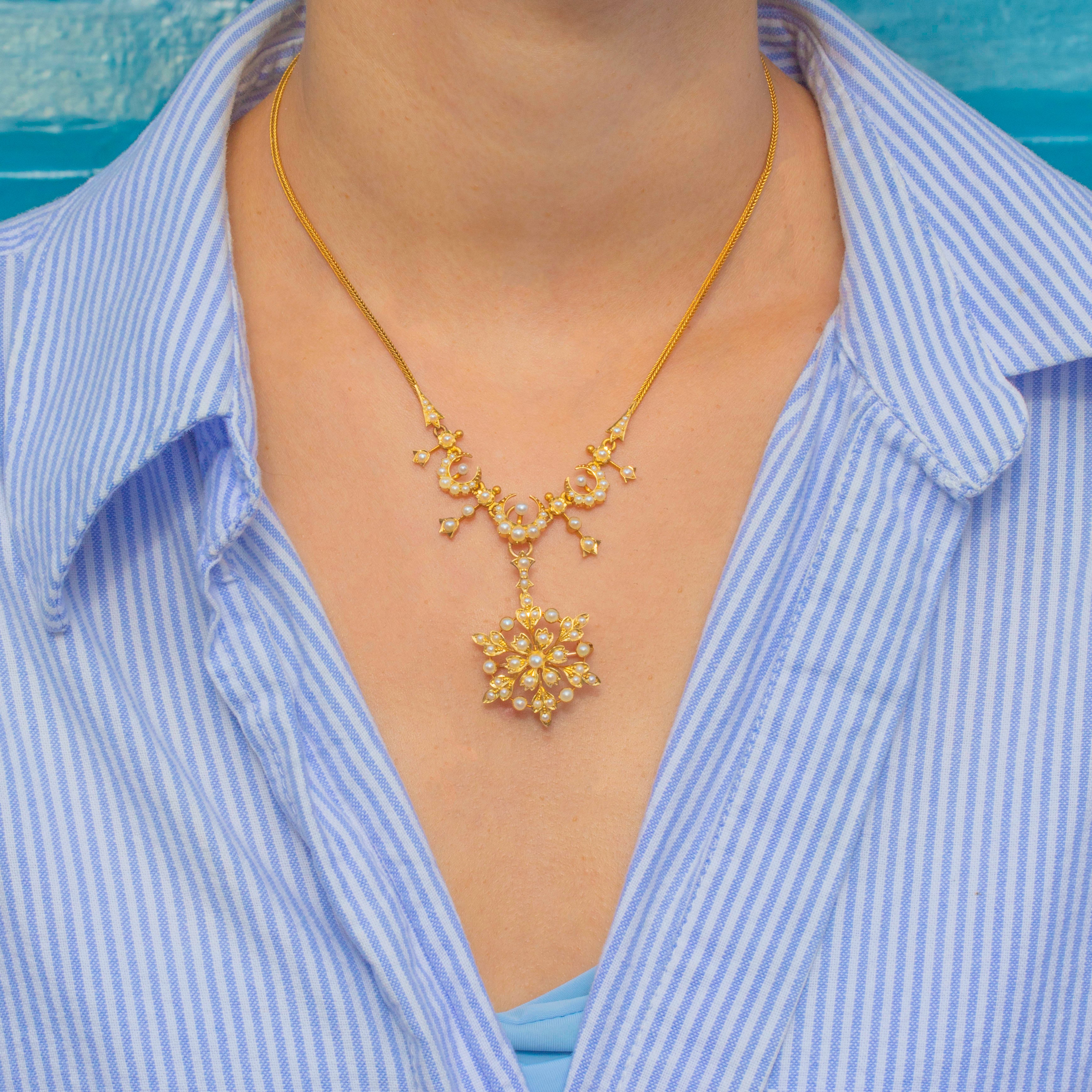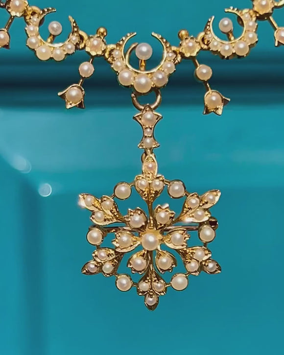 18ct Gold Edwardian Pearl Flower Necklace with Crescent Moon Details - Removable Pendant
