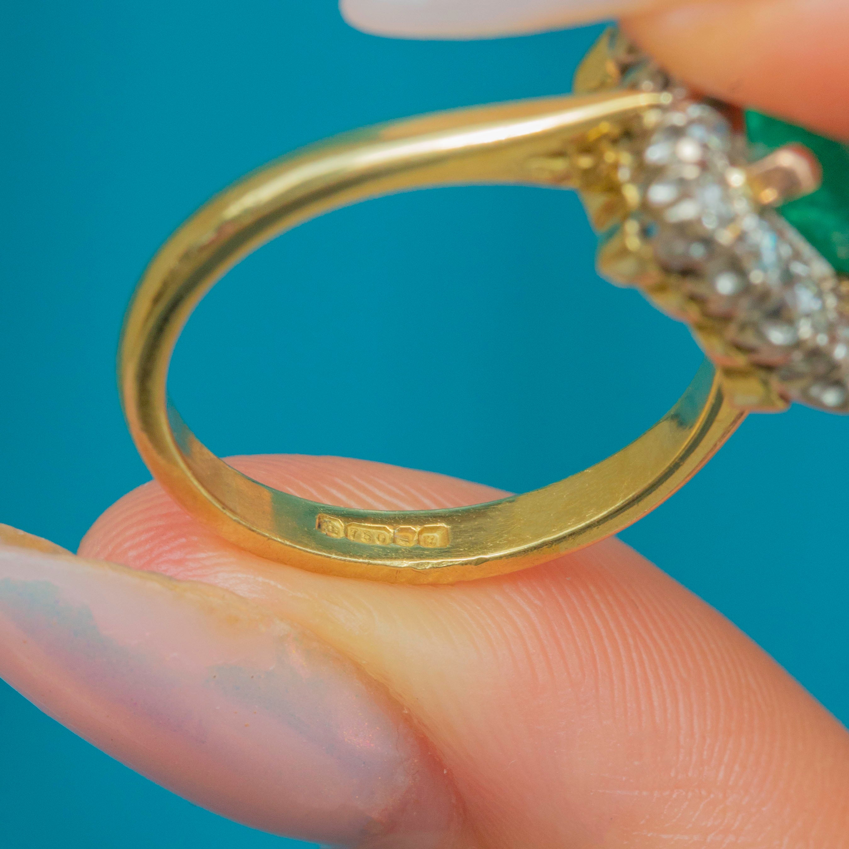 VERY GOOD-EXCELLENT: Each gemstone is radiant and held securely within its setting. There are some abrasions to the top of the Emerald towards the back of the stone (hallmark facing), though this is only visible upon close inspection. With the glossy 18ct Gold band providing comfortable wear, this vintage ring can be worn with utmost confidence.