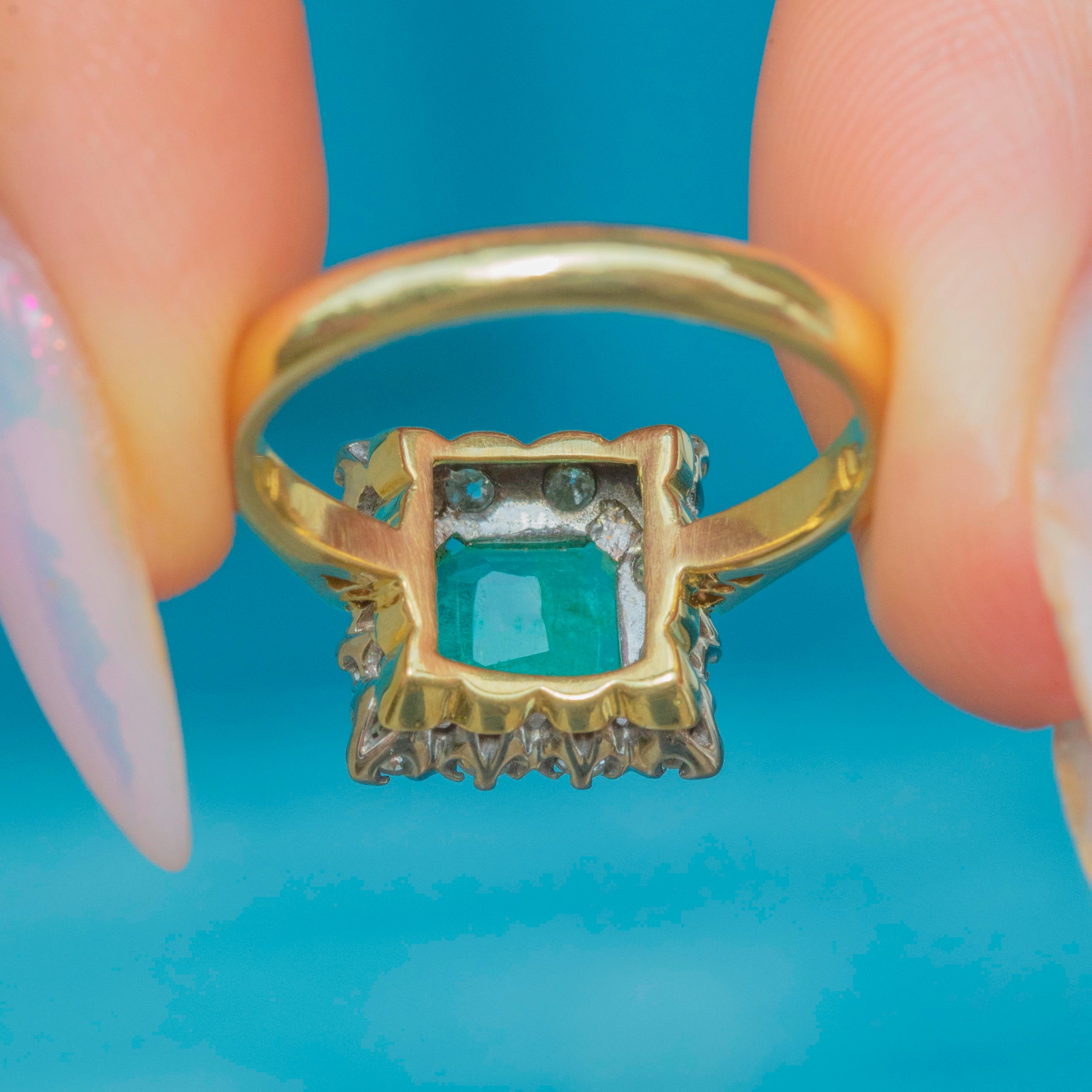 This exquisite vintage 18ct Gold ring features a striking 0.85ct square-cut Emerald at its heart, glowing vibrant minty green hues that shimmer beautifully in the light.