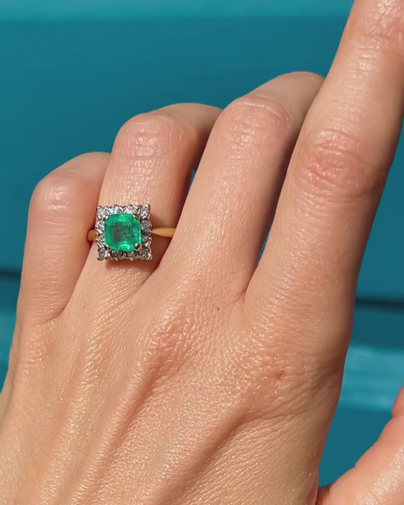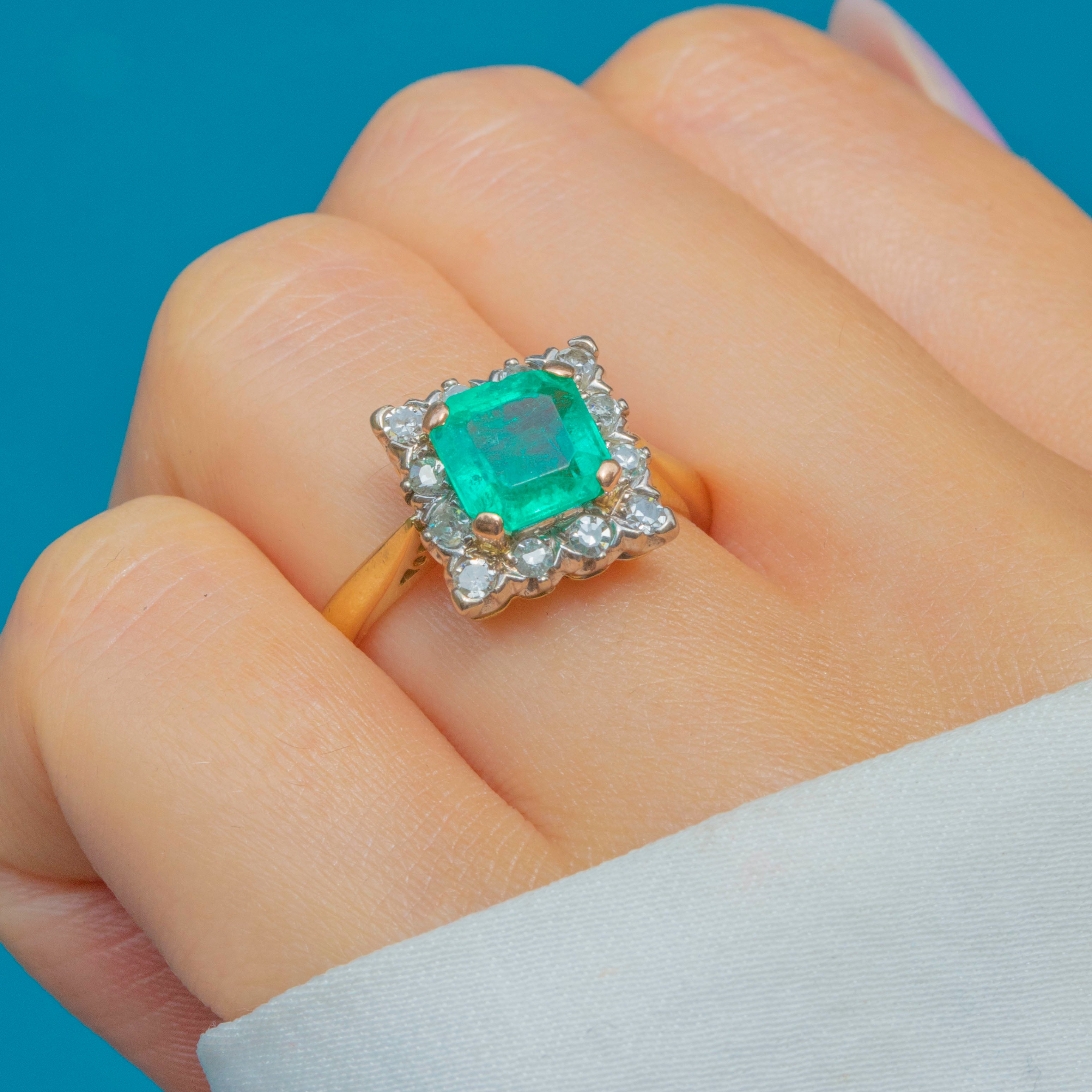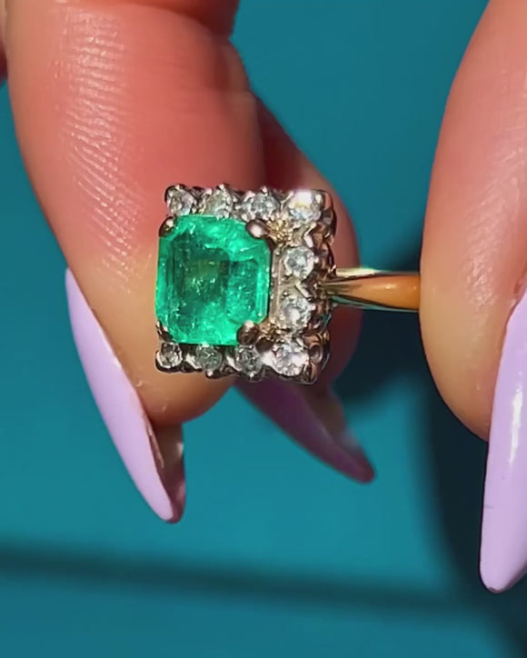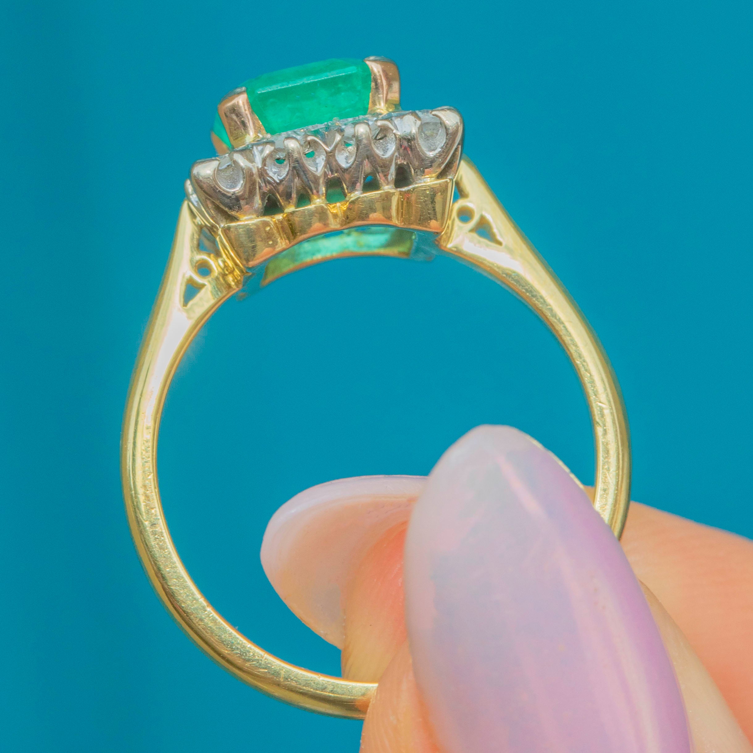 Surrounding the Emerald is a halo of sparkling 0.30ct Diamonds set in glossy 18ct White Gold, enhancing the brilliance of the central gemstone. Complete with a bright and buttery 18ct Yellow Gold band, this vintage cluster ring is a timeless treasure!