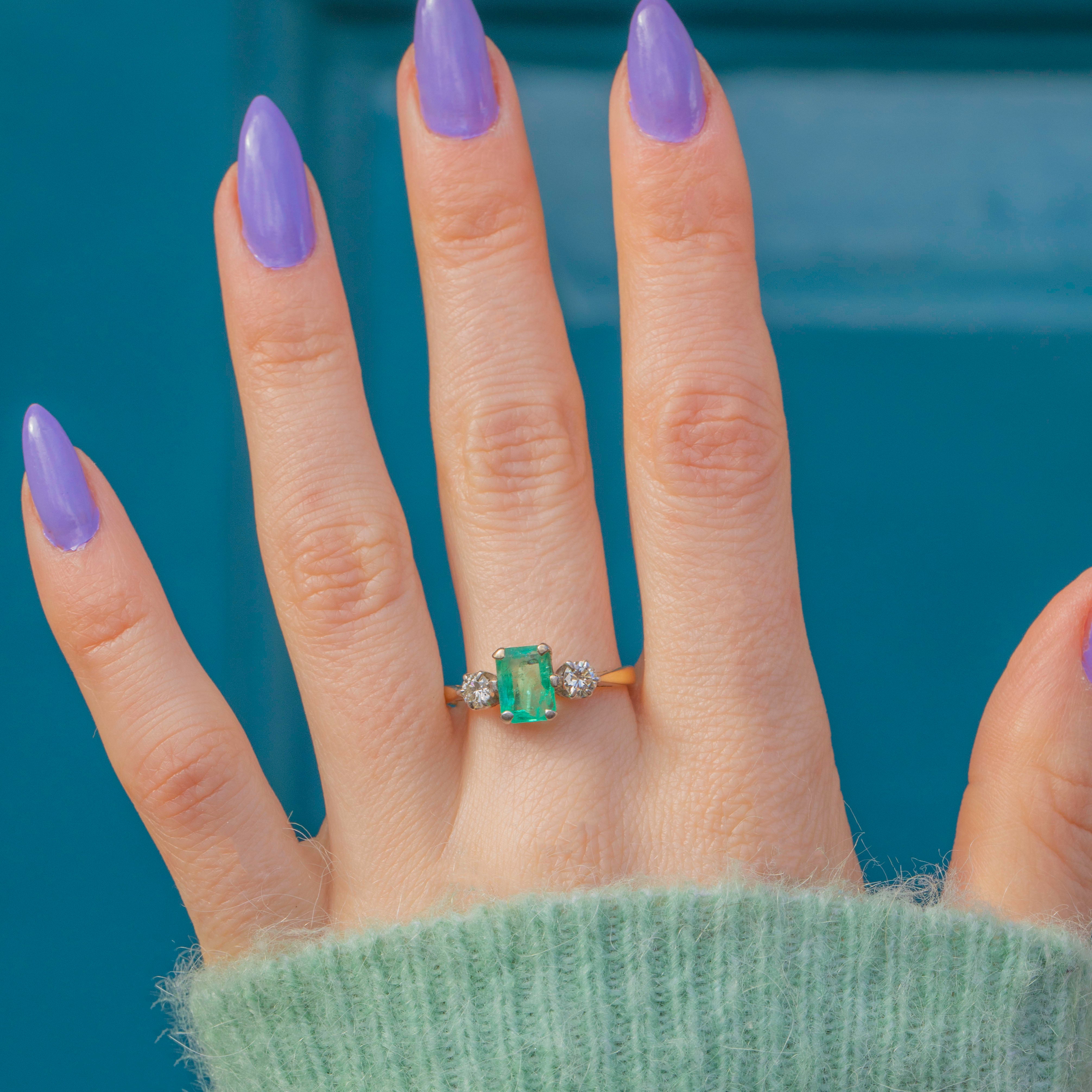 A divine 18ct Gold Emerald and Diamond trilogy ring to adorn your hand! Crafted from an 18ct Gold with Platinum settings, this is a robust piece that you can pop onto your finger for a vibrant pop of colour.