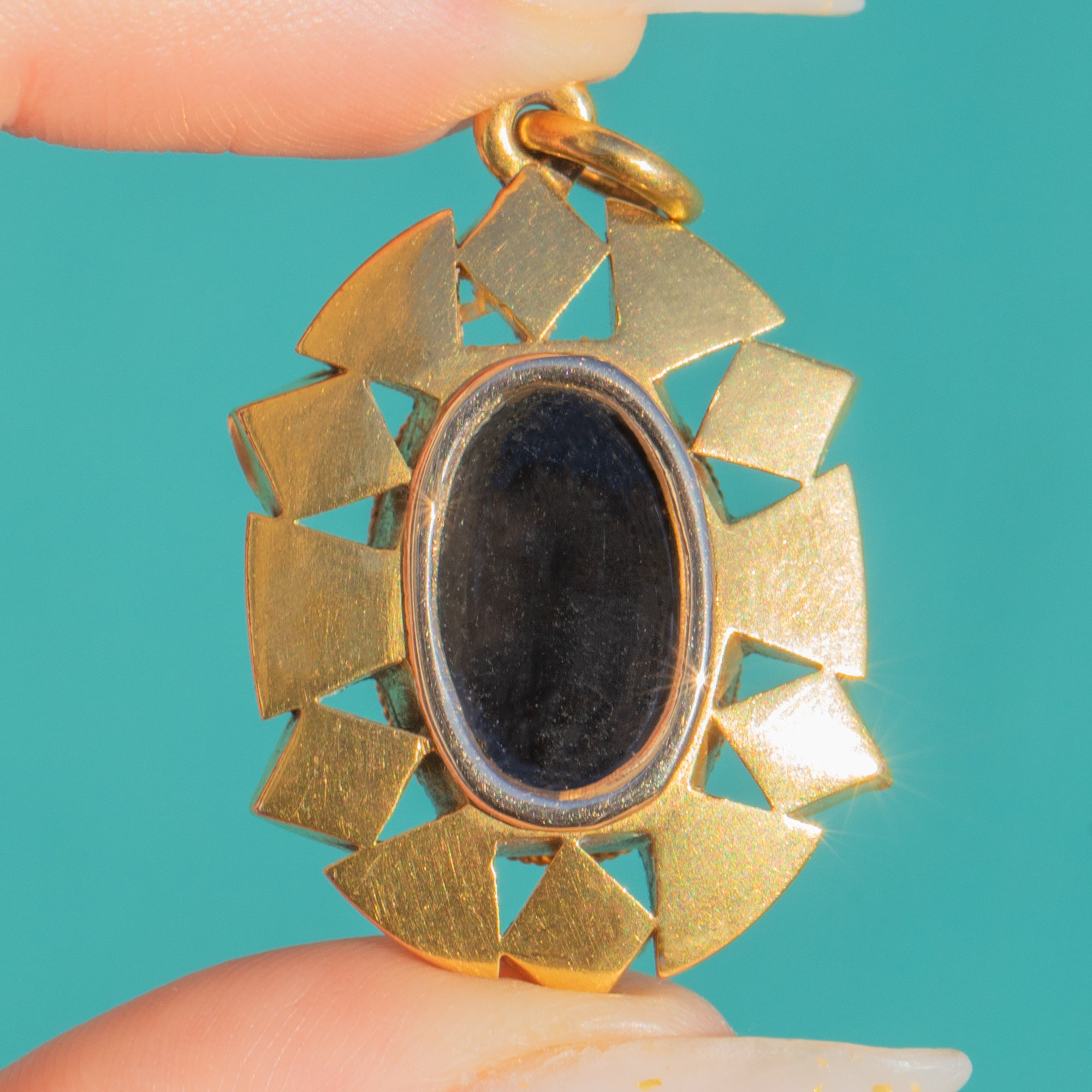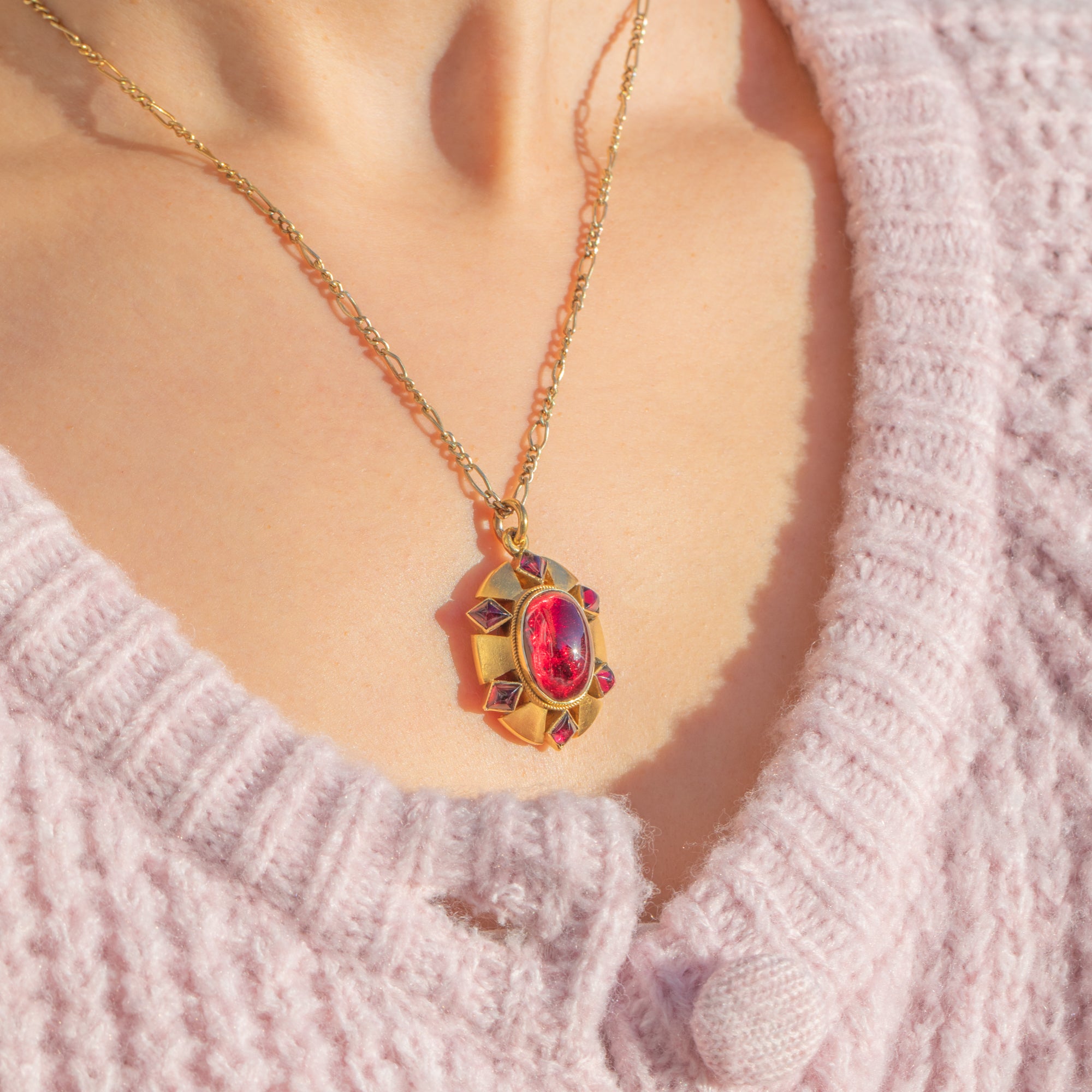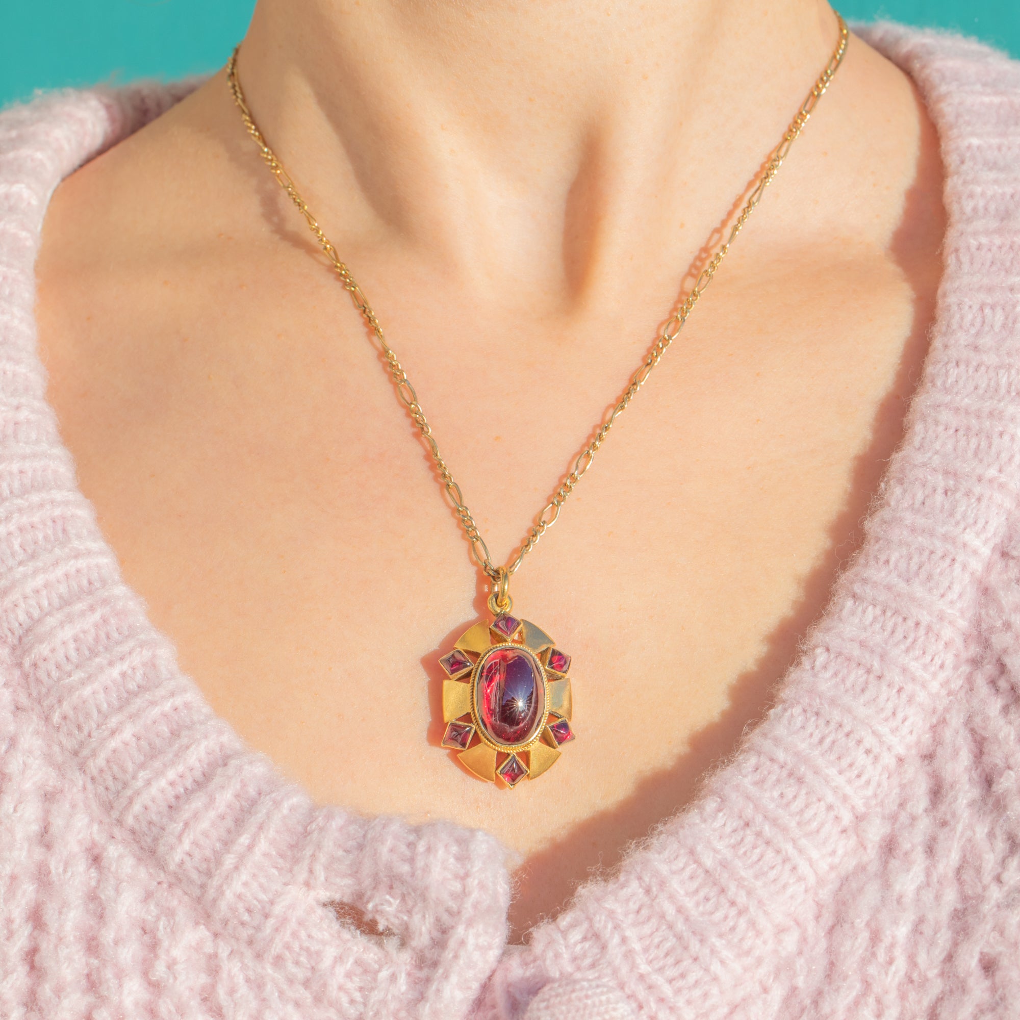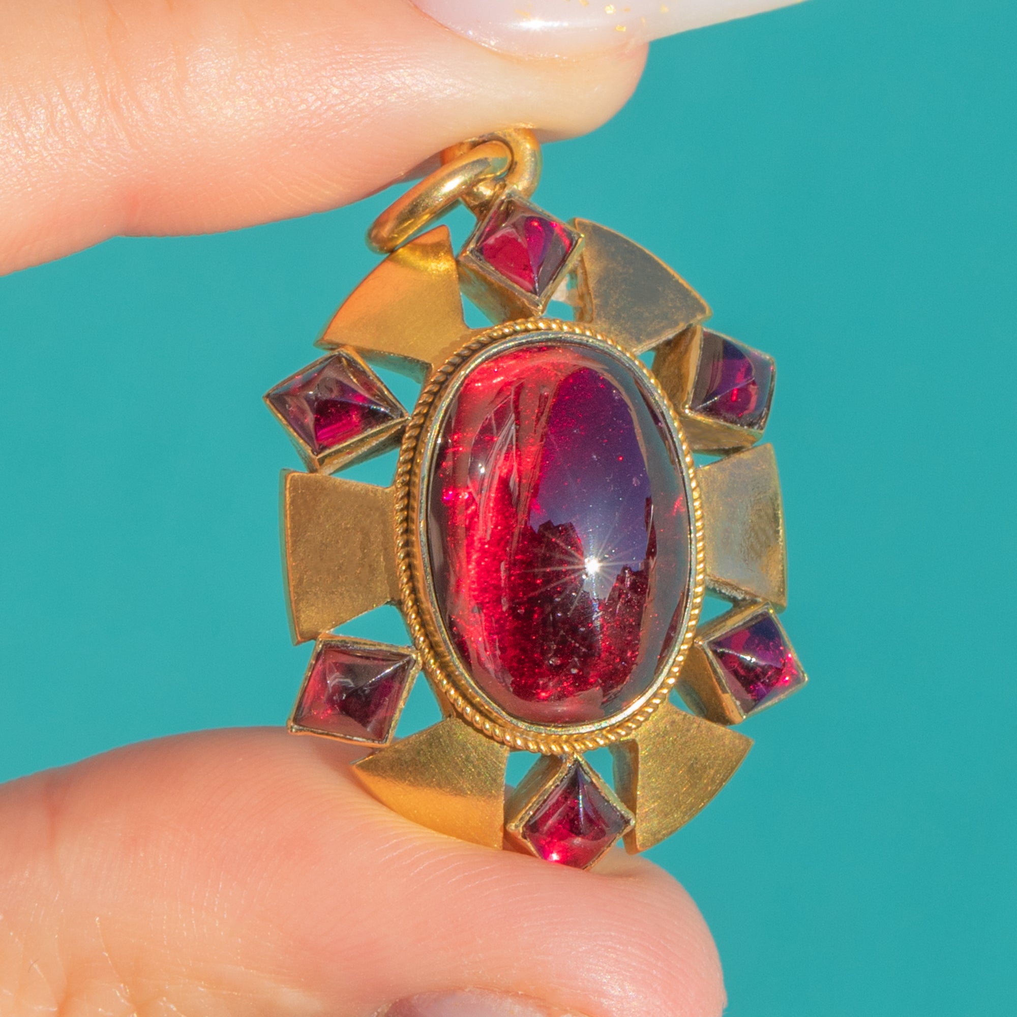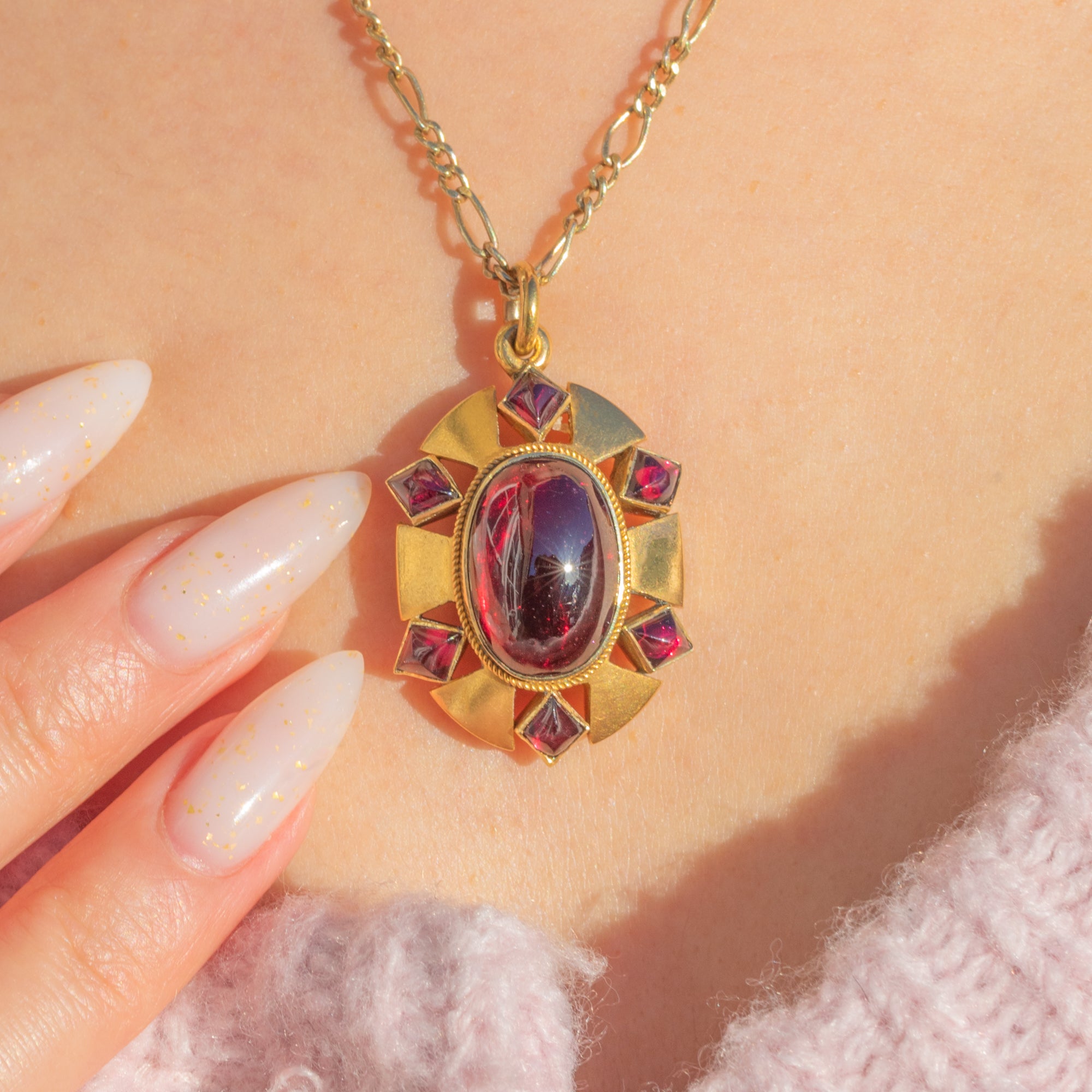 Glowing with a deep wine-red hue, this Victorian 18ct Gold pendant centres on a luscious oval Garnet cabochon framed by a striking sunburst of sculptural, radiating panels. The rich, satin Gold finish and crisp geometry create a bold, compass-like motif, punctuated by small matching Garnet accents set on the diagonal for a refined play of light and texture.