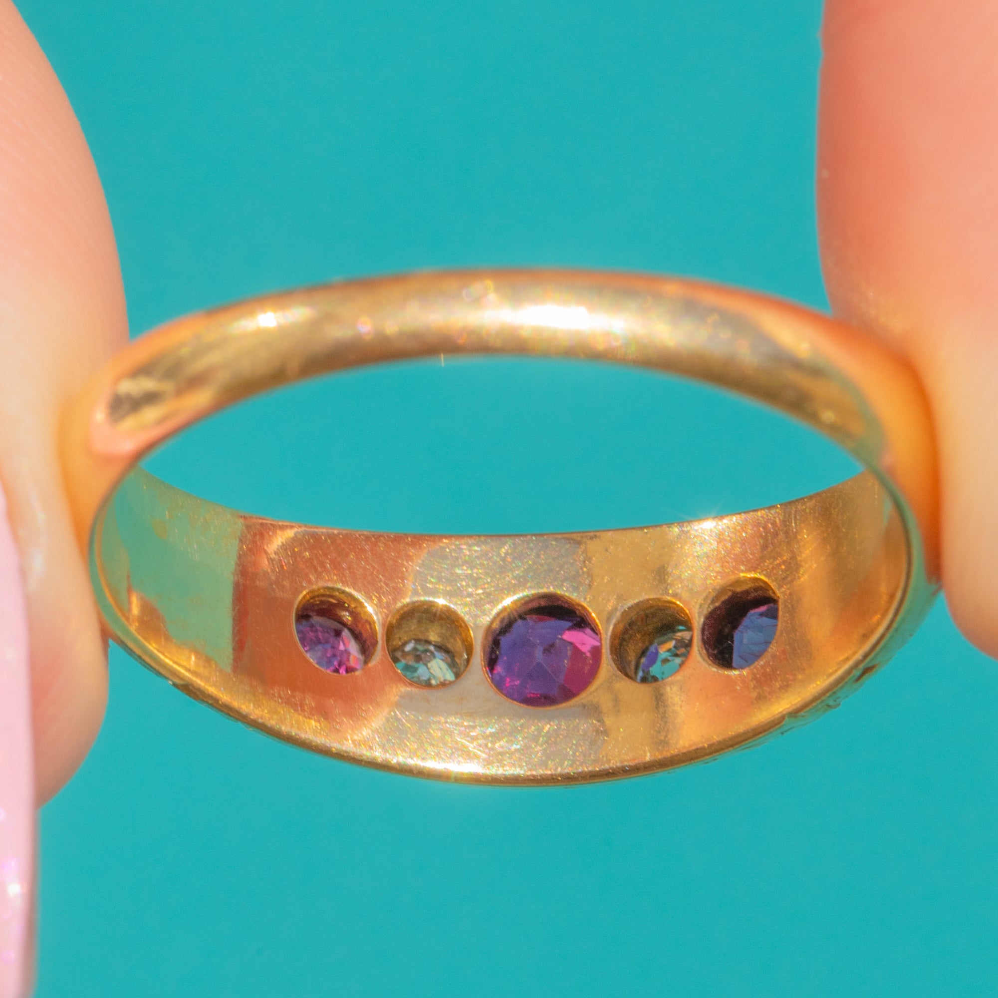 Delicate foliate engraving graces the gallery and shoulders, adding texture and old-world charm to the smooth, elongated “boat” head. Hallmarked for Chester 1898, it’s a refined, wearable antique with lovely colour and sparkle: approximately 0.50ct of Rubies and 0.12ct of Diamonds arranged in a timeless five-stone line that sits close to the finger with effortless elegance.