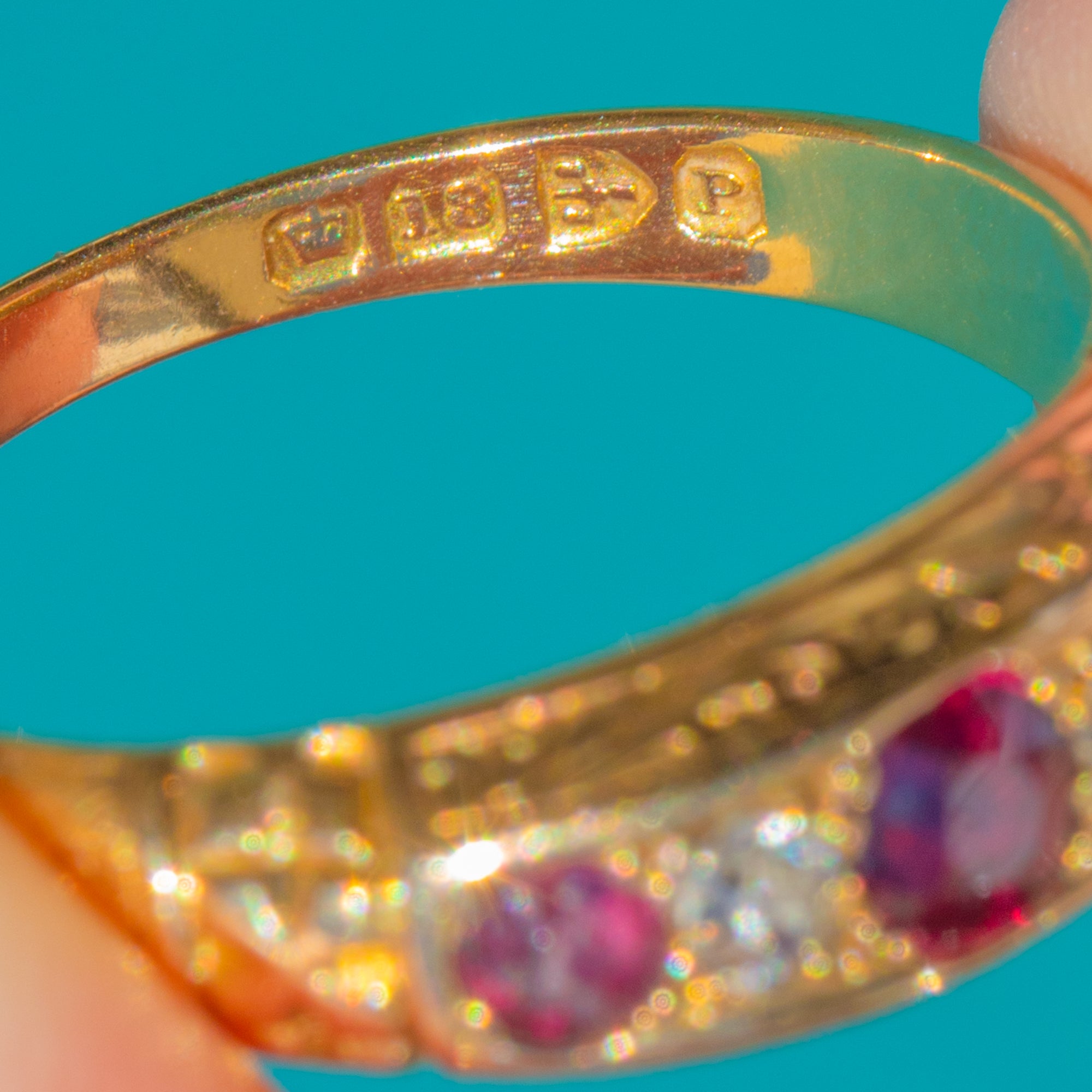 EXCELLENT: Rubies and Diamonds are bright and well-matched with no chips or replacements observed, showing crisp facets and lively sparkle. The 18ct Gold band and settings display only light surface marks and a gentle antique patina; the engraving remains sharply defined. All stones are secure in their settings with very little overall wear noted.