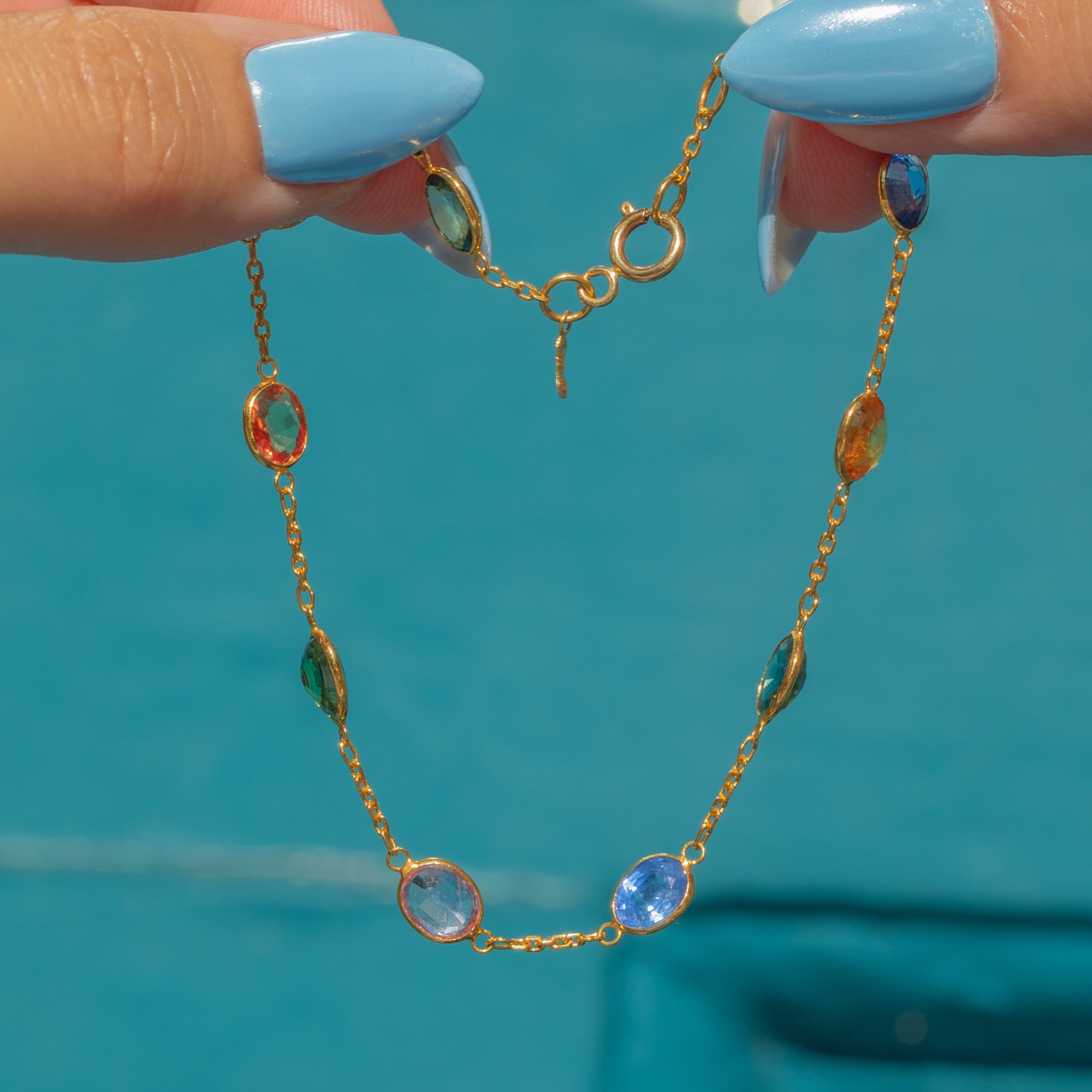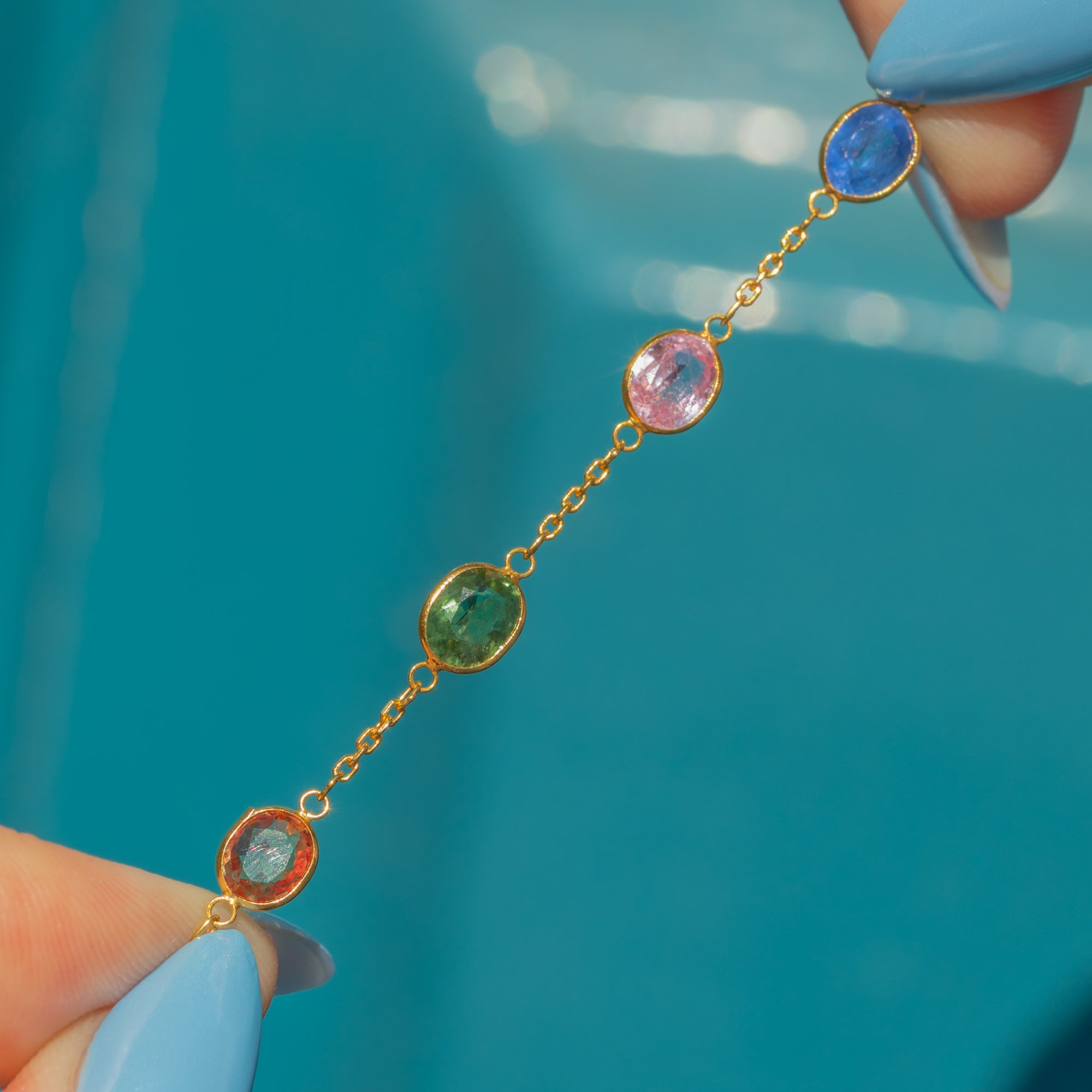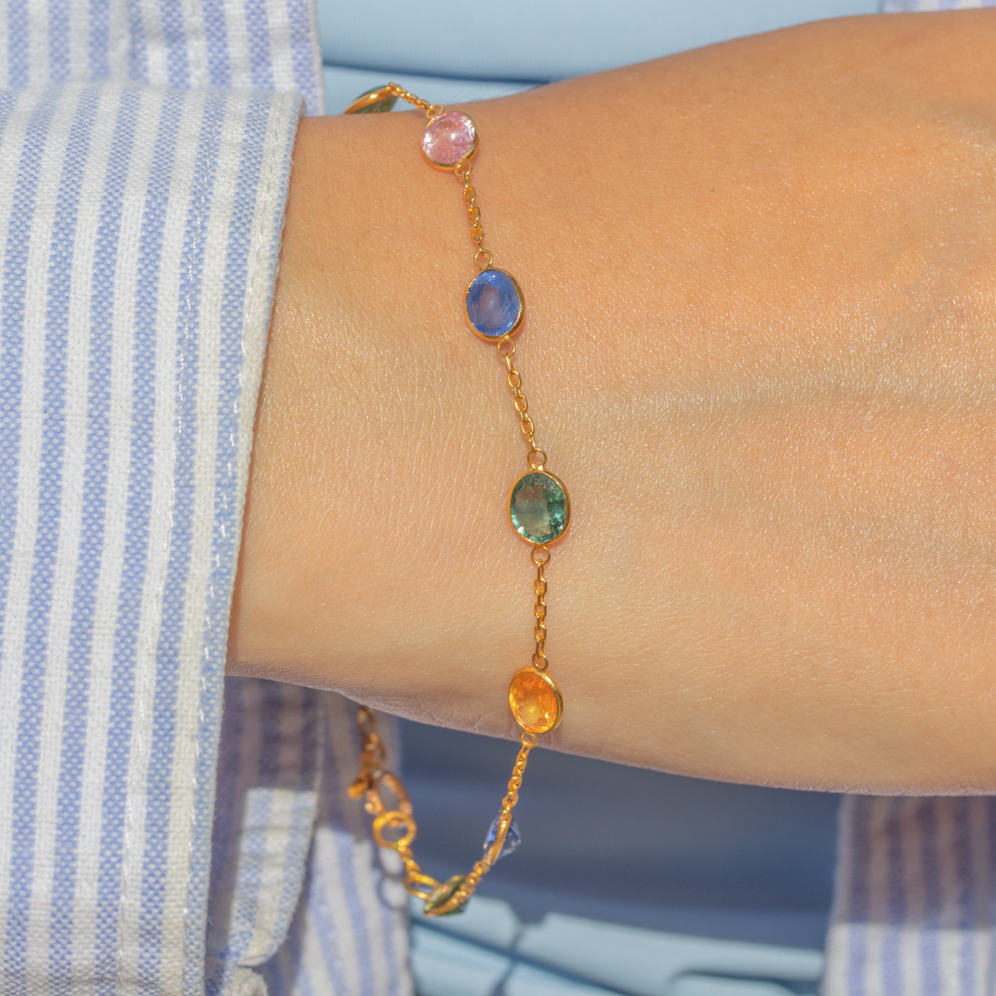 EXCELLENT: Each natural Sapphire is radiant and possesses its uniquely distinct colour palette, set securely within its bezels. The chain is uniform and secure and with a fully functioning bolt ring, this bracelet can be worn with utmost confidence.