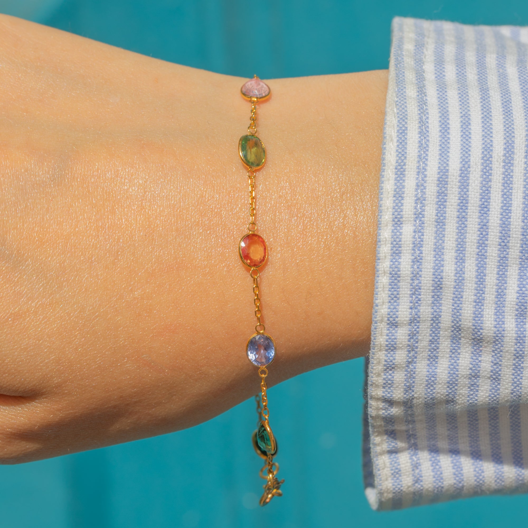 Boasting 3.70ct combined, this bracelet is comprised of ten bezel-set multi tonal natural Sapphires, ranging from soft cornflour blue and teal to striking pink and yellow. Complete with an elegant stamped bolt ring, this vintage bracelet will make a wonderful addition to your collection.