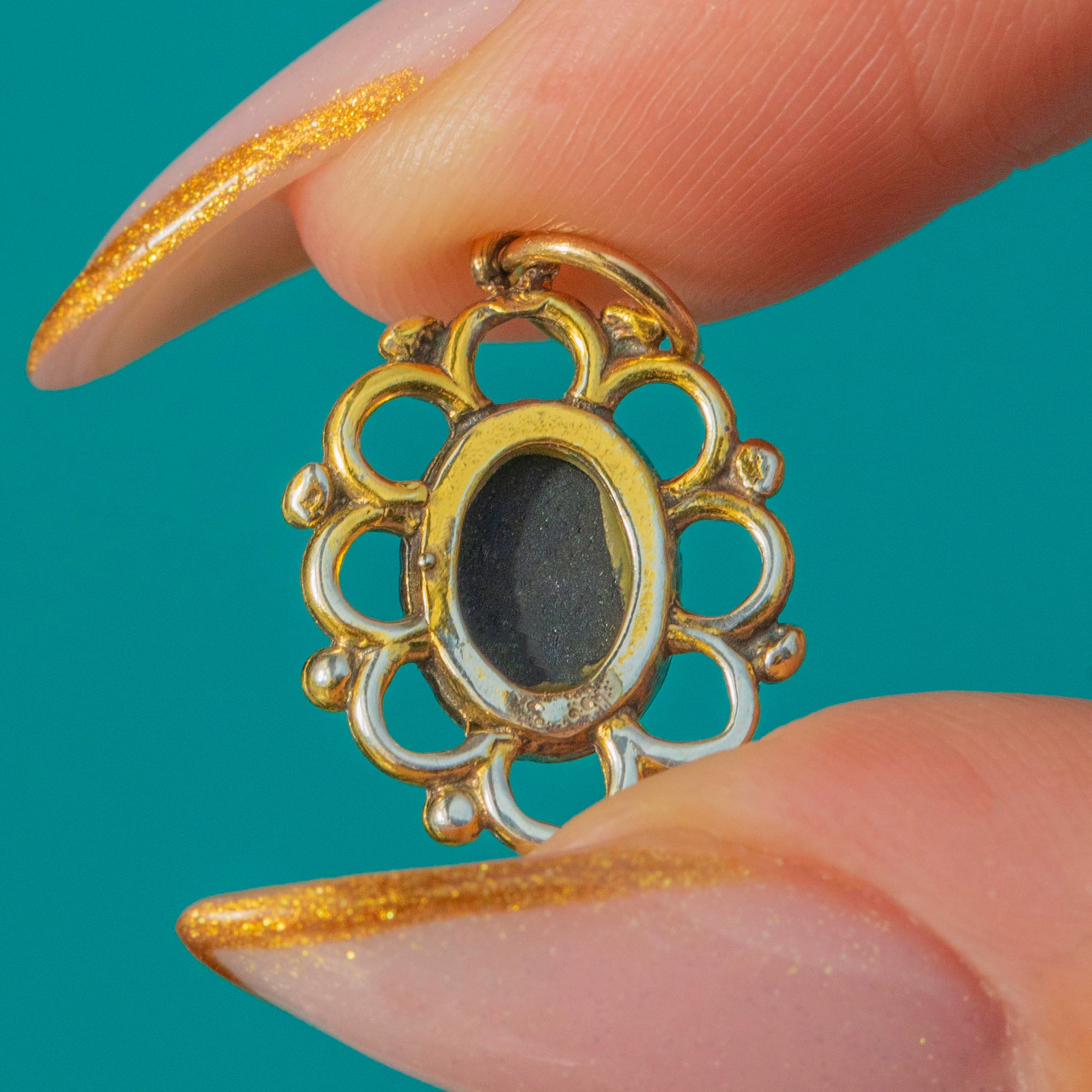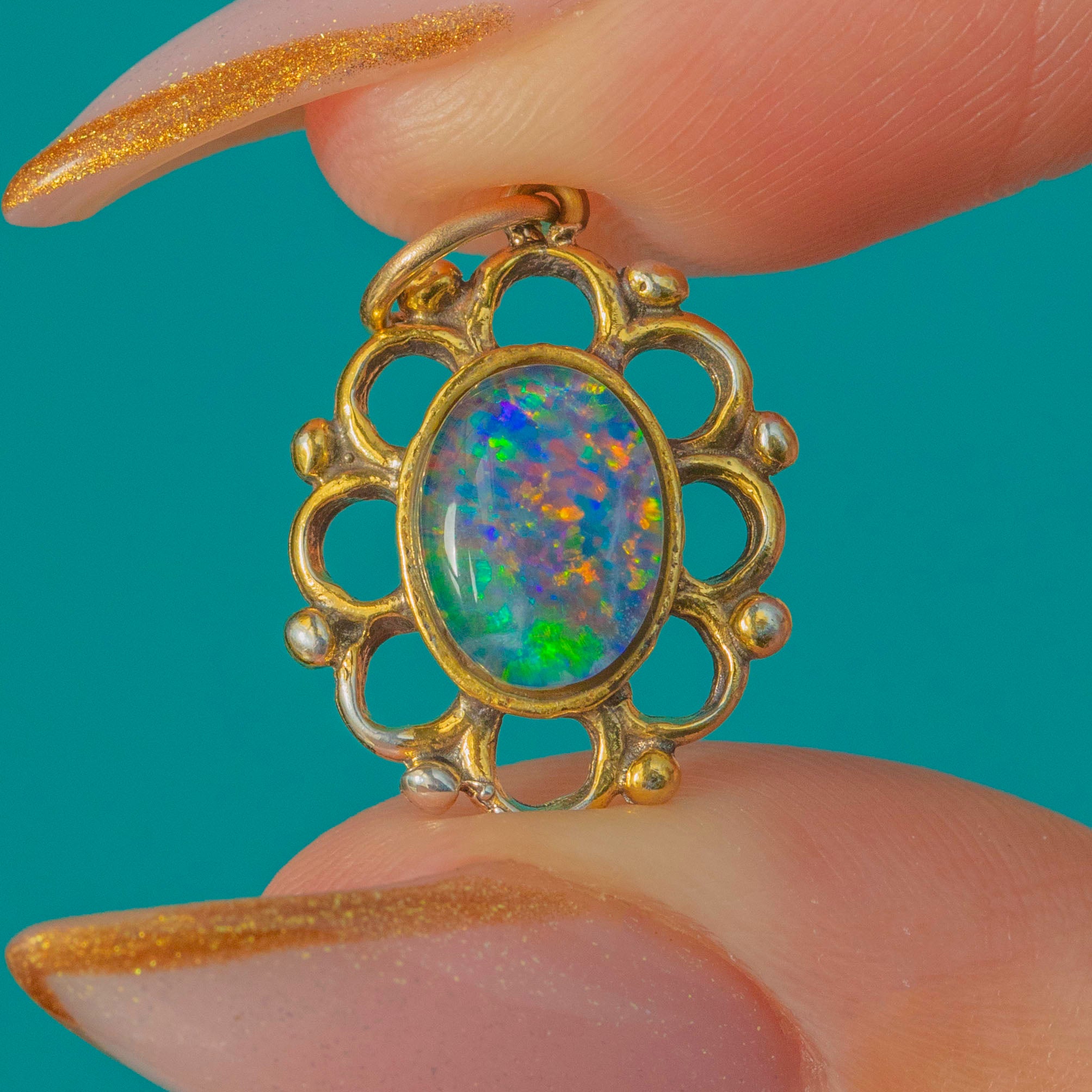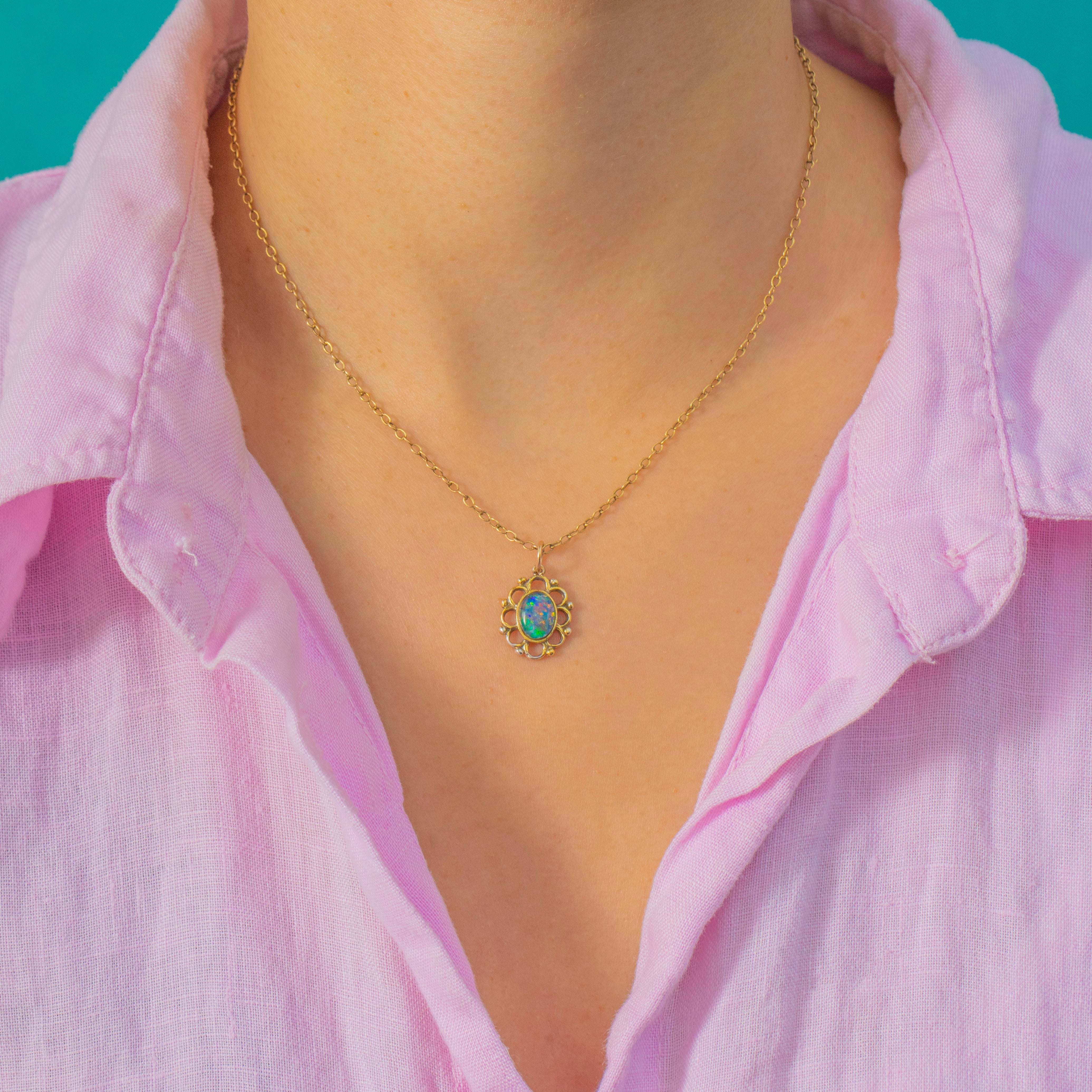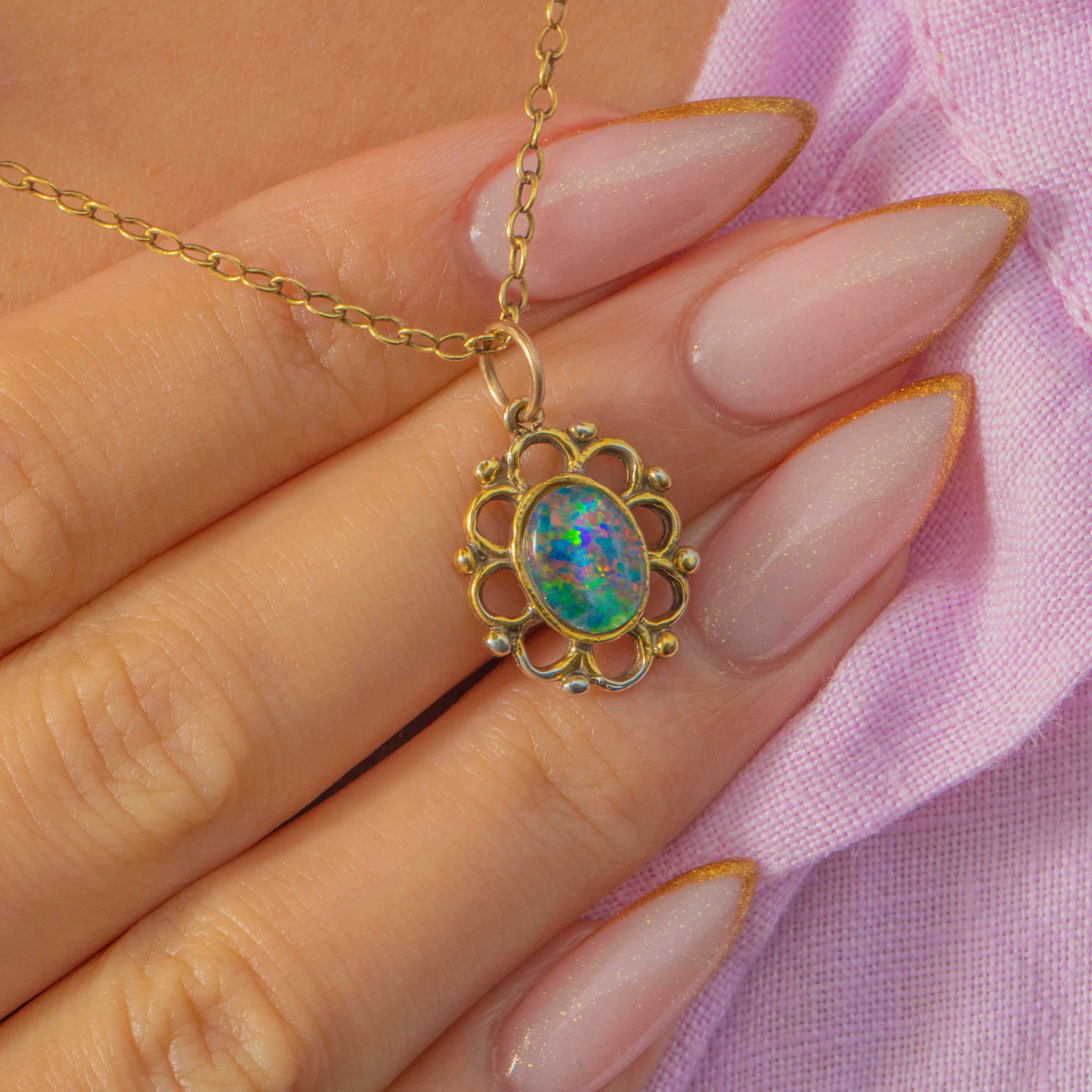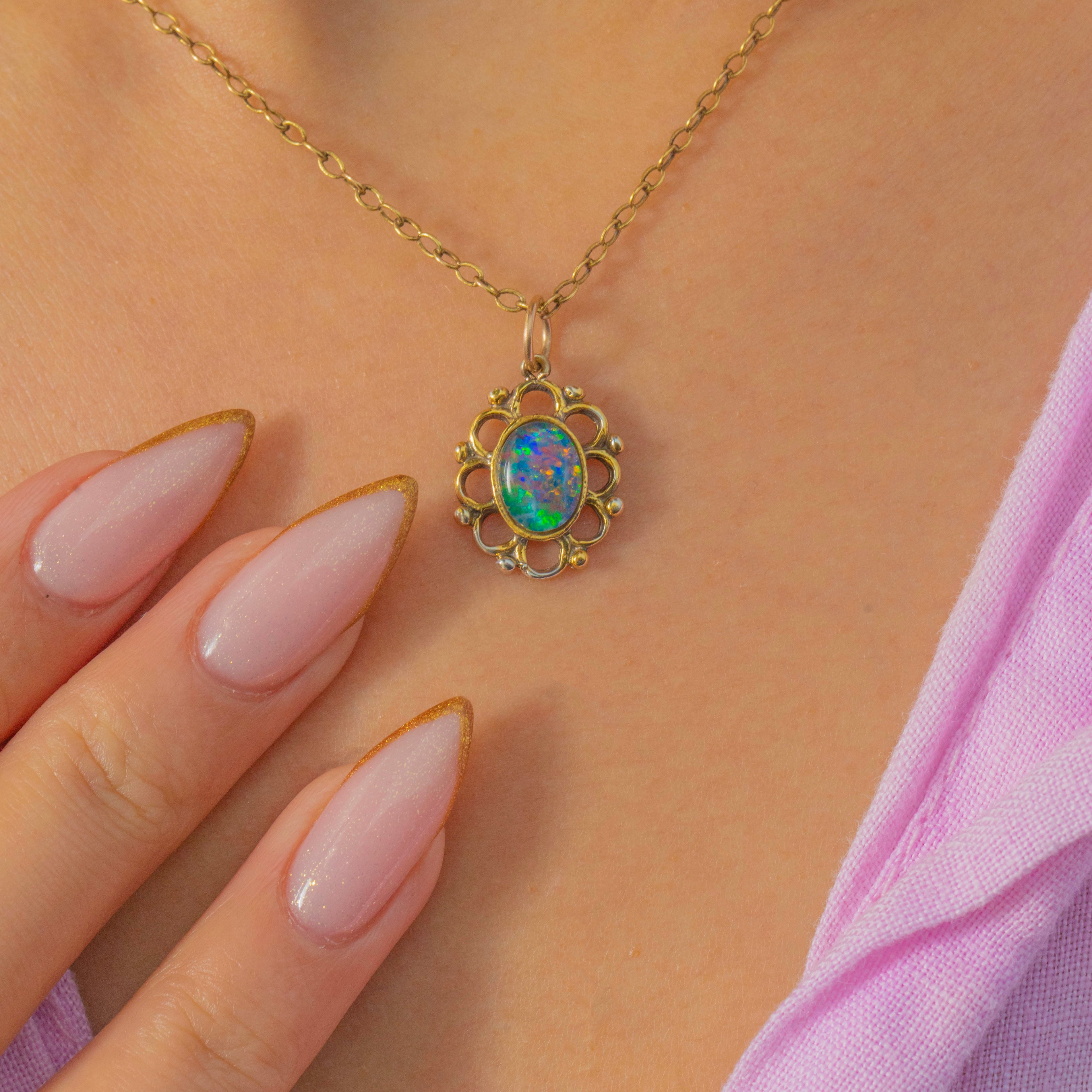 A colourful Vintage Opal doublet pendant crafted in rich 18ct Gold with an ornate, whimsical border. The Opal doublet displays vibrant flashes of green, blue and orange, shifting beautifully as it moves. Its sculptural Gold frame gives the piece a romantic, artistic feel, making it a gorgeous everyday talisman or layering charm.