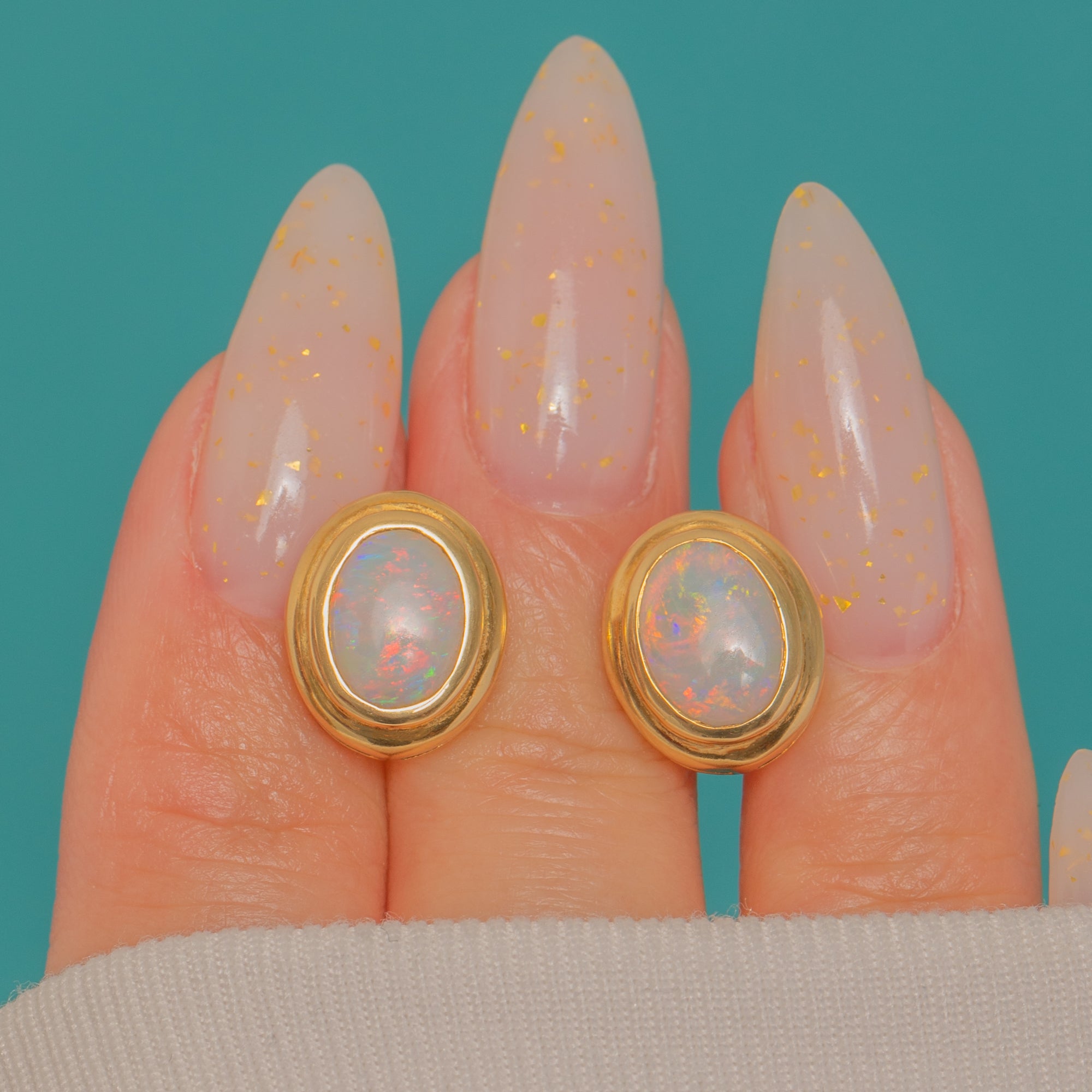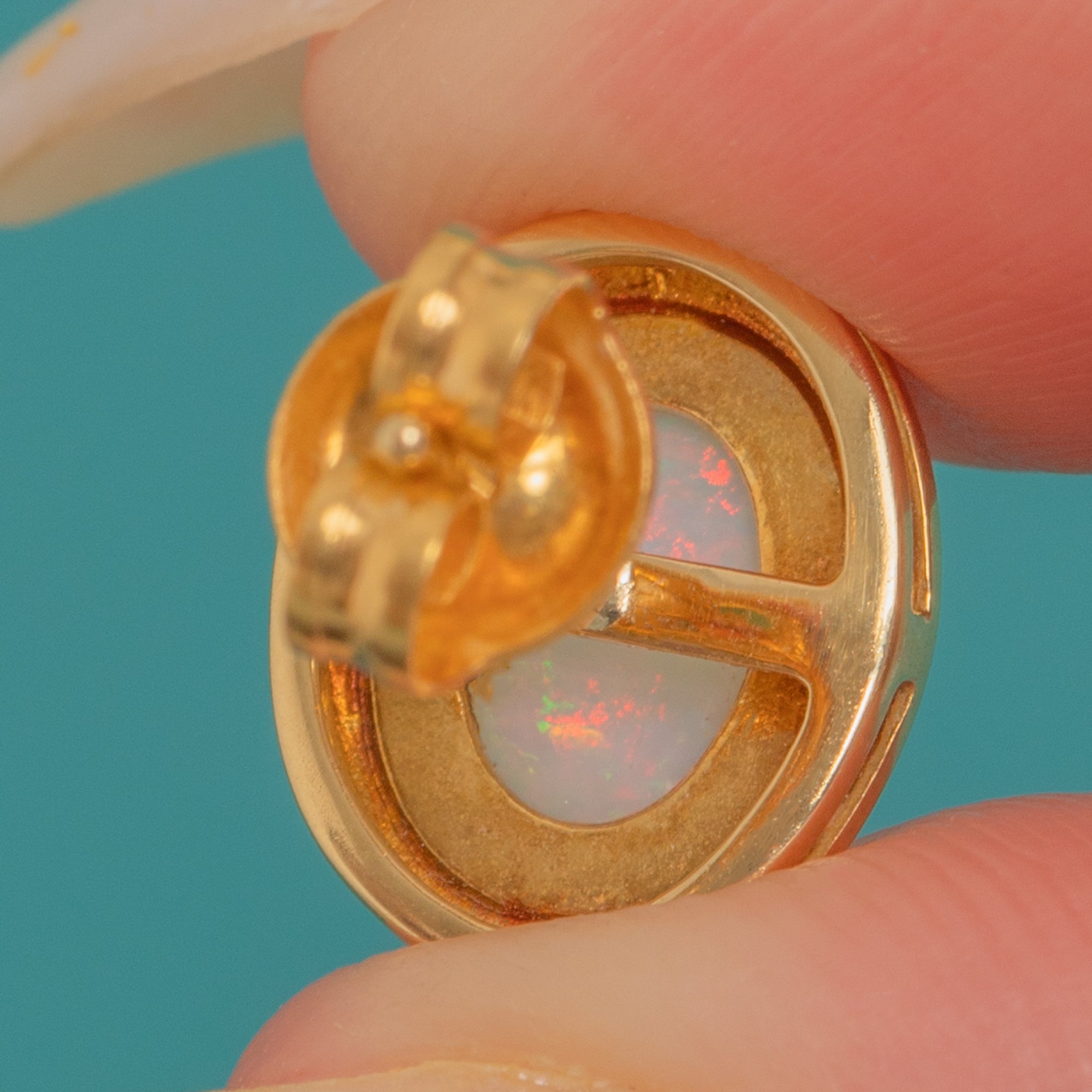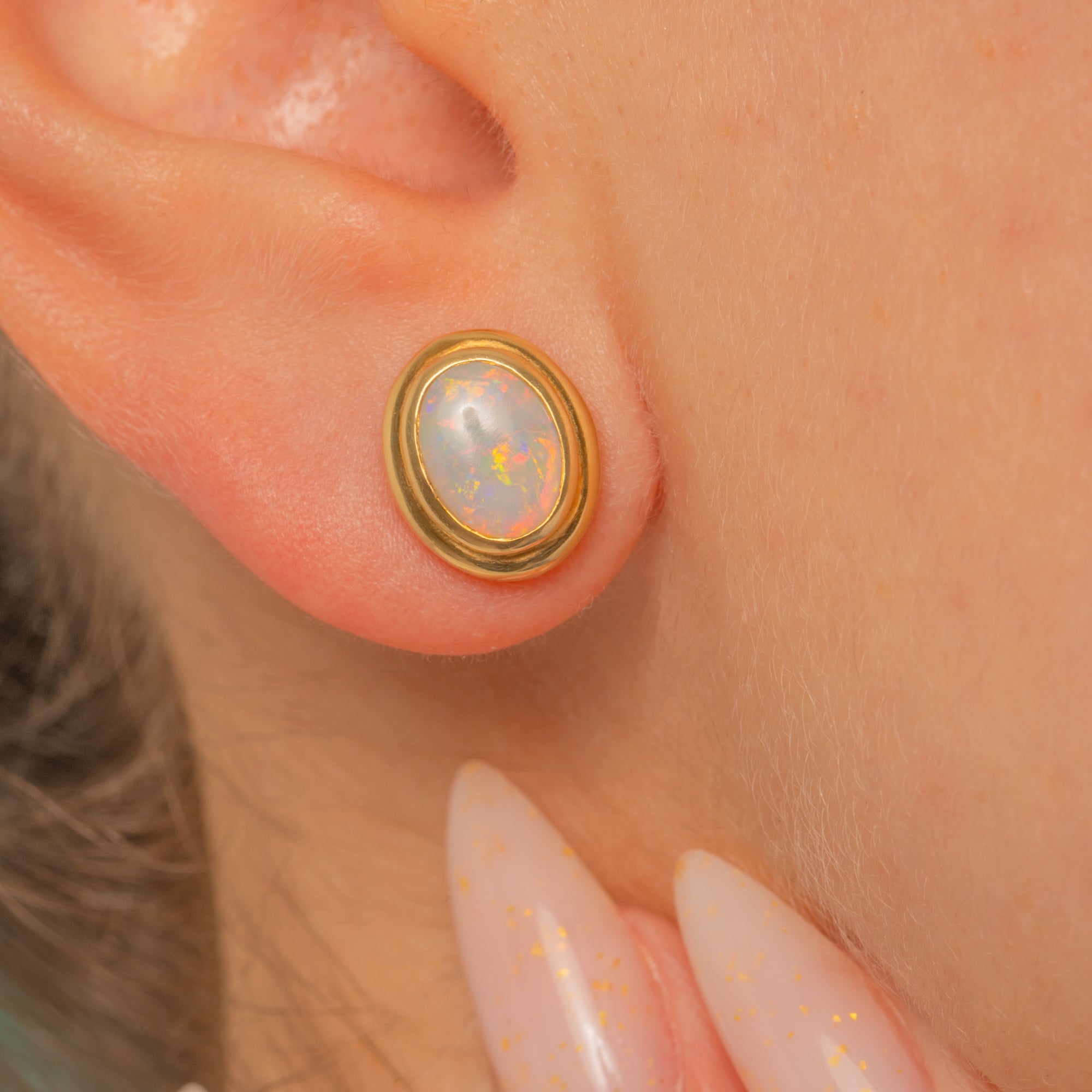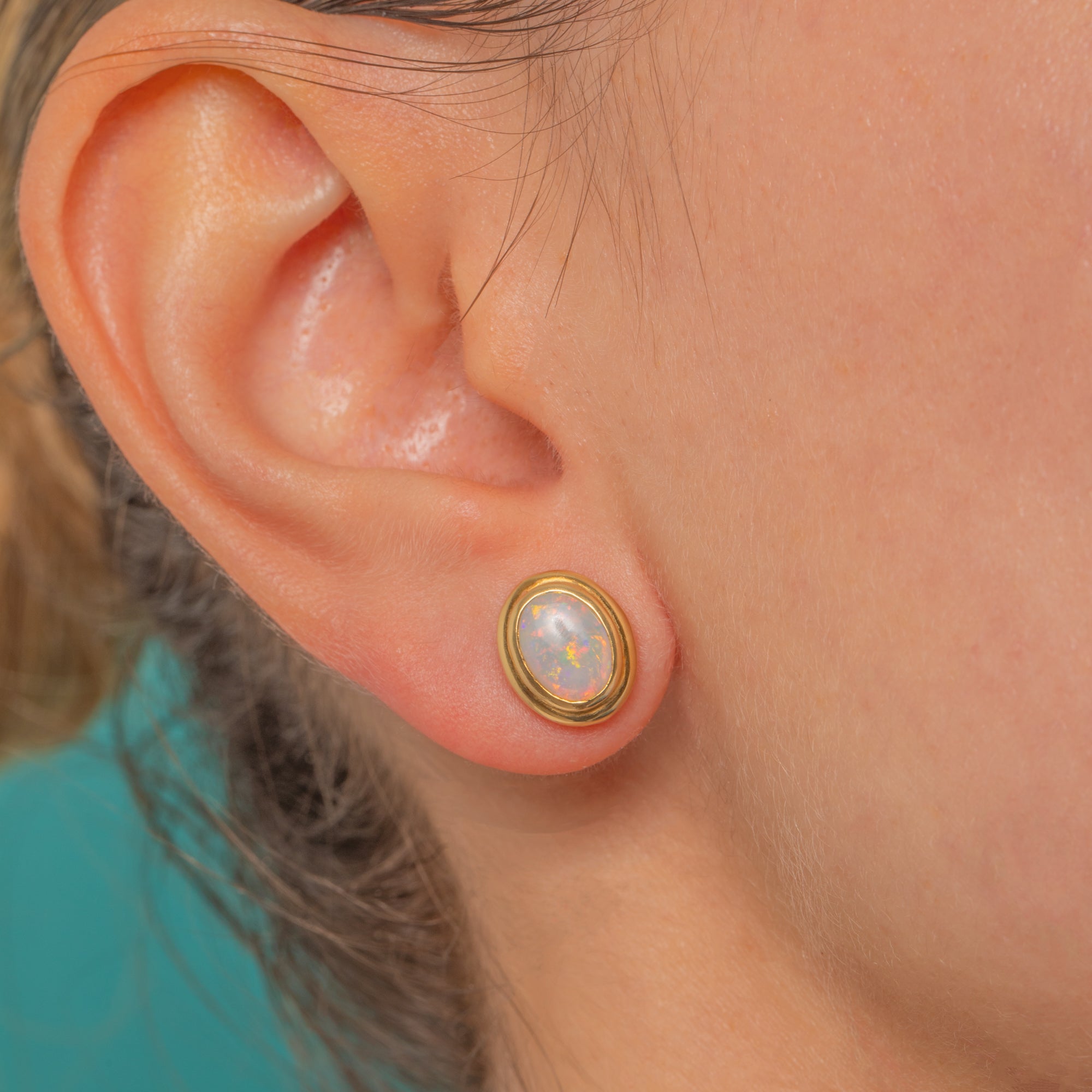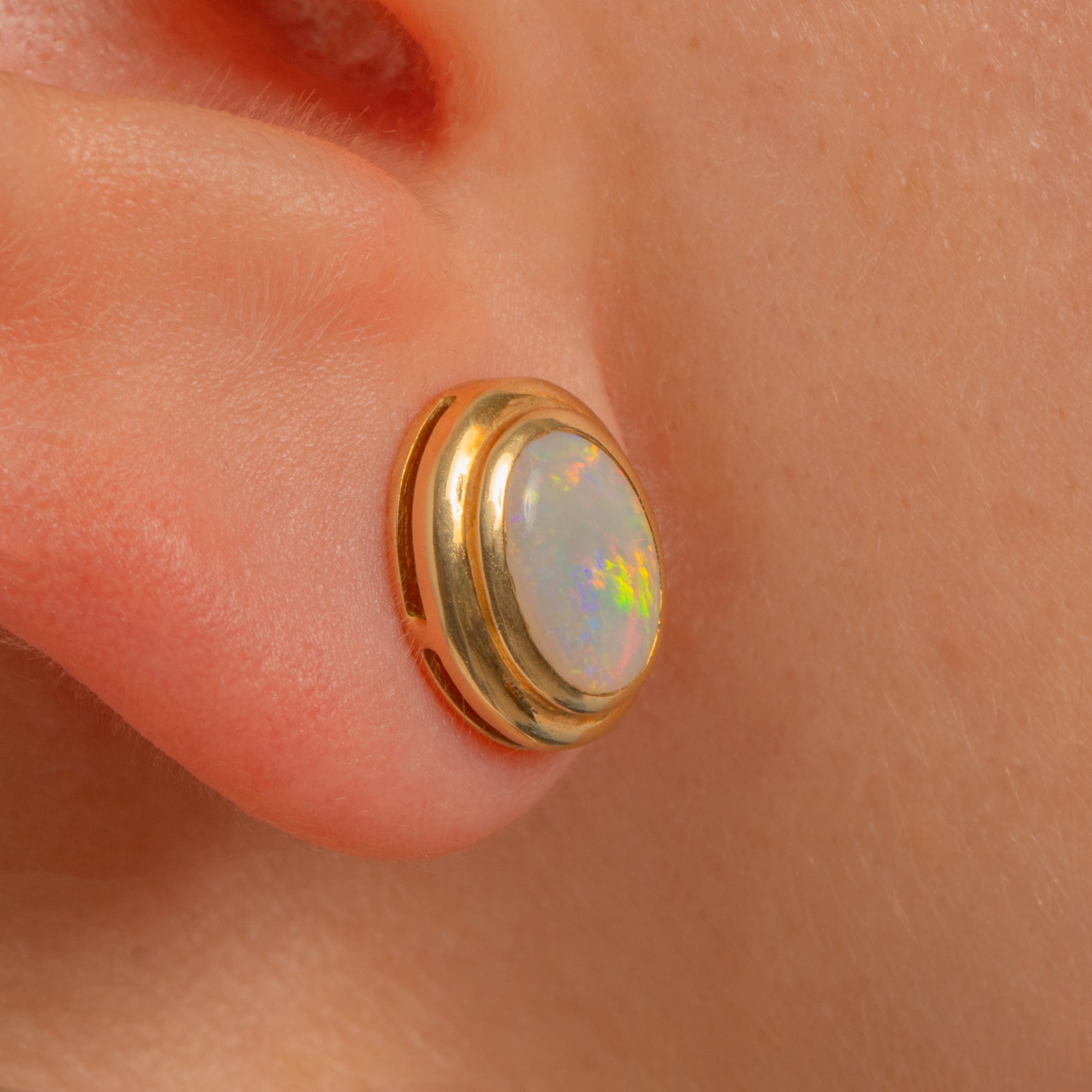 Understated and luminous, these Vintage Opal stud earrings are crafted in glowing 18ct Gold with a sleek rubover silhouette. Each oval cabochon Opal shimmers with lively play-of-colour—flashes of red, orange, green and blue—beautifully framed by a smooth stepped bezel for a refined, modernist finish.
