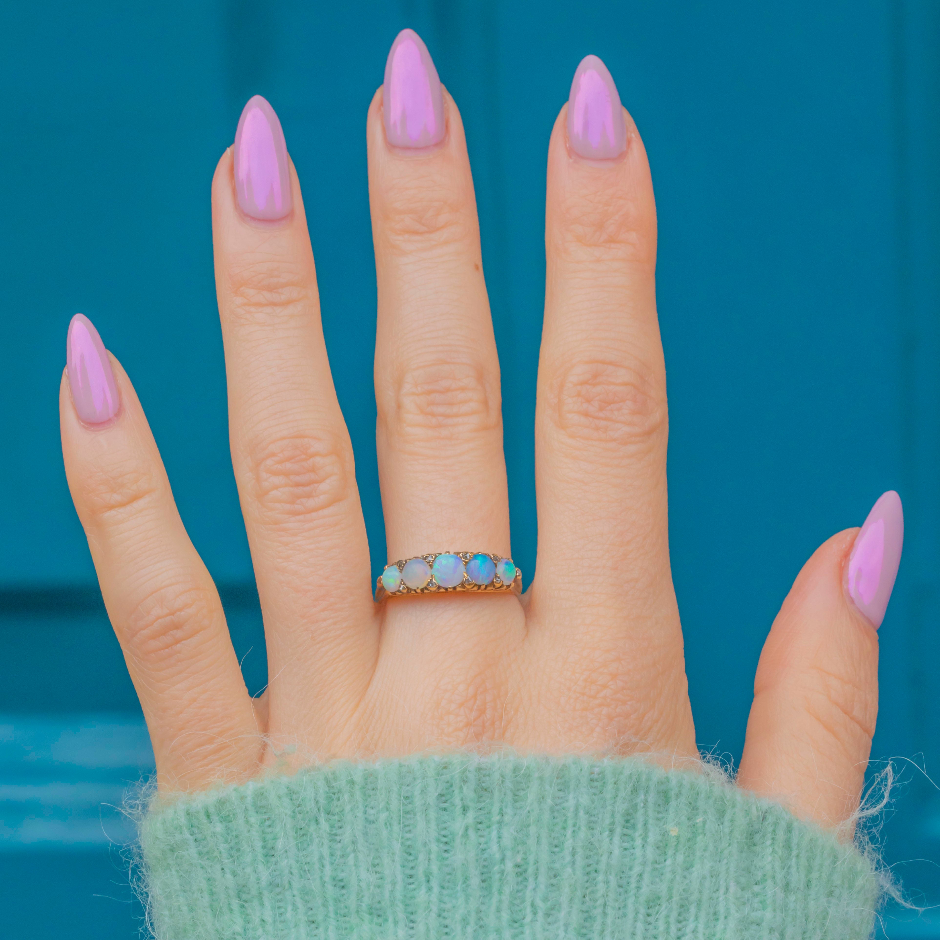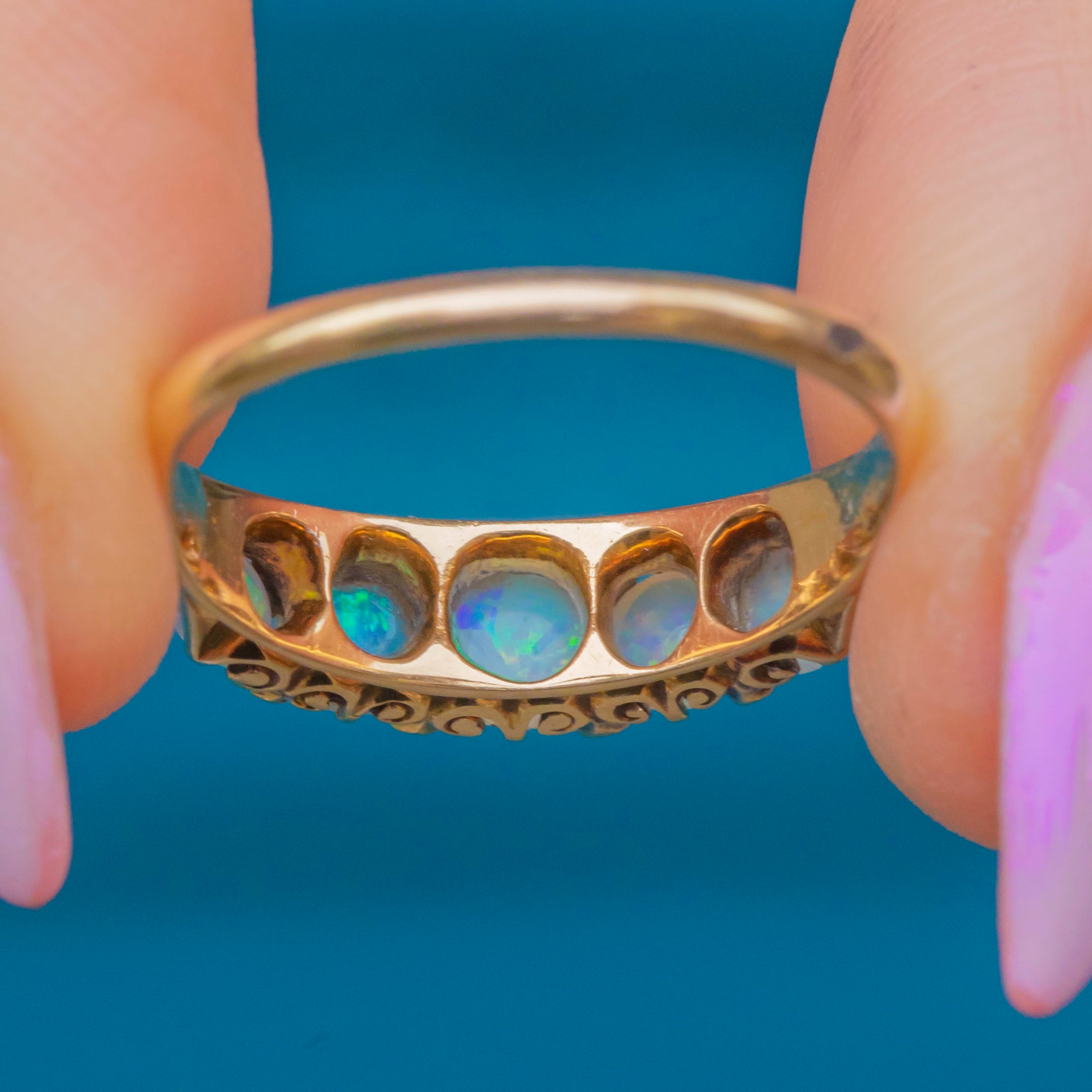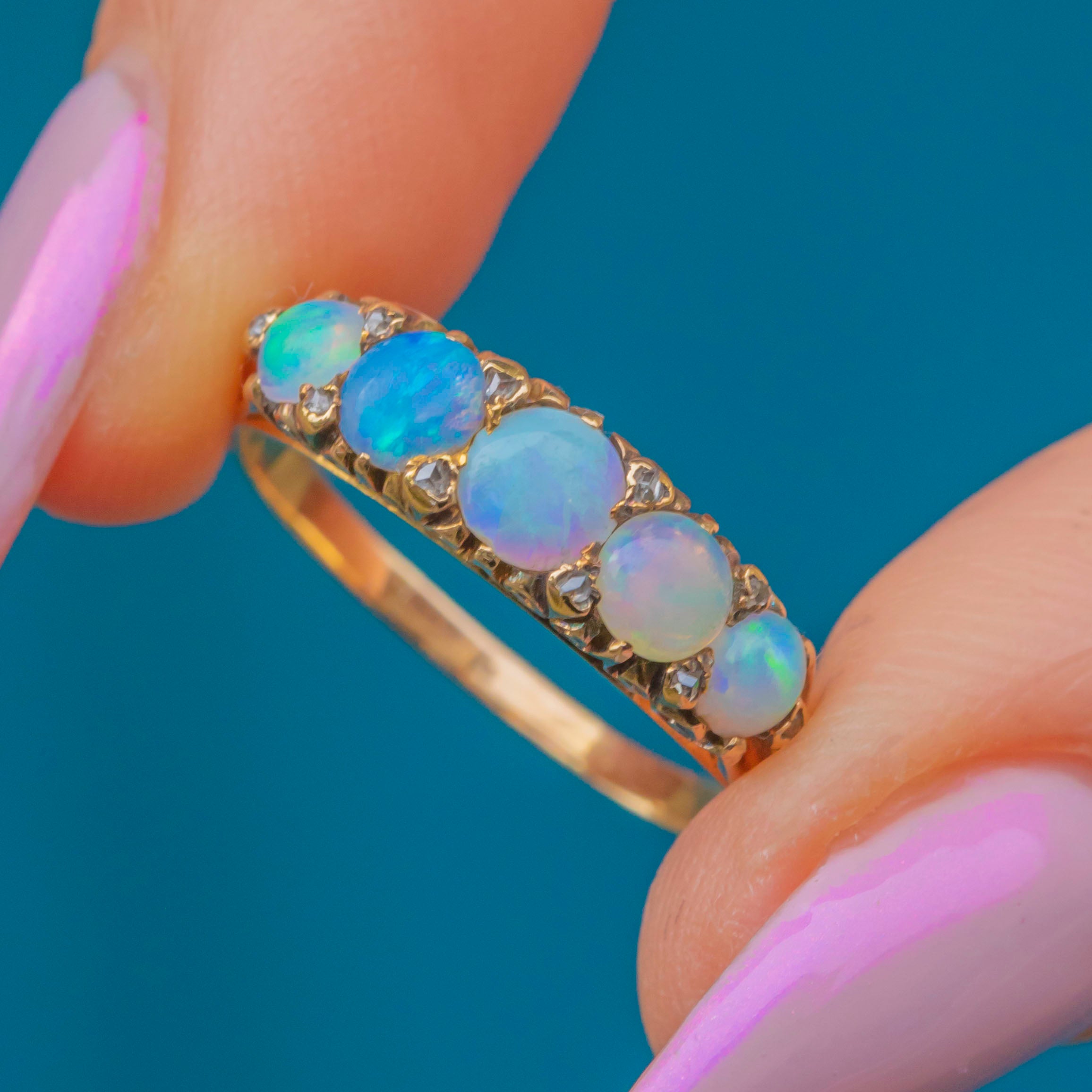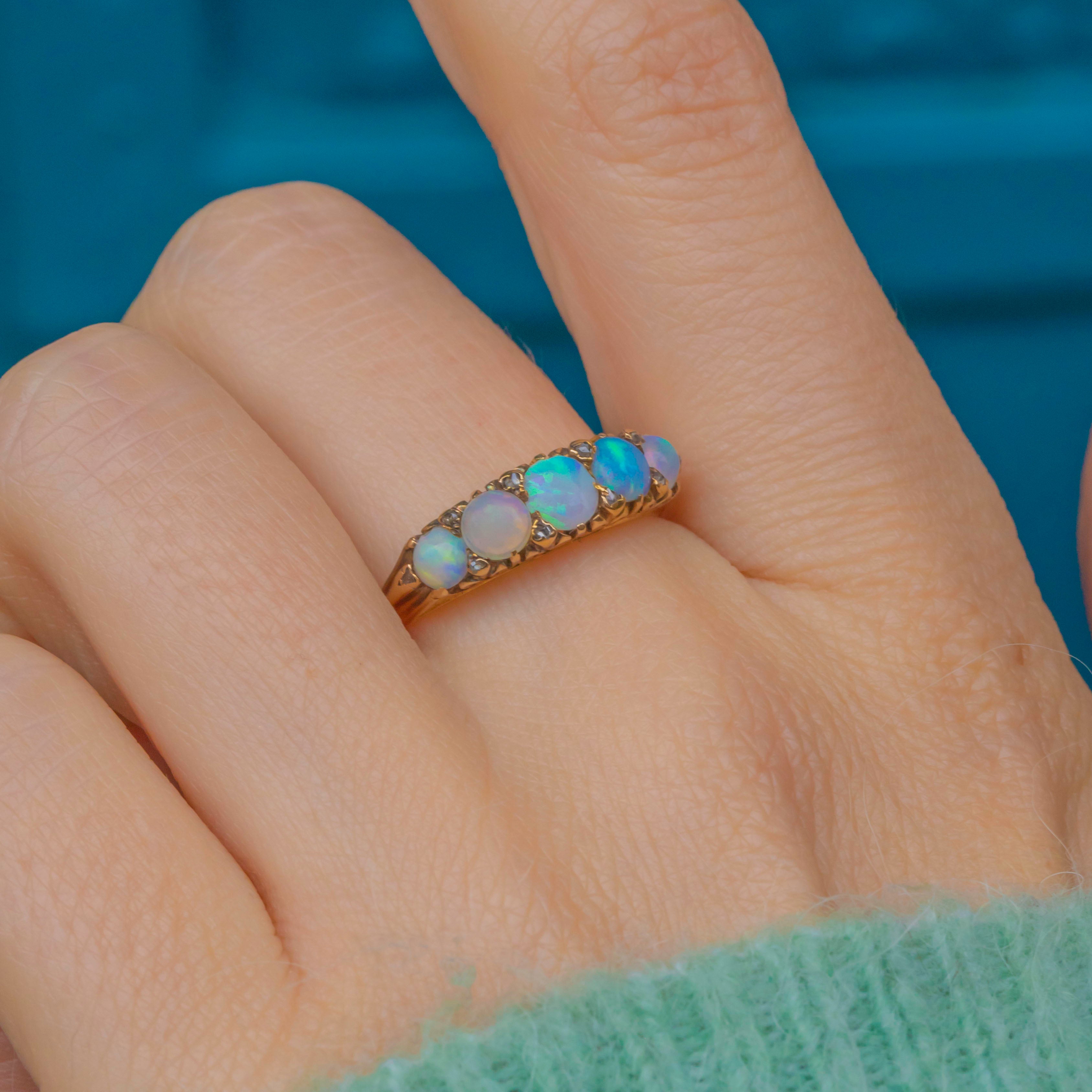 A captivating late Victorian five-stone ring set with glowing Opals that dance with flashes of green, blue and orange. Between each Opal are tiny Rose-cut Diamond spacers that add a delicate twinkle and highlight the play of colour beautifully.