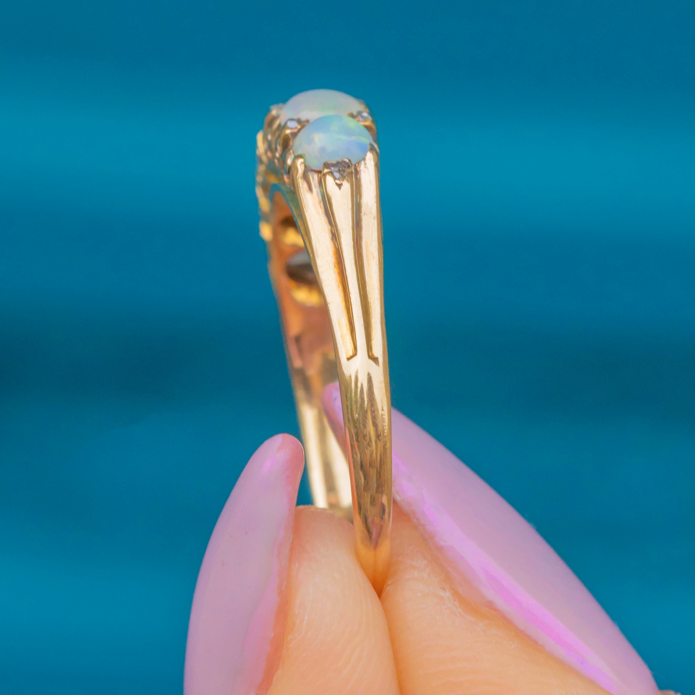 EXCELLENT: All Opals are vibrant and secure with no chips or abrasions. Diamonds are bright and intact. The 18ct Gold setting is well preserved with crisp detailing and minimal wear. A beautiful example of a classic Victorian Opal ring.