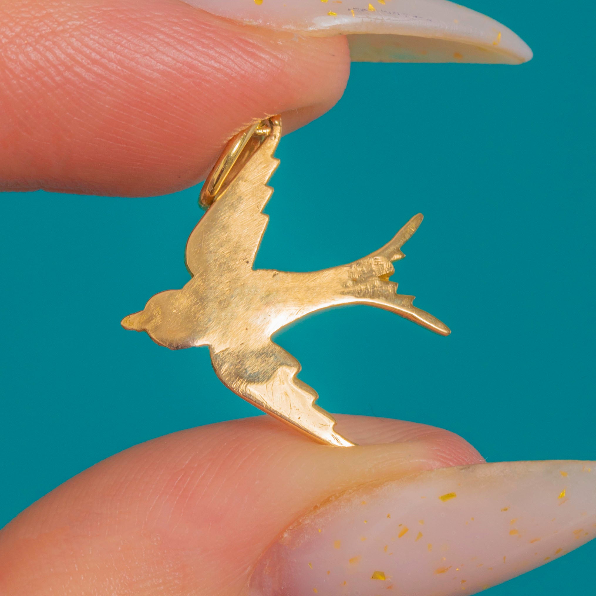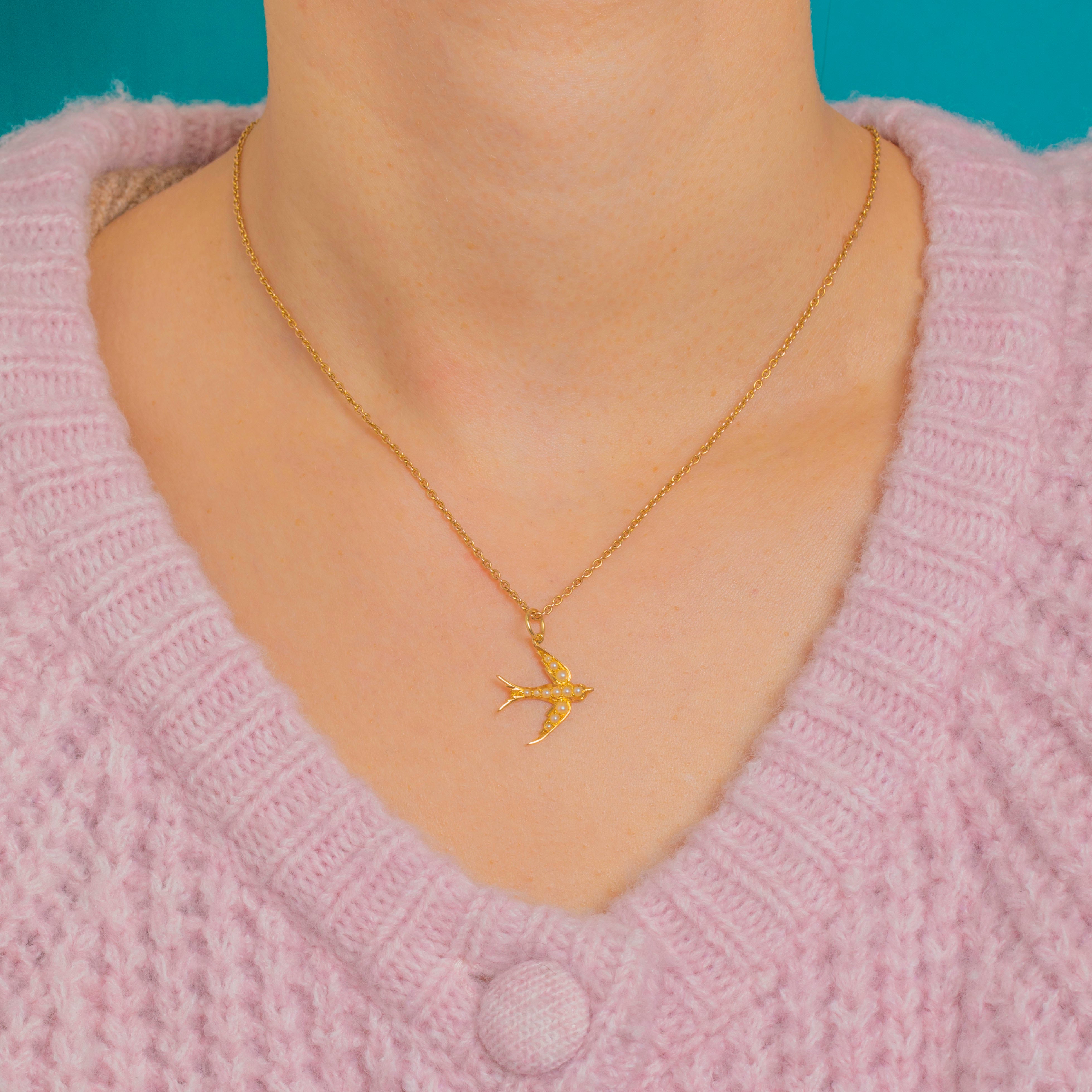 Petite and poetic, this 18ct Gold sparrow pendant is adorned with a delicate sweep of creamy Seed Pearls that trace the bird’s body and wing. The low-relief sculpting and polished finish catch the light beautifully, while the pearls add a soft, romantic glow.