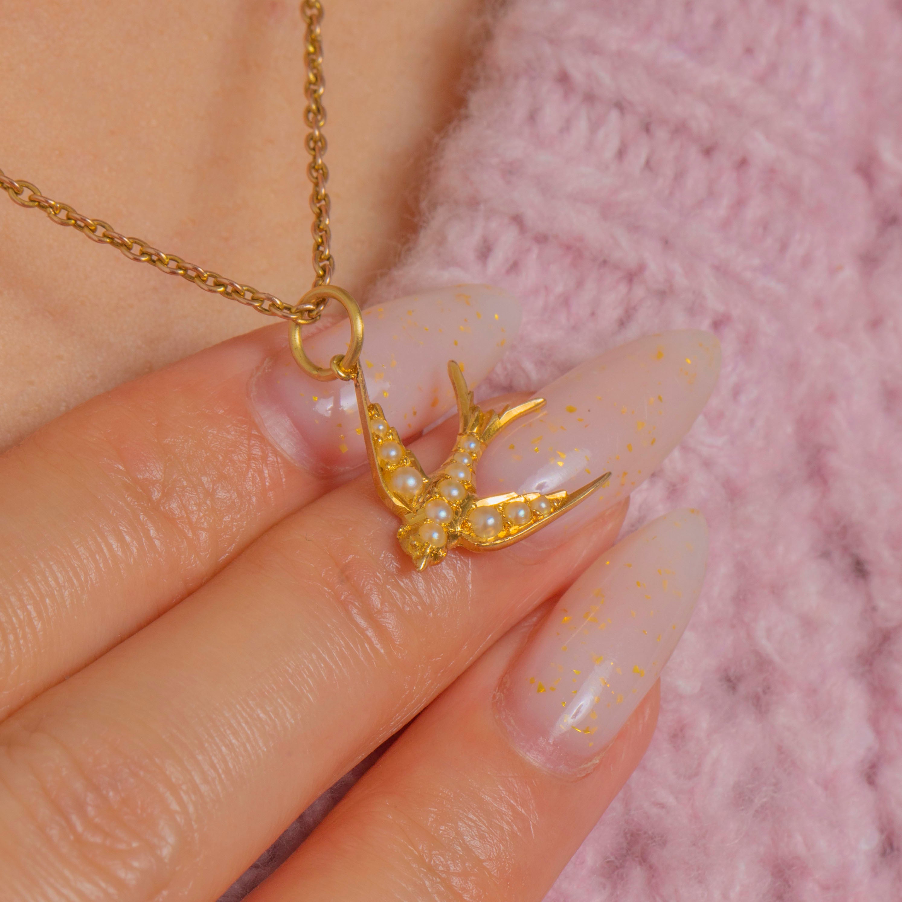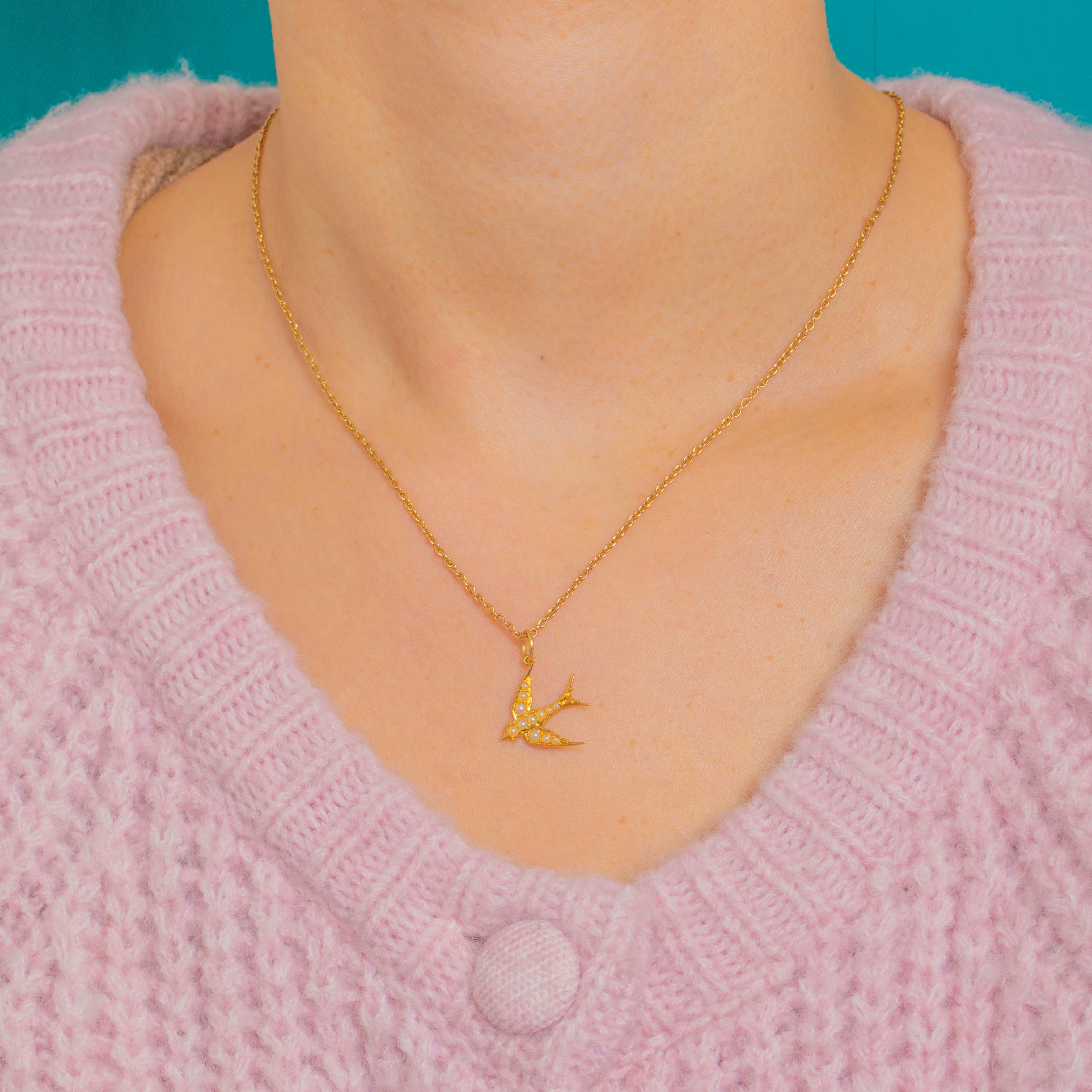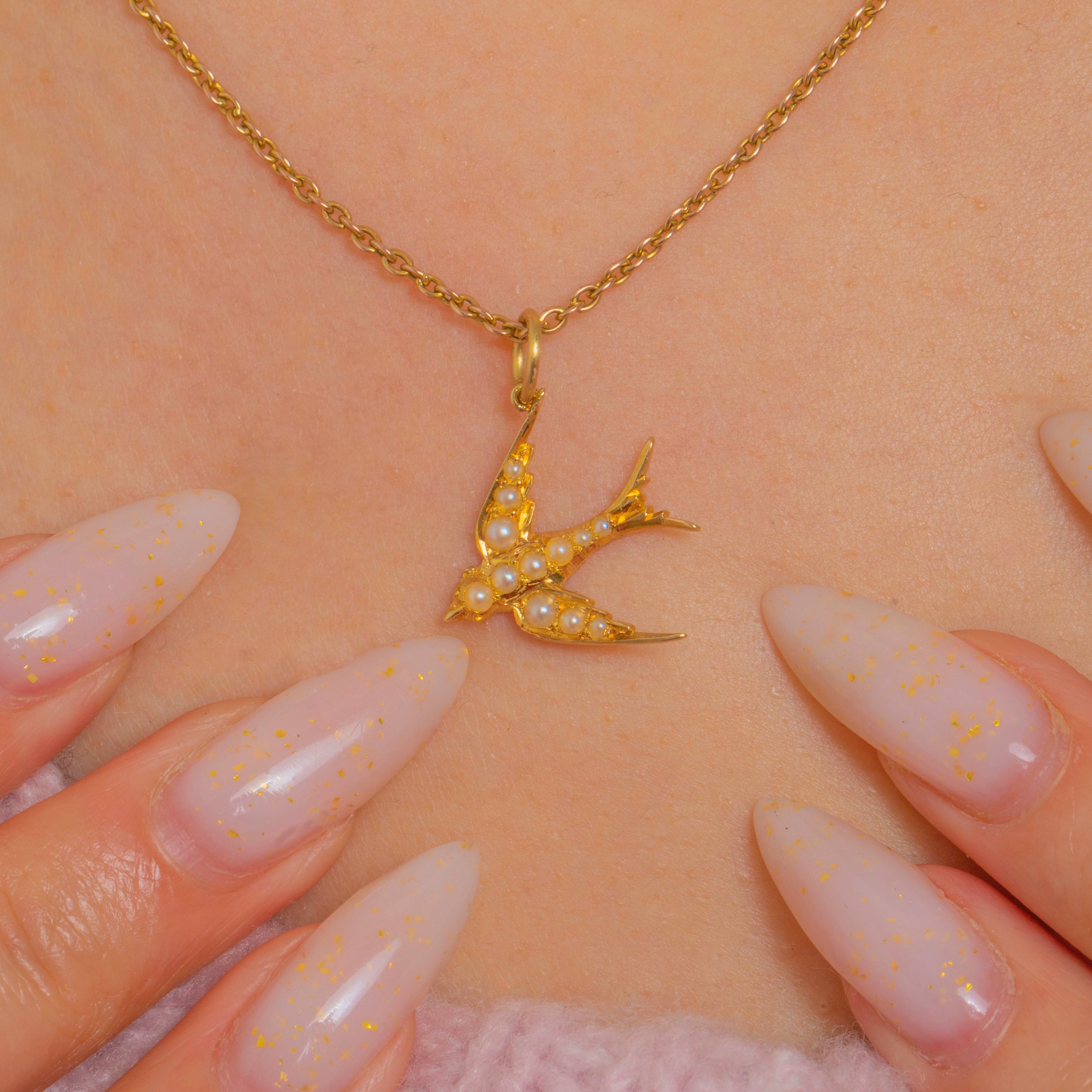 A darling Victorian 18ct Gold Sparrow charm, traced with a delicate row of luminous Seed Pearls across its wings and body. Petite and finely rendered, the bird’s graceful silhouette is elevated by the rich glow of high-carat Gold for a quietly luxurious finish.