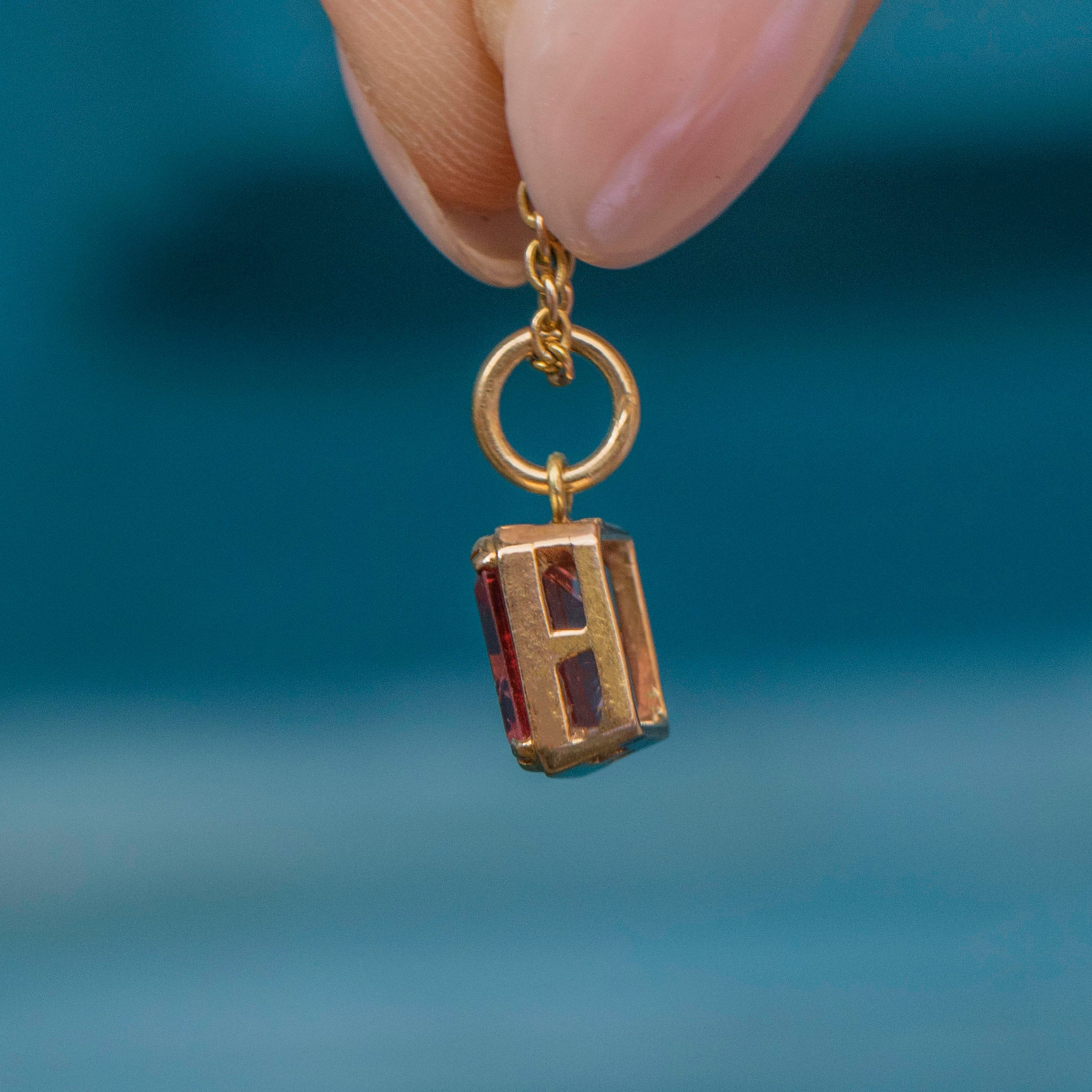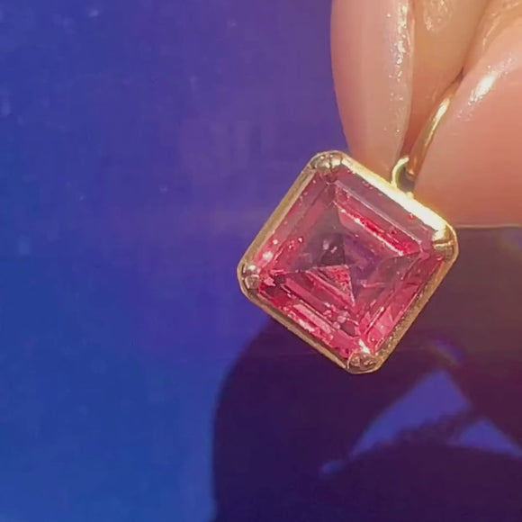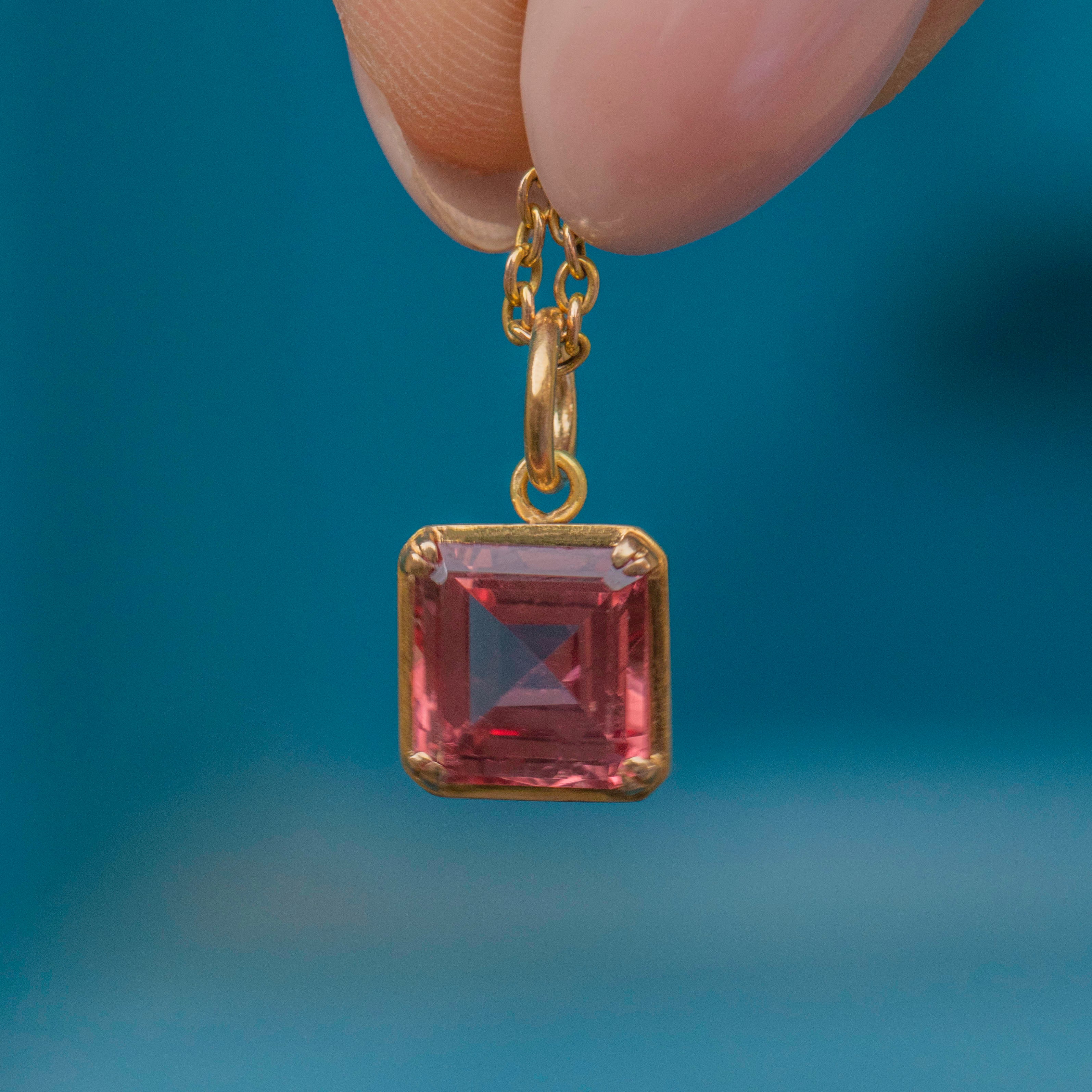 CONDITION. This 18ct Gold Rose Pink Synthetic Spinel pendant is in excellent condition. The Spinel exudes unique blush hues from her crisp facets with inclusions visible under close inspection. The Gold is brightly saturated and the setting holds the gemstones securely, with no dings or scuffs to note. With a generously sized soldered jump ring, you can suspend this eye-catching Art Deco charm from a chain with ease!
