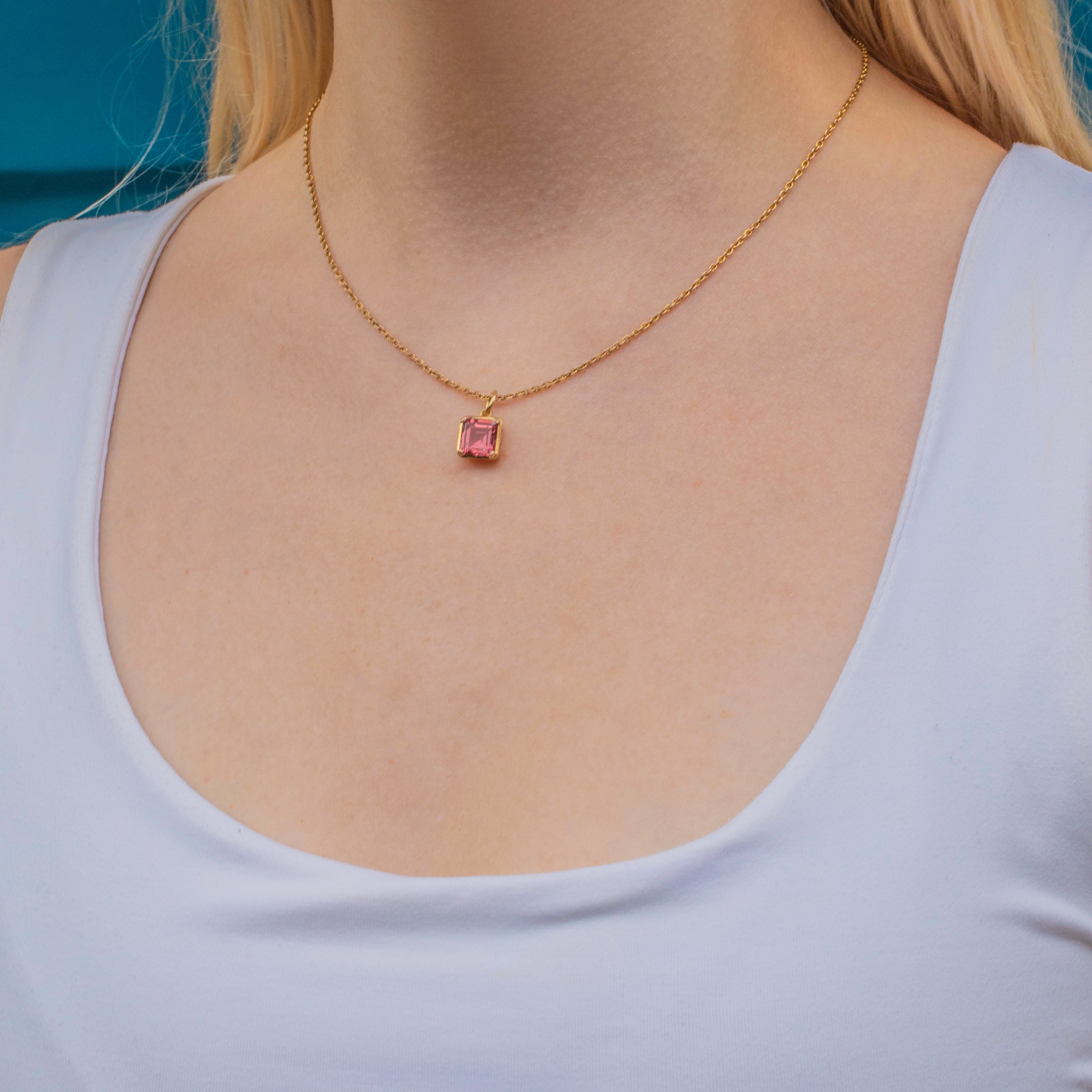 Welcome this subtle, dainty 18ct Gold Rose Pink Synthetic Spinel Pendant into your jewellery collection and she's bound to bring you years of wearing pleasure!