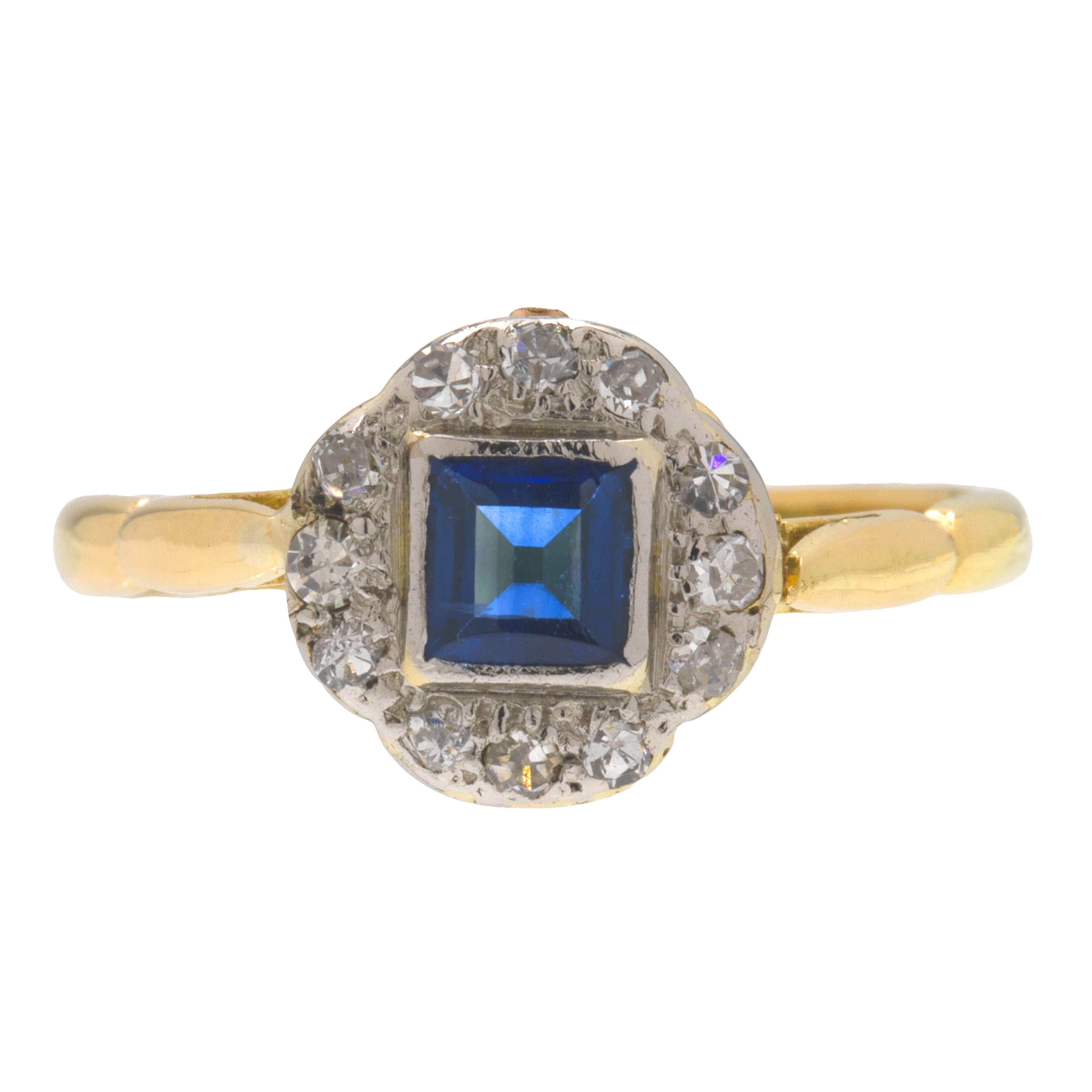 With dazzling Diamonds set in a soft Diamond form surrounding the Sapphire, this Vintage Sapphire ring has a definite Art Deco feel about her. With a smooth 18ct Gold band, this Gold Diamond ring glides onto your hand a dream; she might even be your perfect pick for a unique engagement ring!