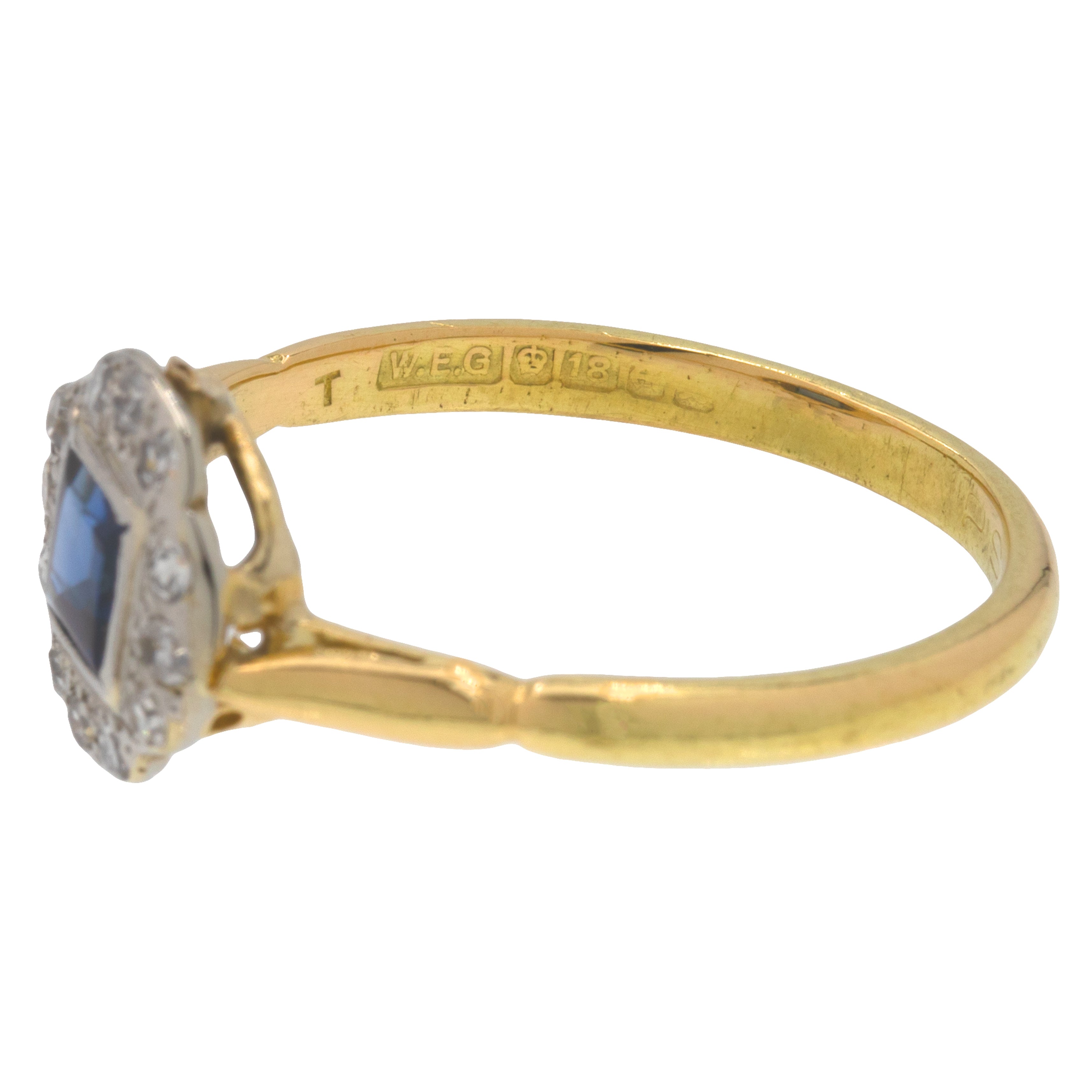 This 18ct Gold Sapphire Diamond cluster ring will make a classy addition to any Vintage jewellery collection. A square-cut Diamond sits poised at her centre, with deep midnight blue hues dancing from facet to facet.