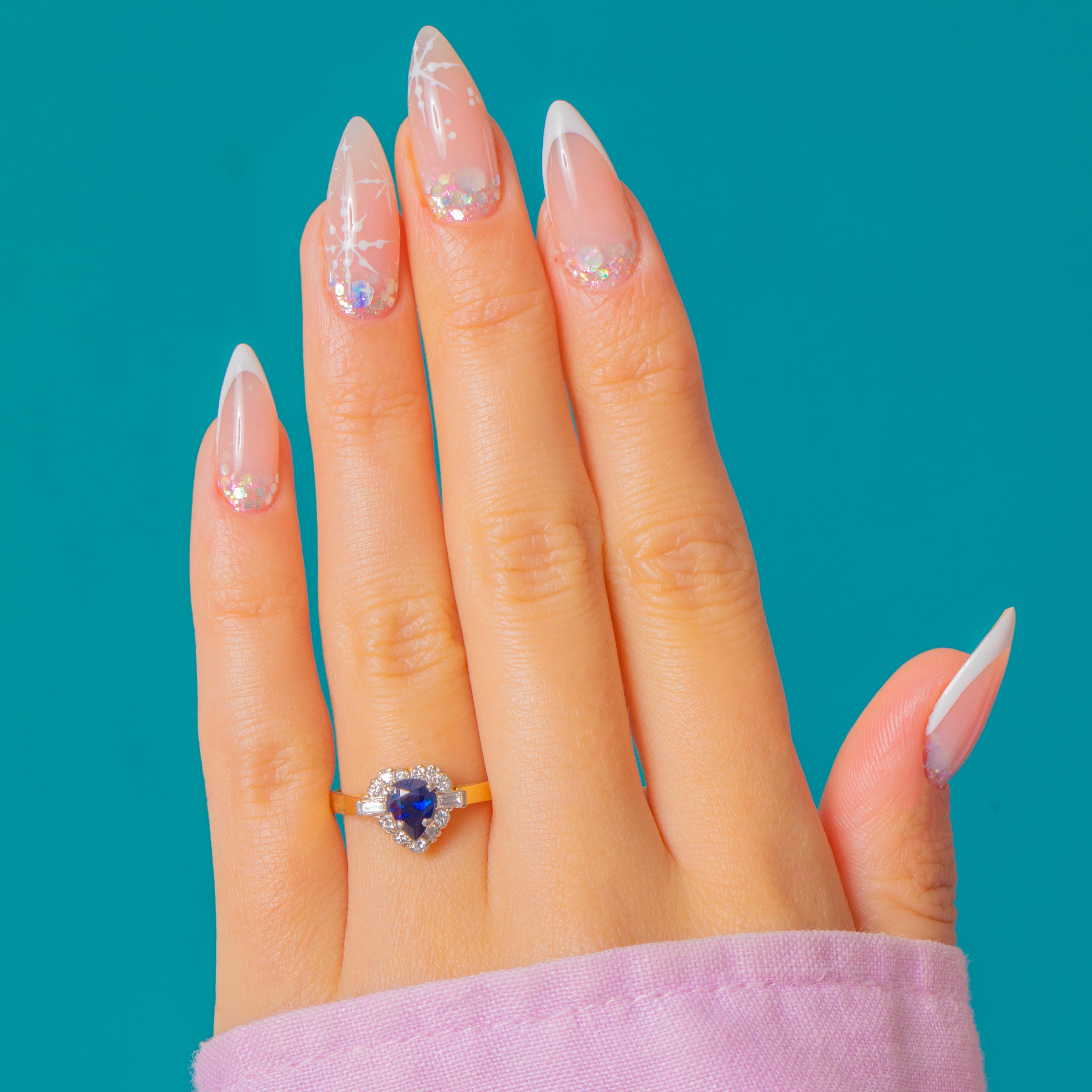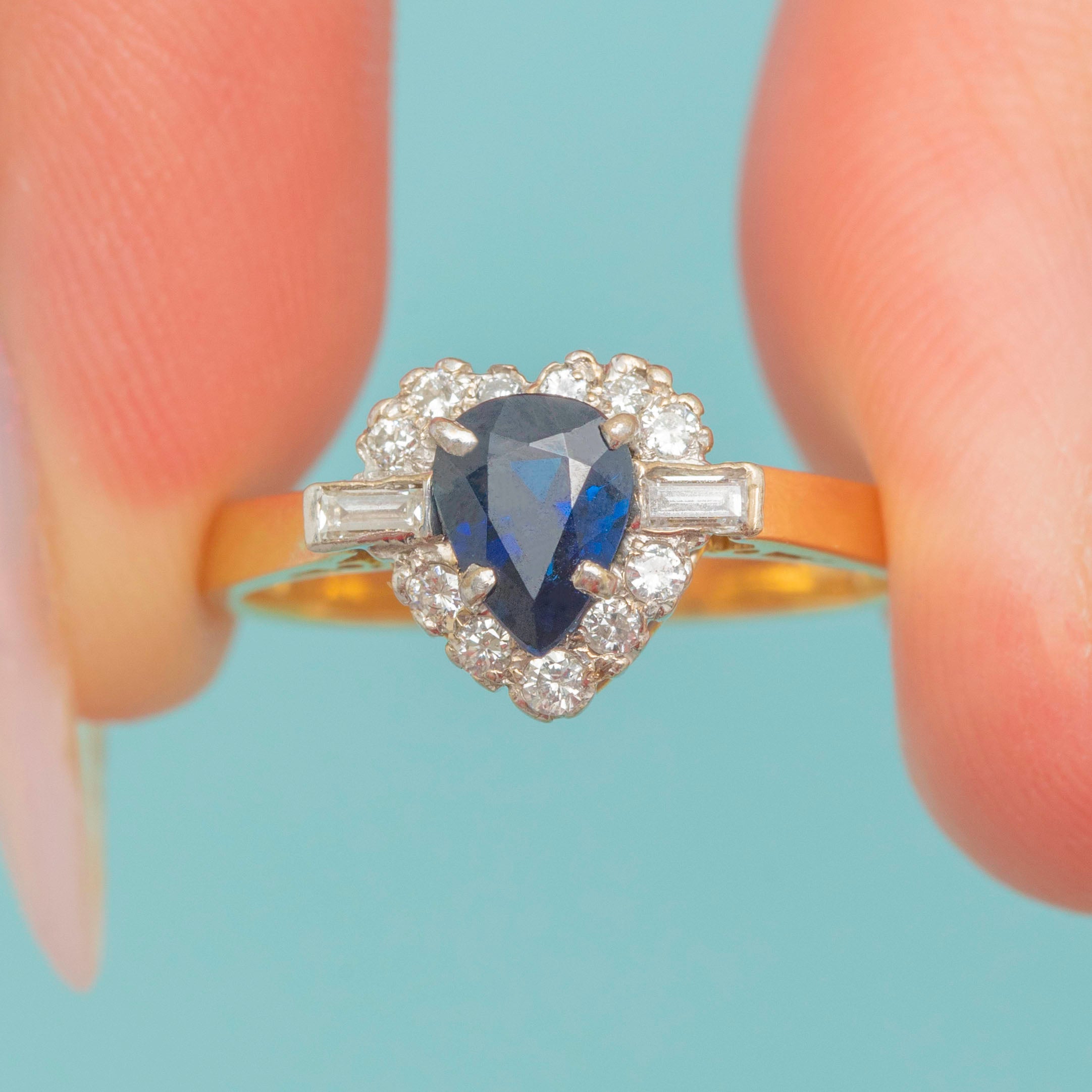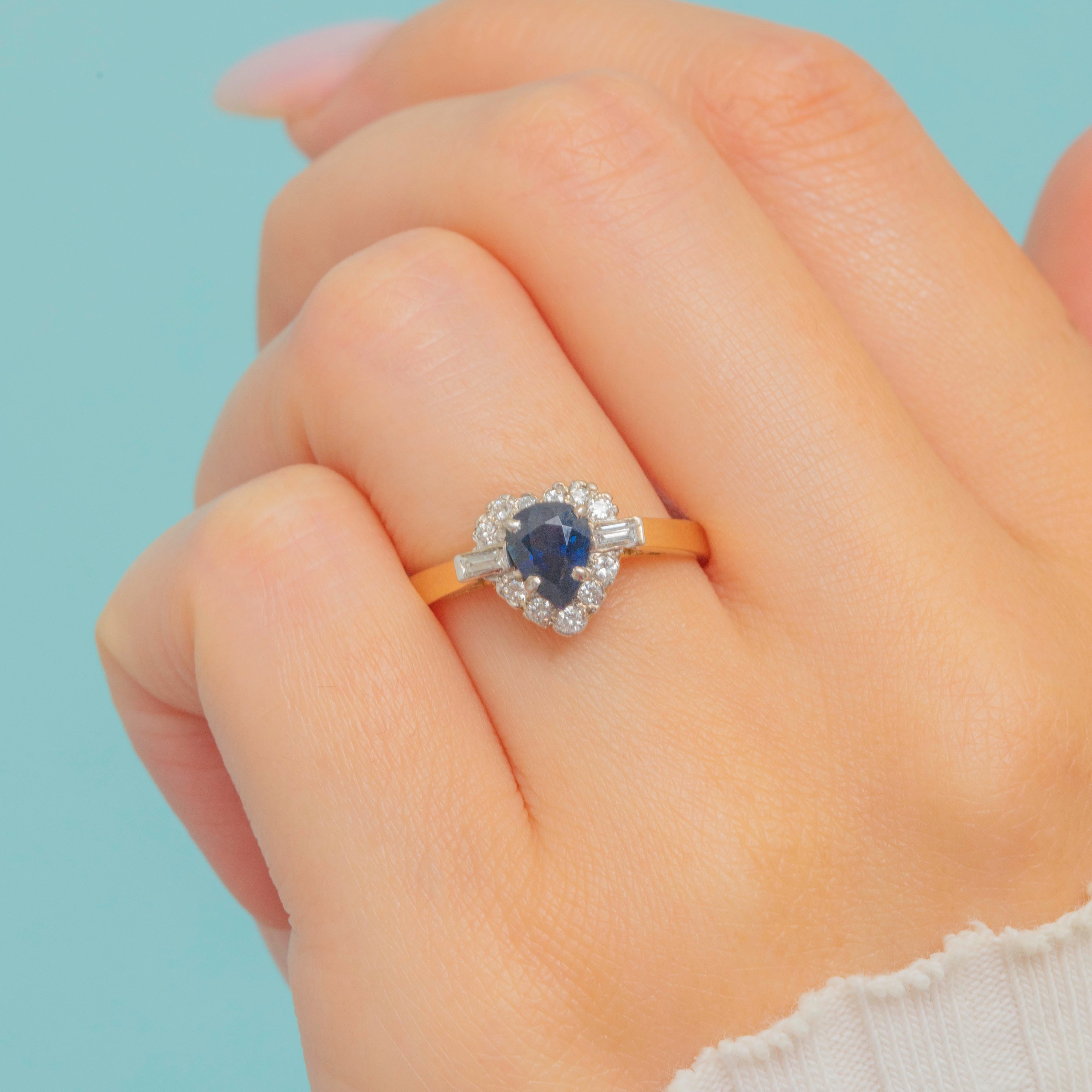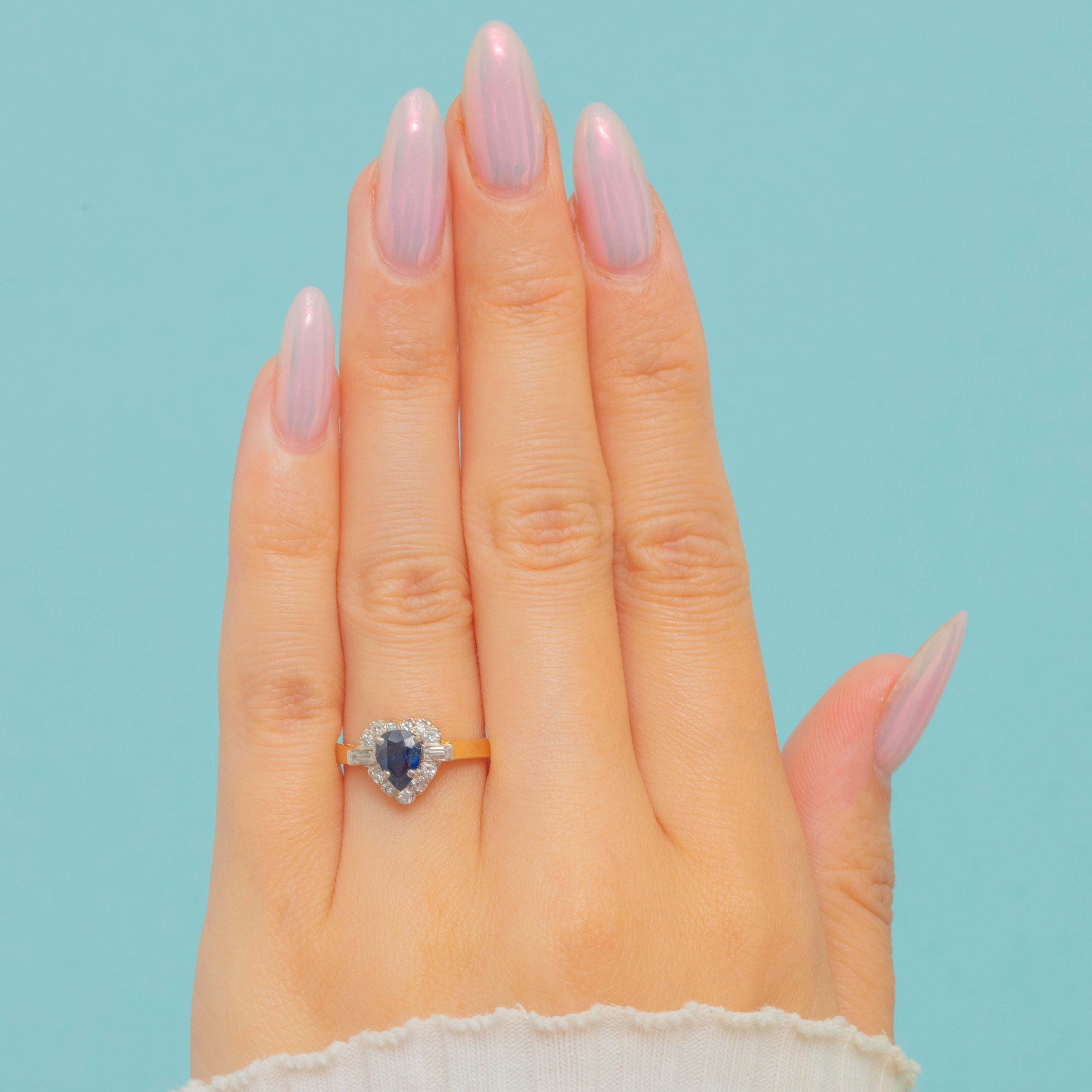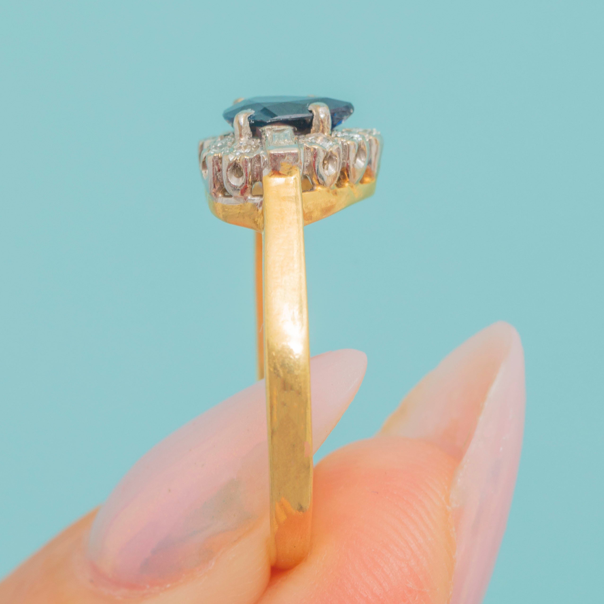 A charming 18ct Gold vintage pear cut natural Sapphire ring, haloed by a cluster of scintillating bright Diamonds akin to a starry night sky!