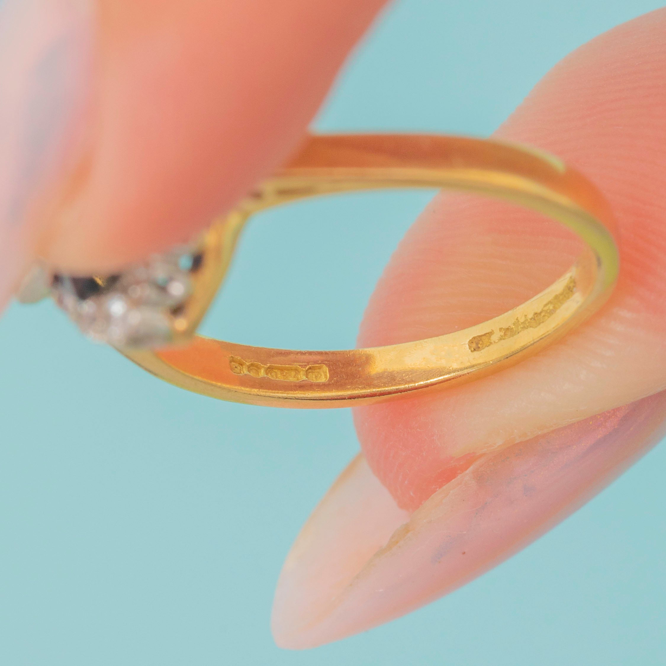 EXCELLENT: Each gemstone is bright and sparkly and is secure in its settings. The 18ct Gold band is bright and buttery with minimal signs of wear. With the glossy band providing comfortable wear, this vintage Sapphire ring can be worn with confidence!