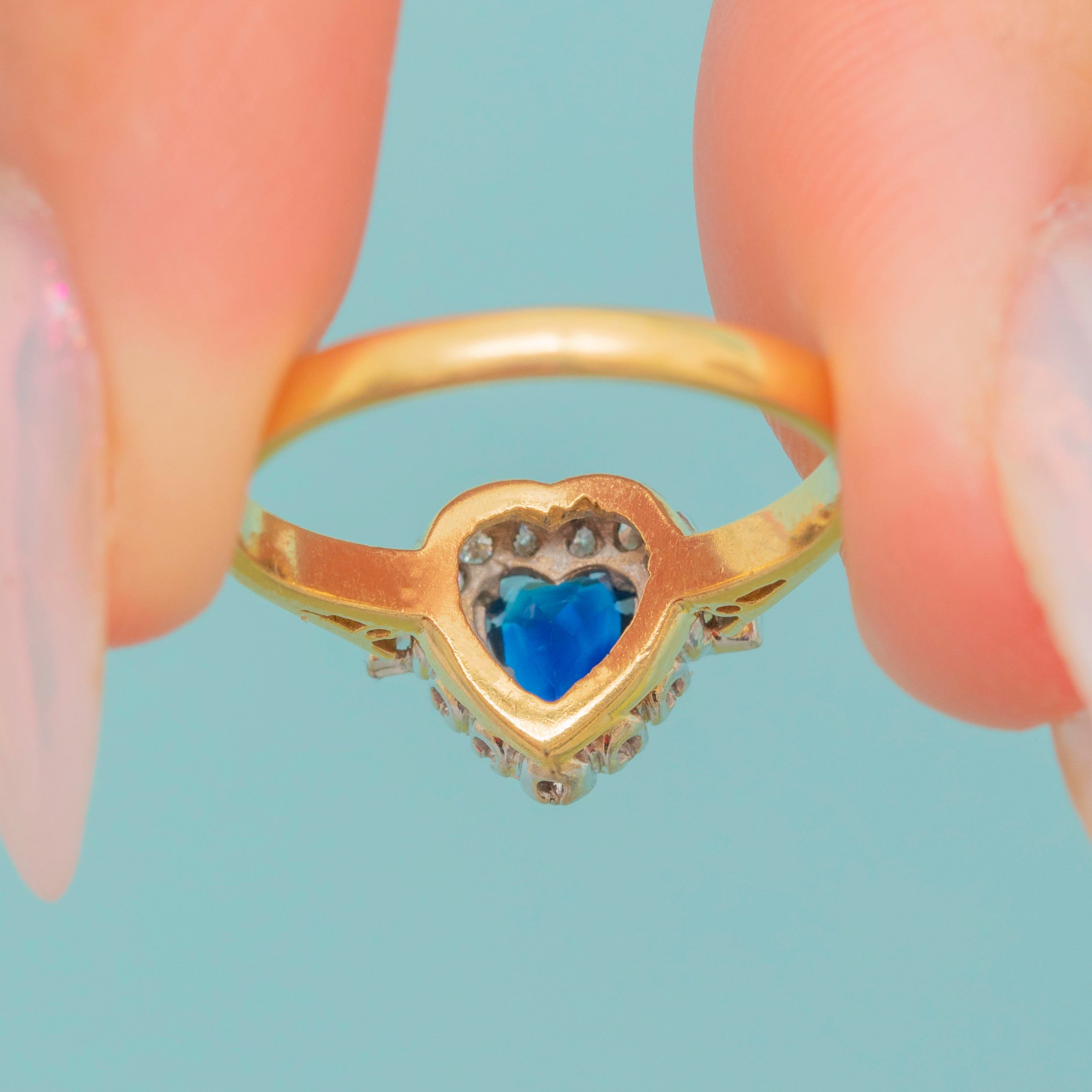 The royal blue Sapphire has been faceted wonderfully, hugged by Platinum claws and resting elegantly on a buttery 18ct Gold band. Crafted into an adorable romantic heart shape, this vintage Sapphire and Diamond ring would make the perfect choice for a unique engagement ring!