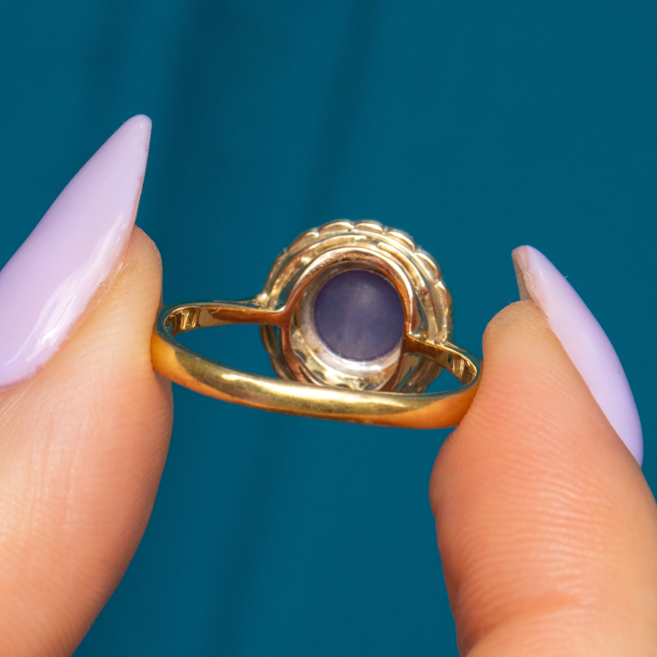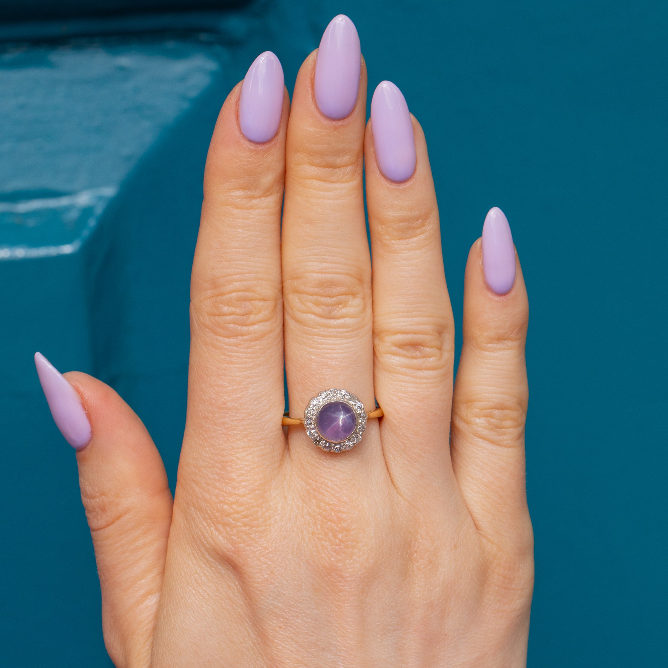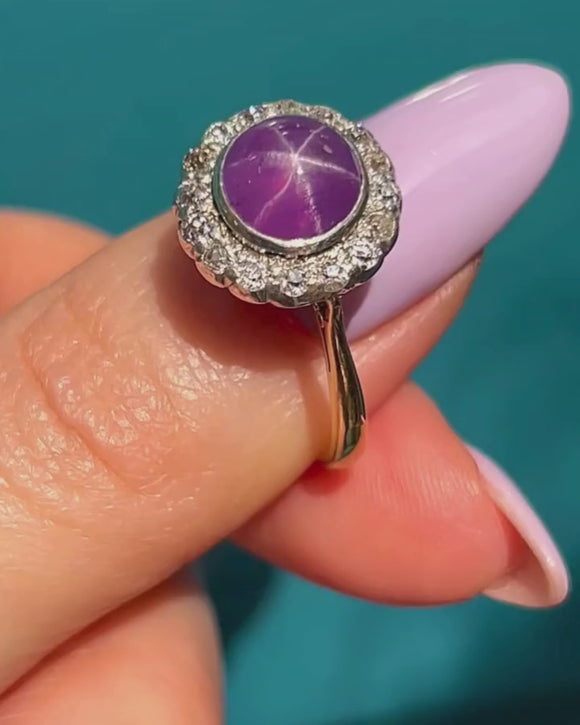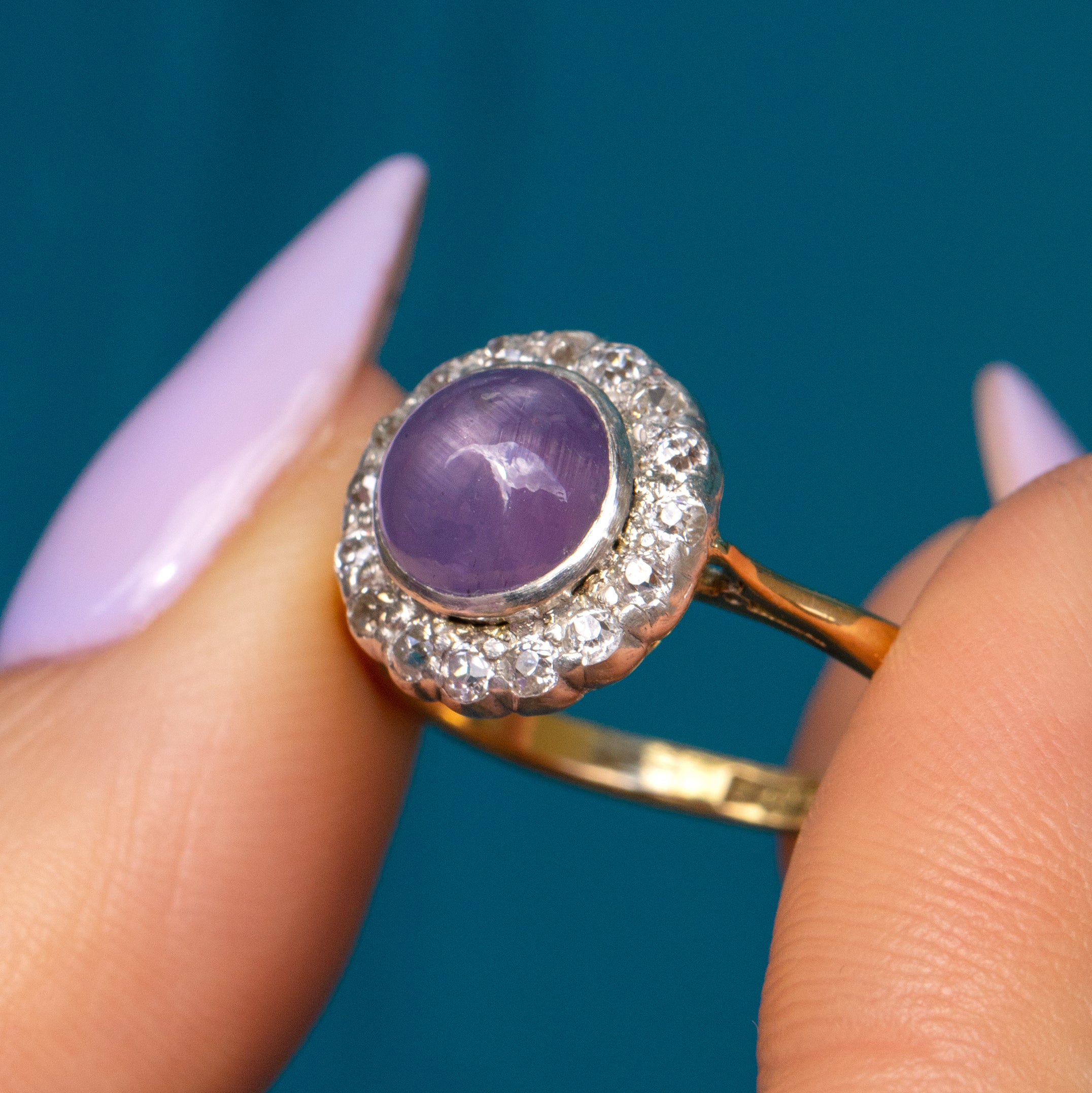 We are pleased to introduce this exquisite Victorian 18ct Gold star Ruby cabochon Diamond cluster ring, a timeless masterpiece crafted to captivate your attention! Nestled within a lustrous Golden embrace, the lavender-hued 3.00ct star Ruby cabochon is surrounded by a halo of scintillating Diamonds creating a truly spectacular piece.