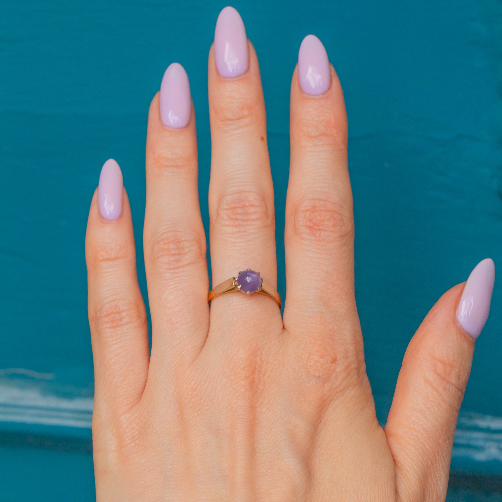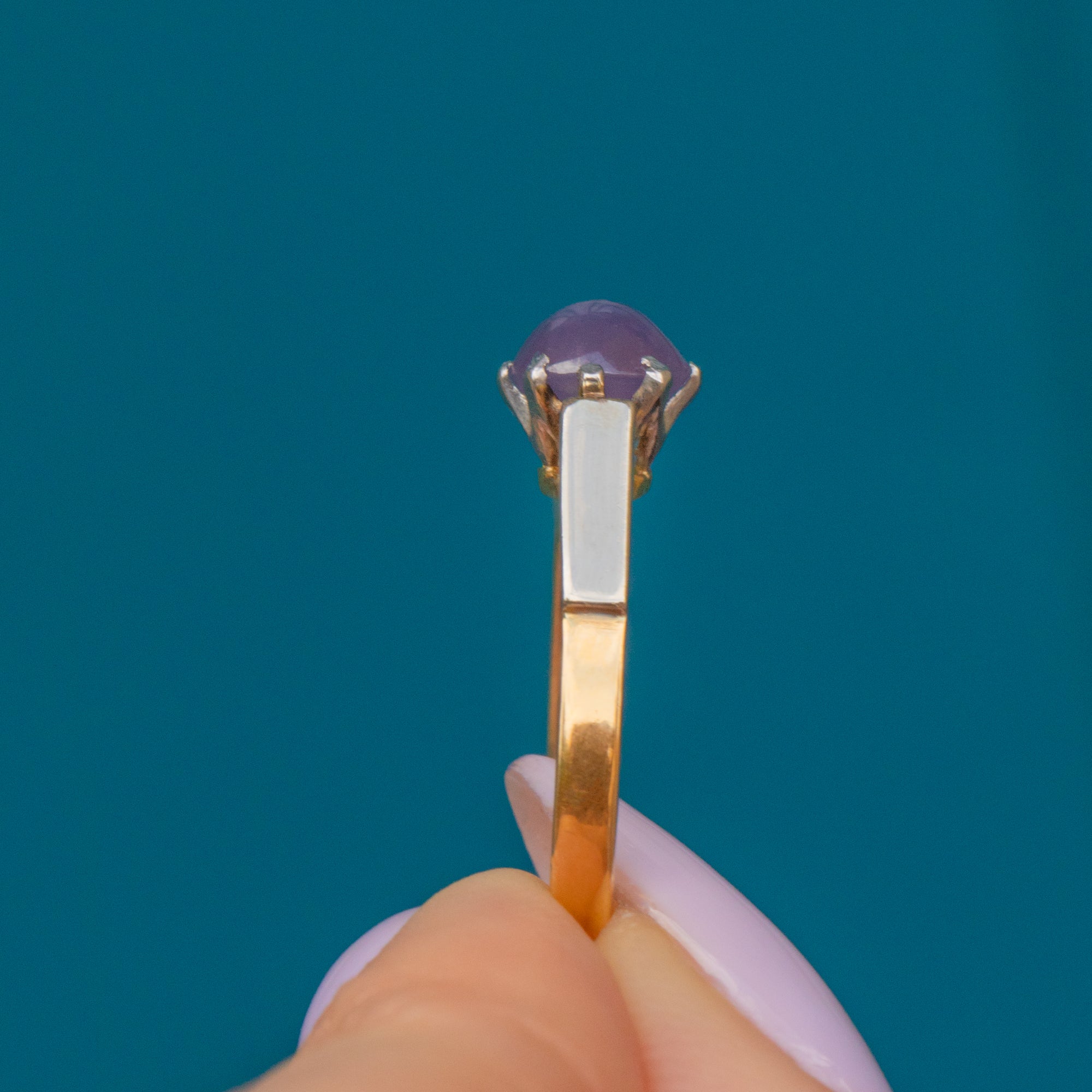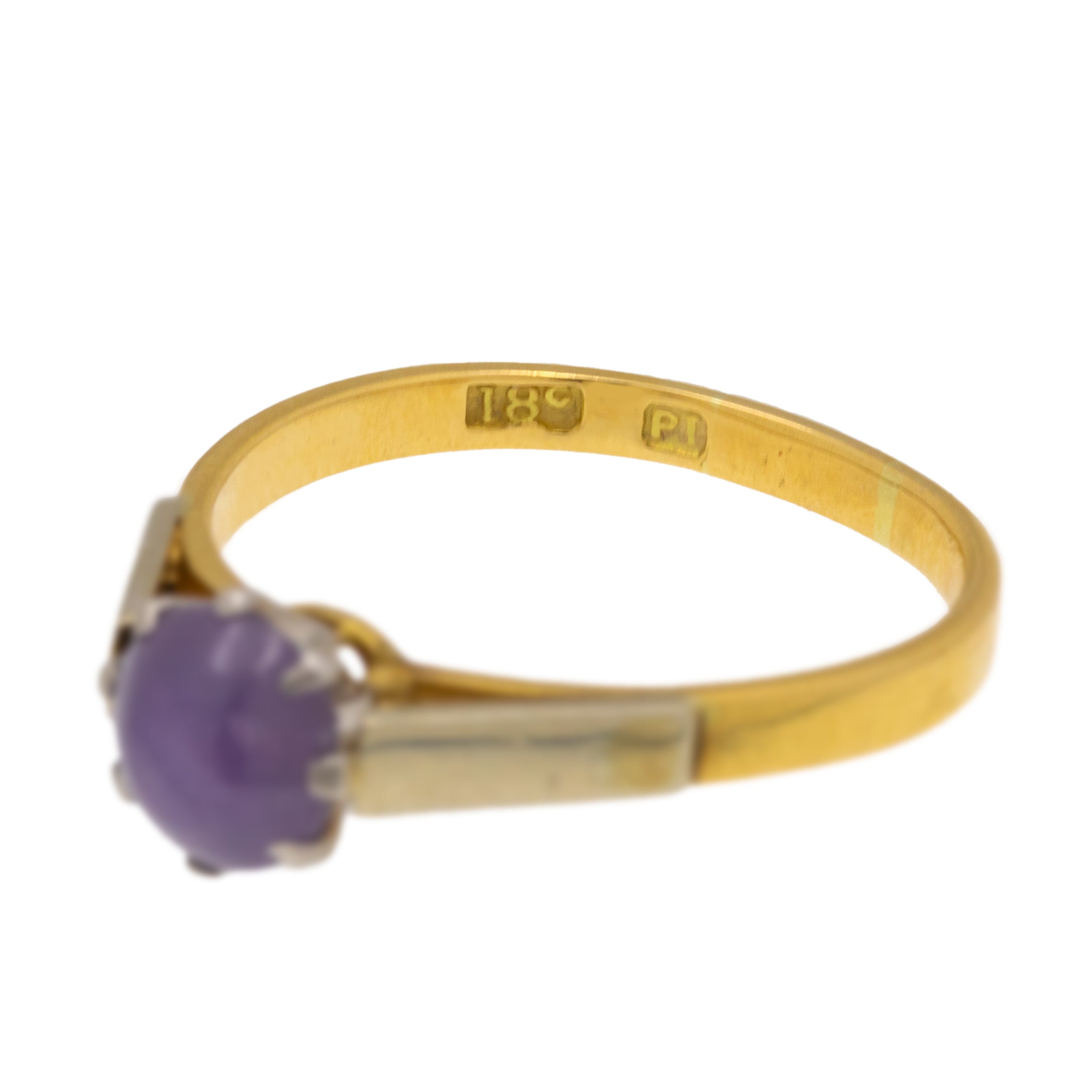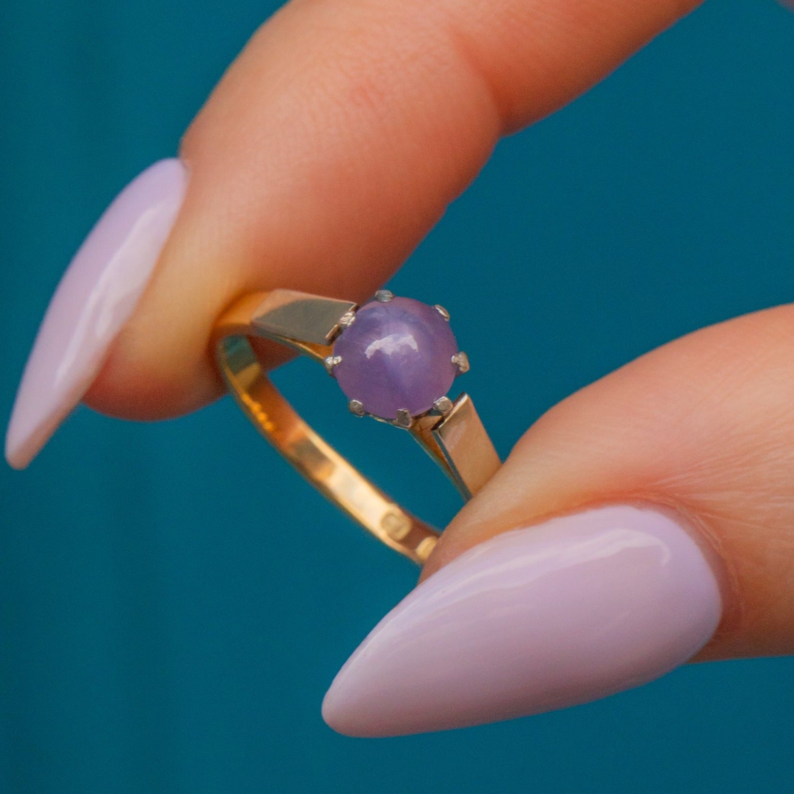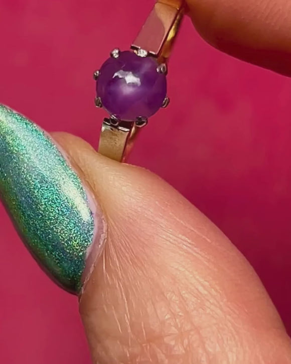 Add this 18ct Gold star Ruby solitaire ring to your collection to bring intrigue to your ring stack! This Art Deco solitaire ring is home to a beautiful star Ruby, infused with lilac and lavender hues.