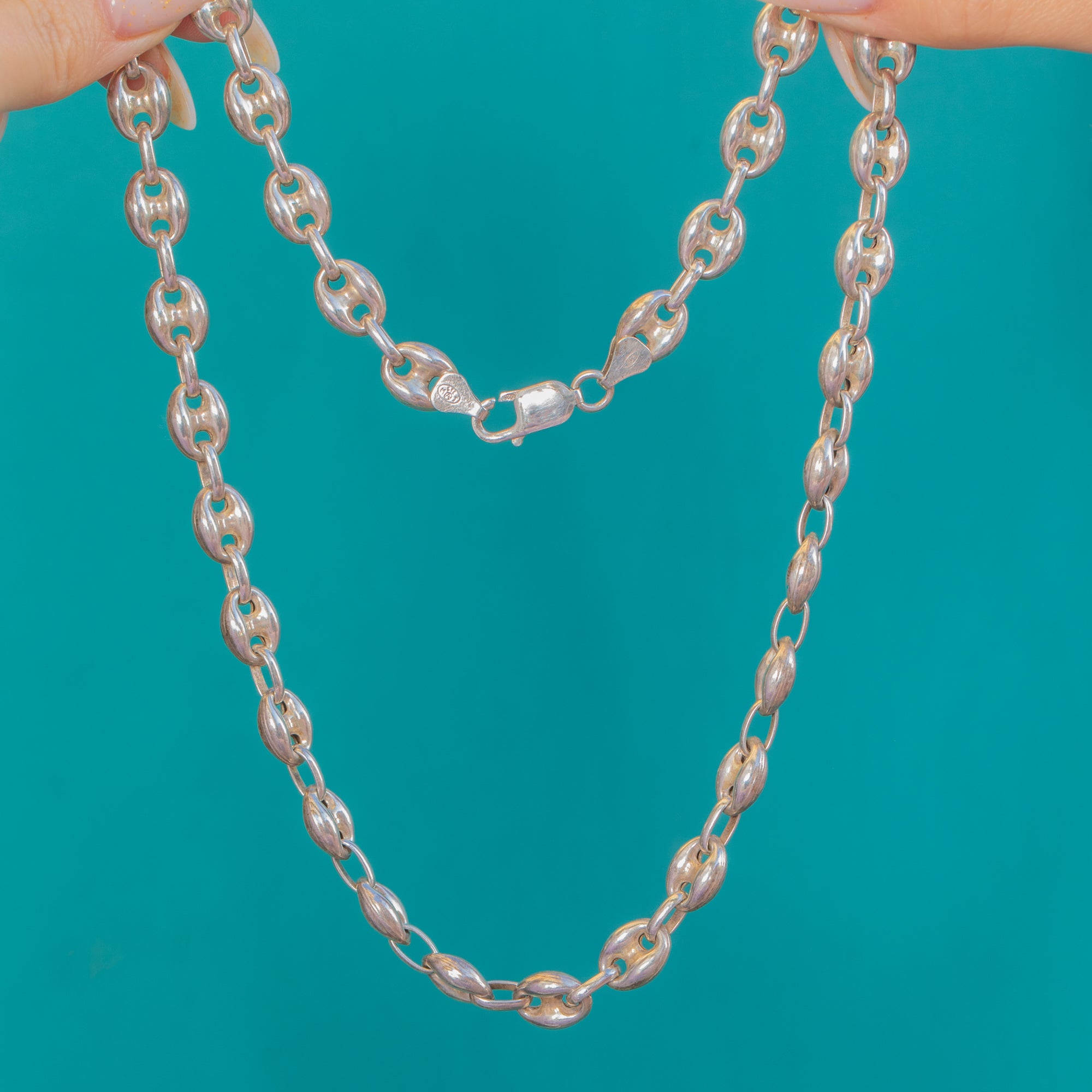 Bold, sculptural and wonderfully sleek, this Vintage Silver mariner link chain showcases repeating domed puffy oval stations of classic Mariner style links connected by smaller open ovals for that clean, geometric rhythm we love! The highly polished finish amplifies its fluid silhouette, catching the light across every curved link.