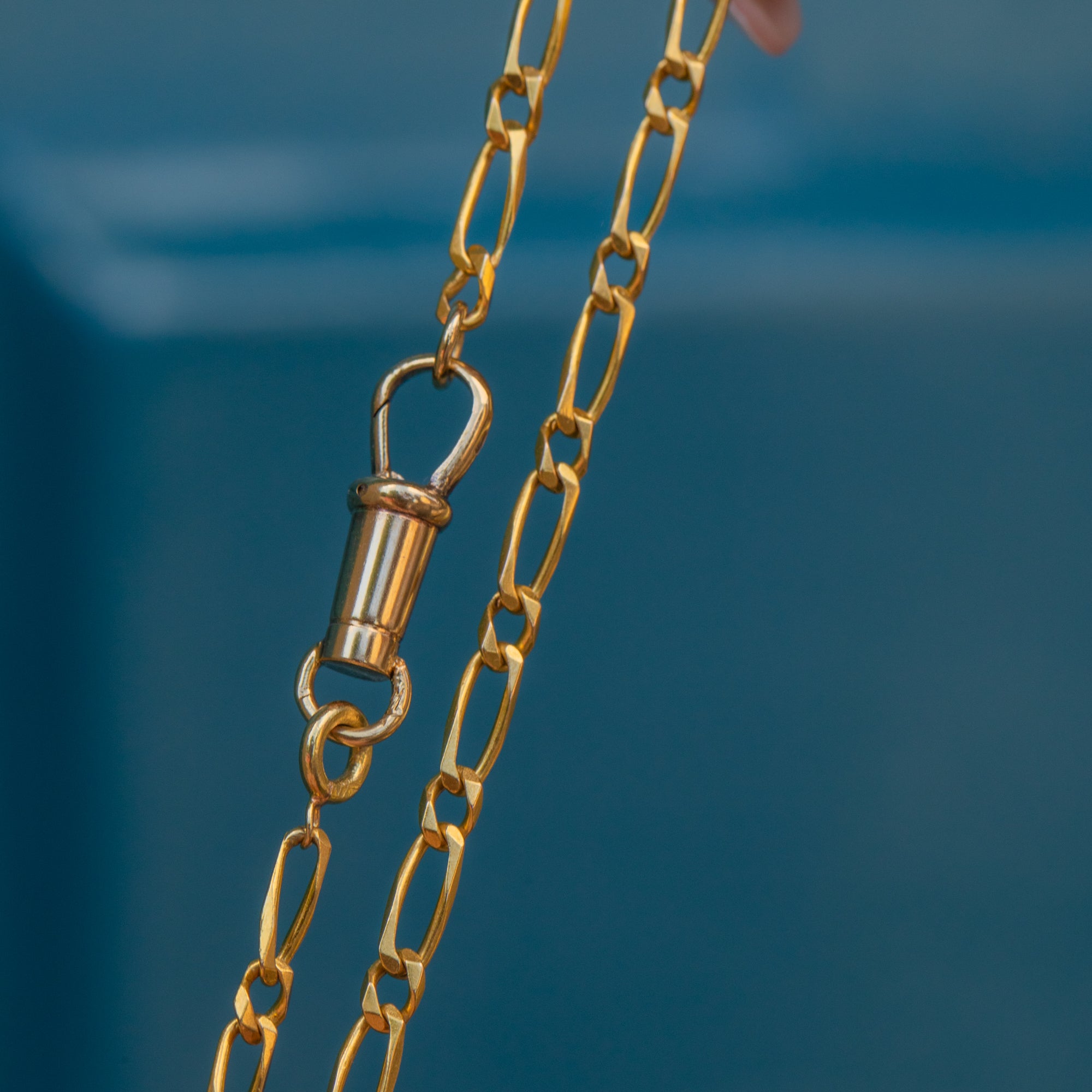 EXCELLENT. This 19" antique 18ct Gold French Figaro chain is in excellent condition! The links are uniform and perfectly rest against one another, with no damage to the Gold to note. The dog-clip is in perfect working order allowing you to wear with confidence!