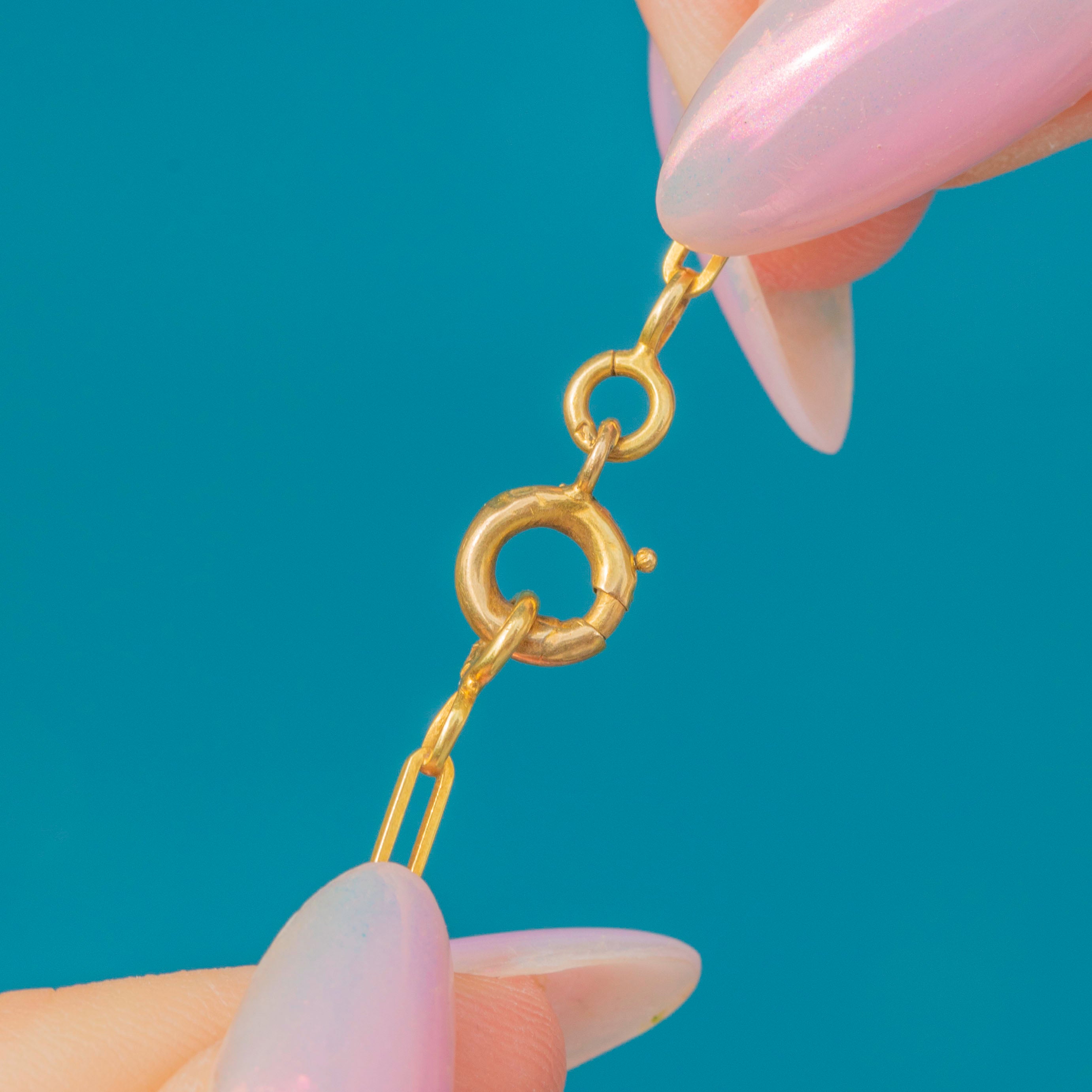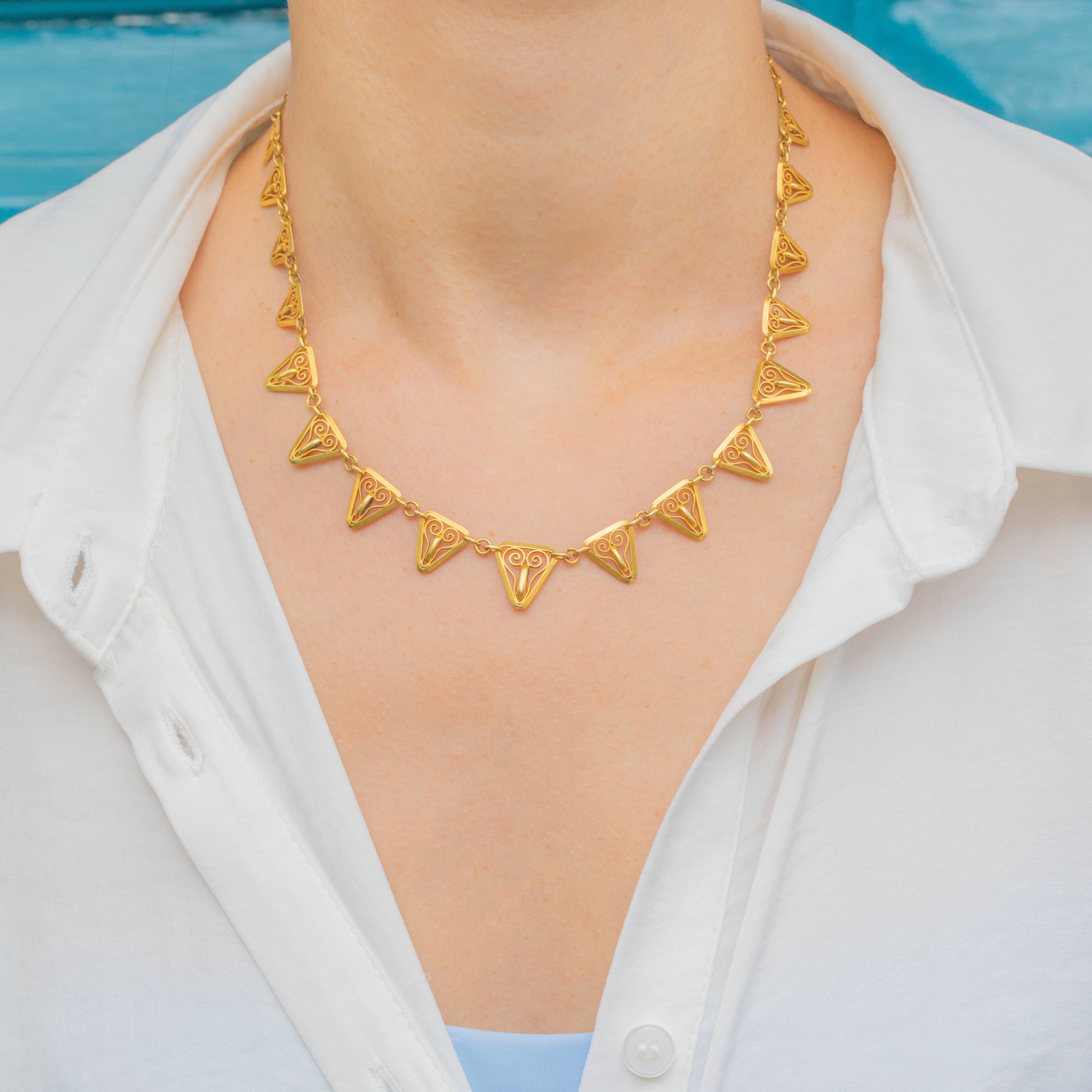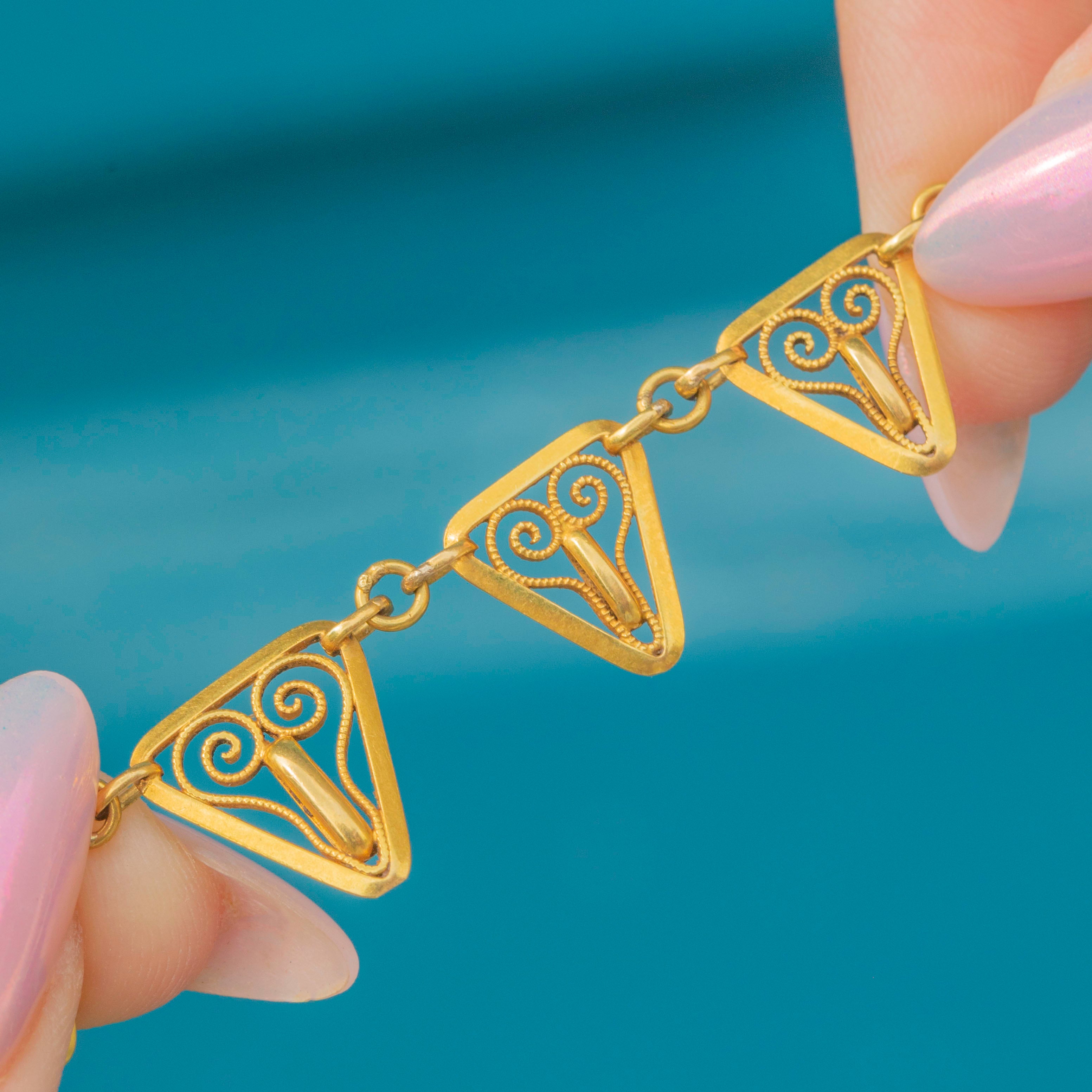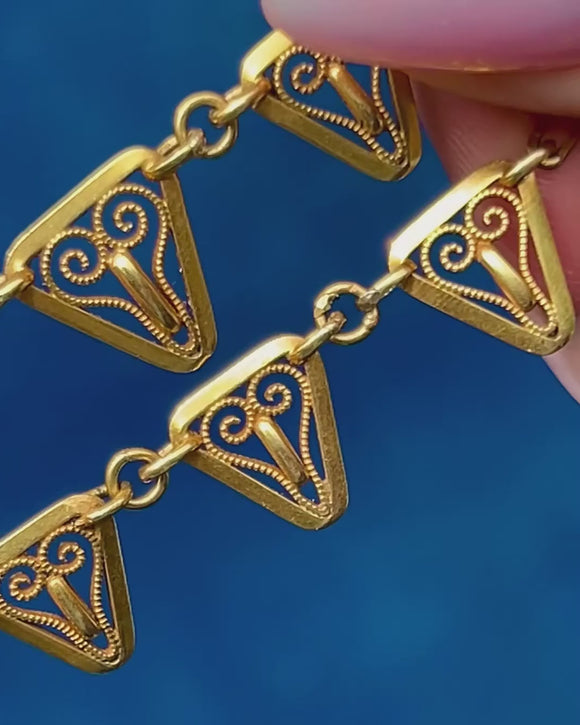 VERY GOOD: This French Art Deco necklace is in very good condition. The fan-shaped links have kept their shape beautifully and are securely connected, with their filigree details remaining intact. The bolt ring, while a tiny bit loose, still closes well, allowing you to wear this antique Gold necklace with confidence.