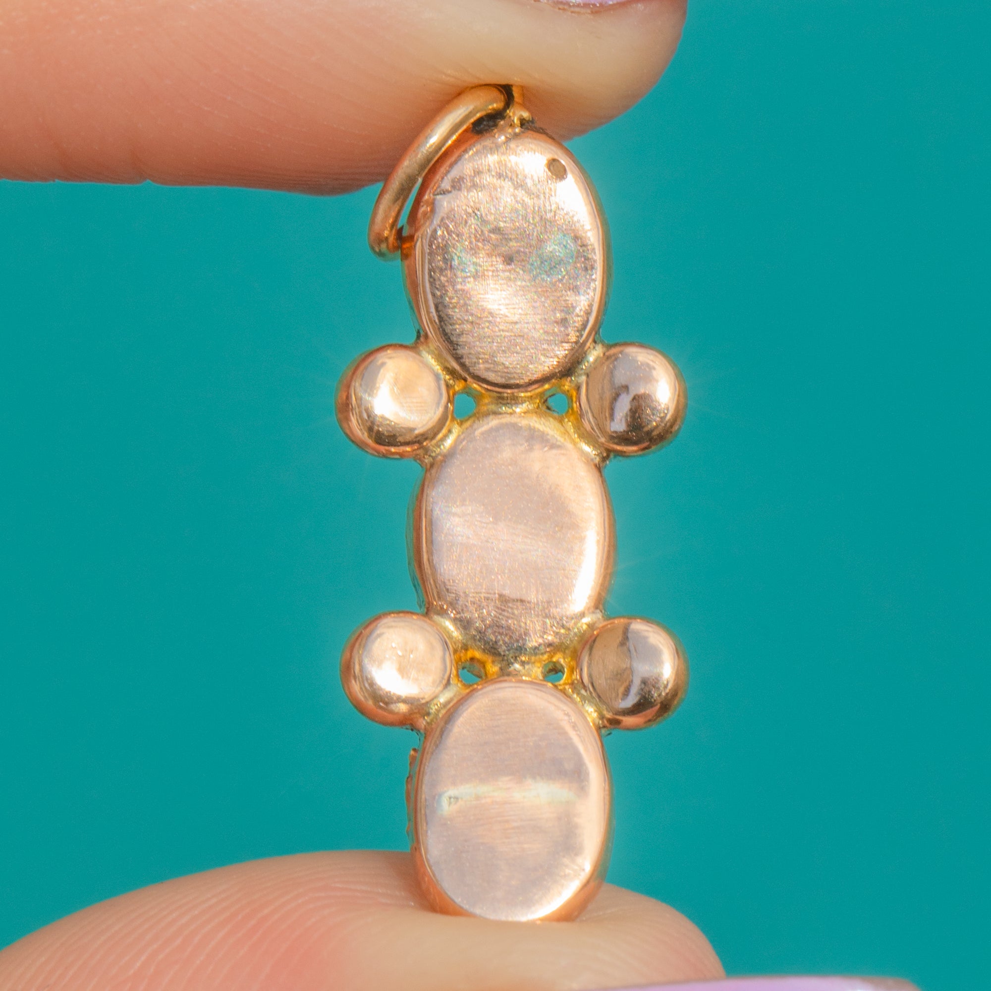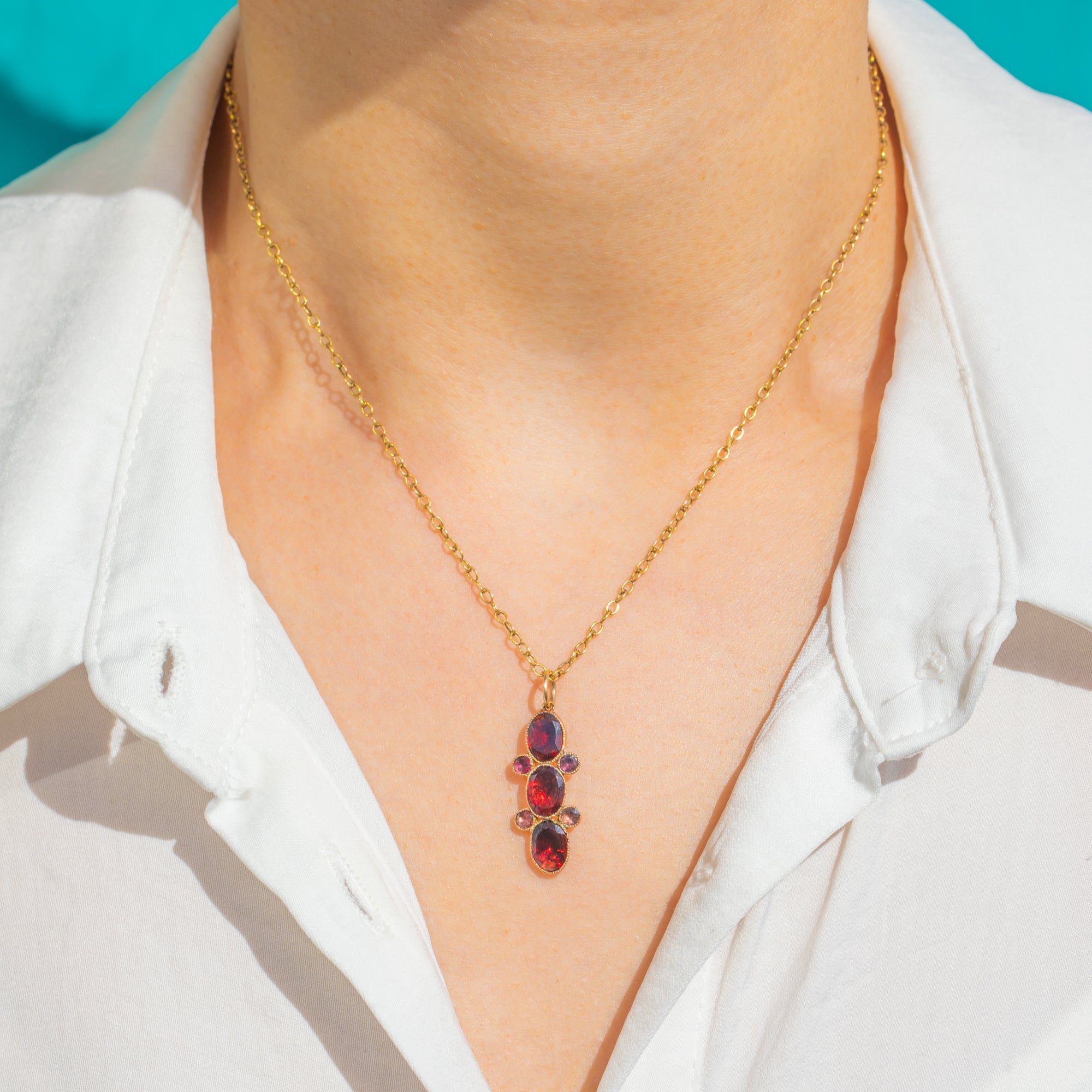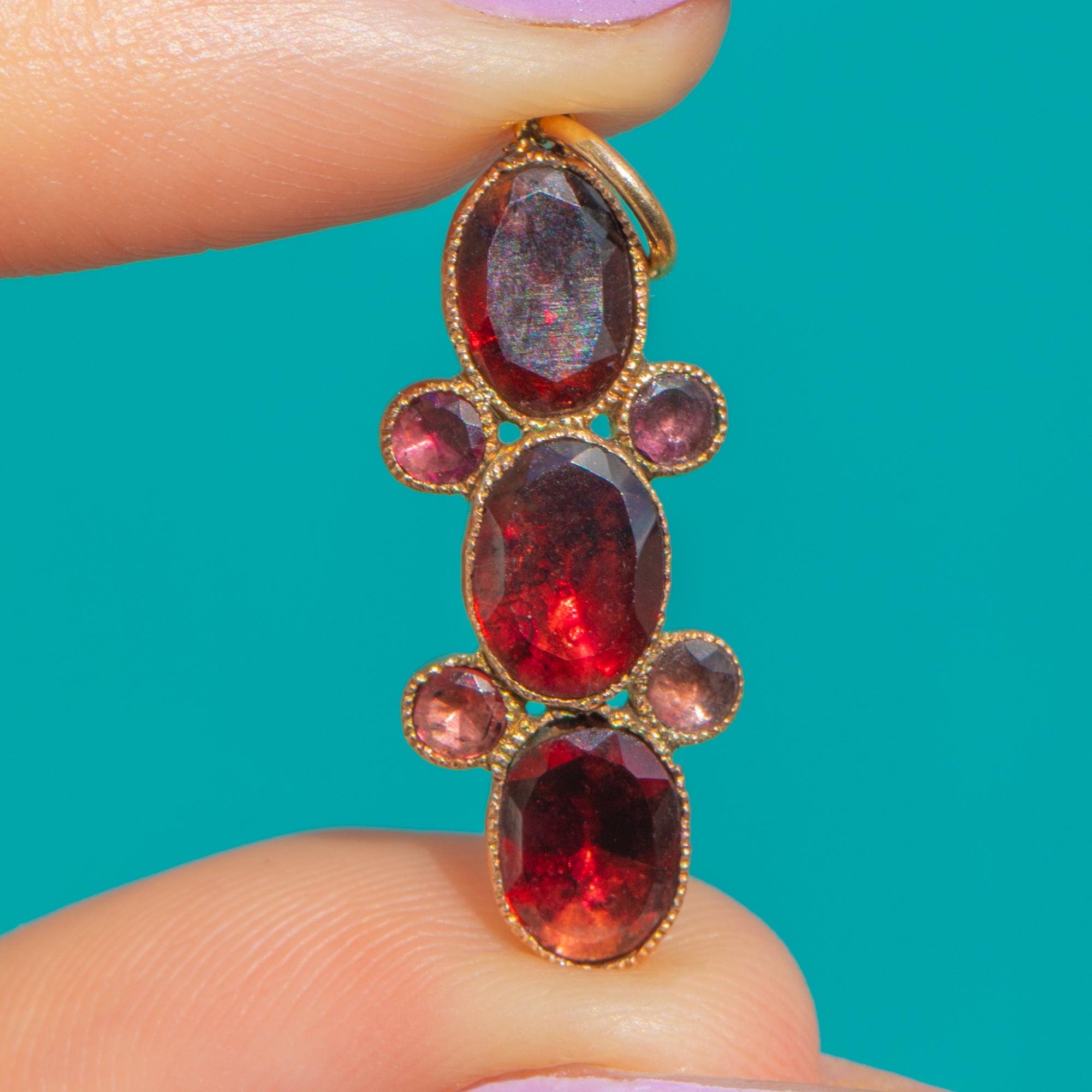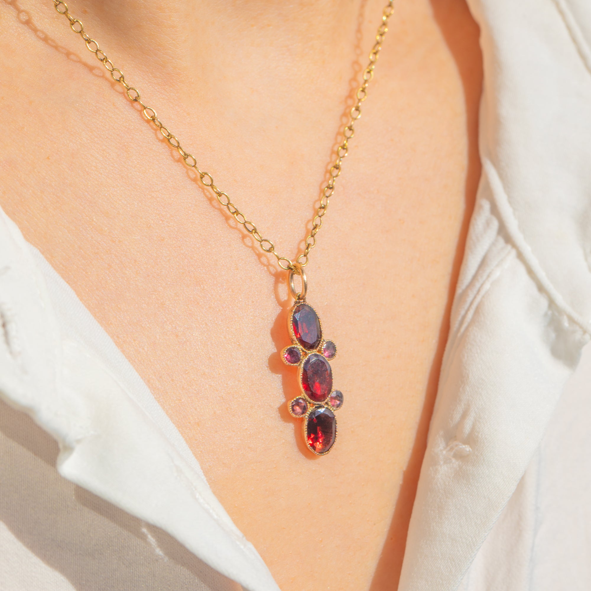 A refined Georgian drop charm crafted in 9ct Gold and set with seven flat-cut, foiled Garnets. Three graduated oval Garnets are stacked vertically and punctuated by four petite round Garnets, each framed by delicate beaded milgrain bezels for a beautifully antique finish.