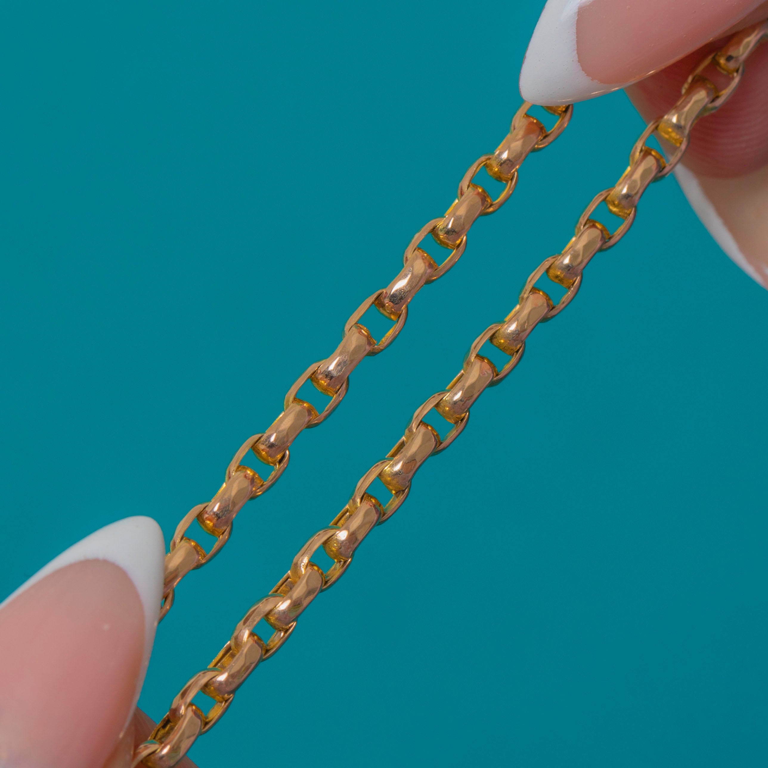 This Victorian 9ct Gold belcher chain is a classic and versatile antique staple, featuring beautifully rounded 3mm links and its original dog-clip clasp. Substantial at 10.9g, it has a satisfying weight and a rich antique Gold colour that pairs effortlessly with charms, pendants or layered chains.