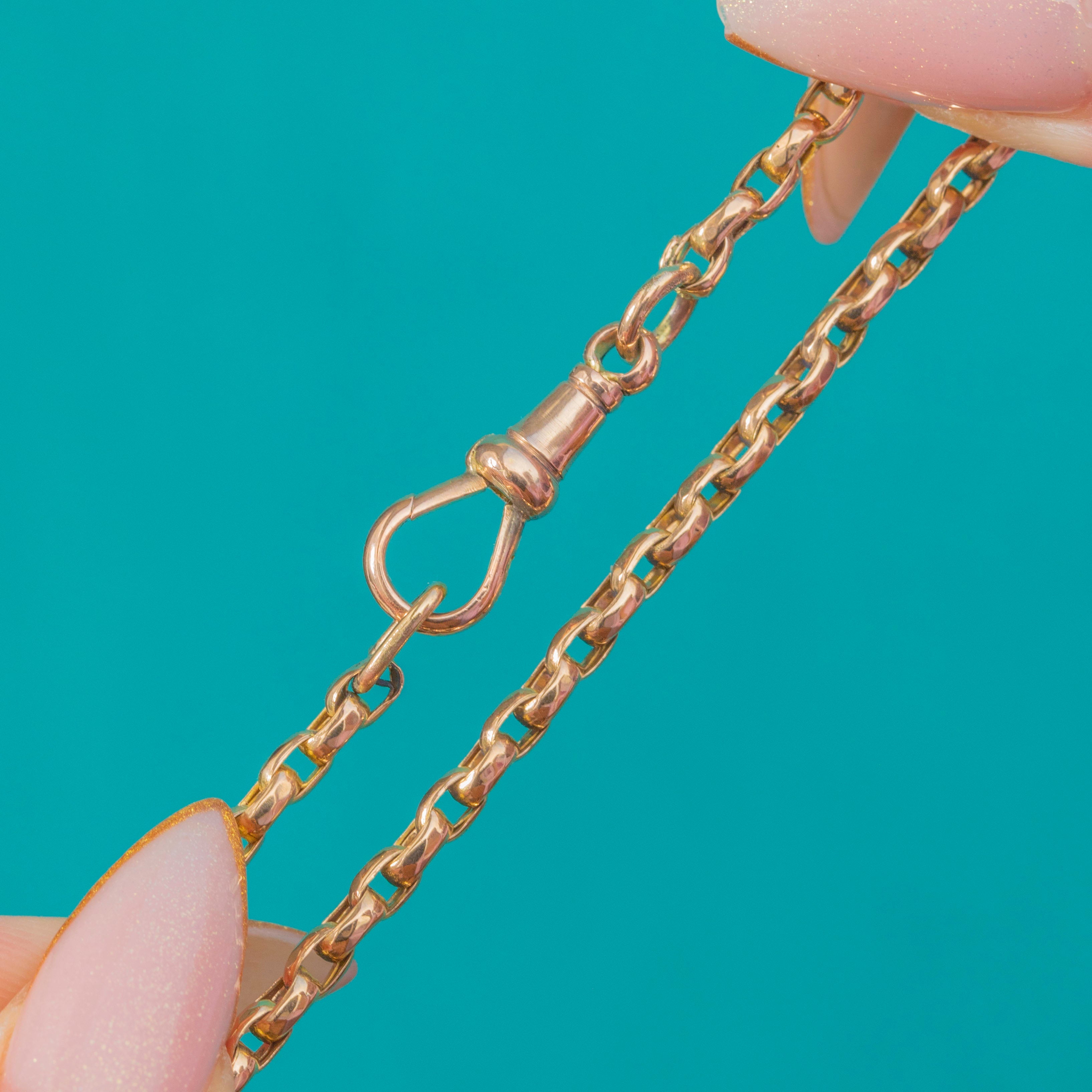 This antique Victorian belcher chain is a timeless staple, crafted in warm 9ct Gold with classic rounded links. Its elongated dog-clip clasp adds the perfect touch of period charm, making it ideal for wearing alone or styling with your favourite pendants and charms.