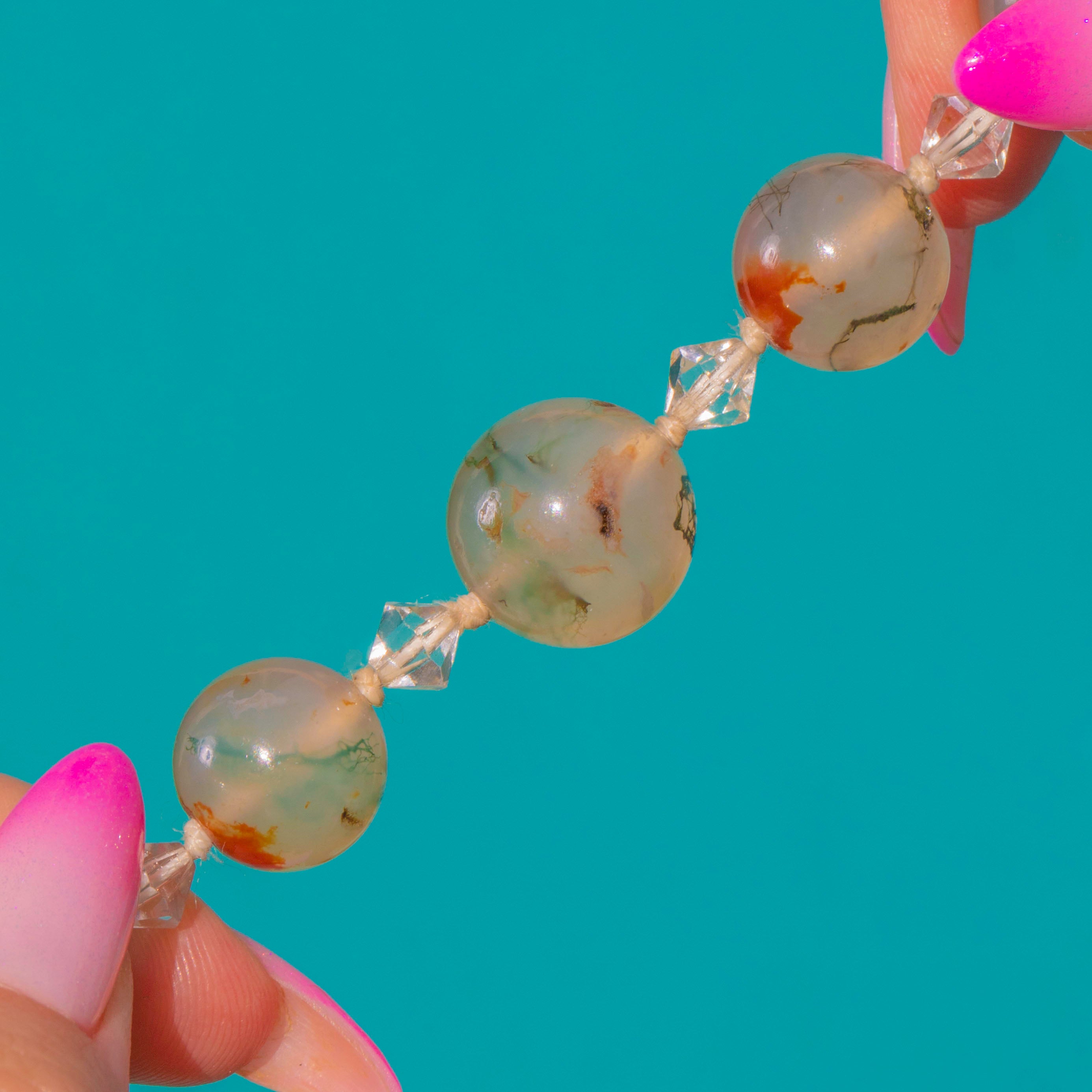 Evocative of misty forests and painterly horizons, this Art Deco necklace marries translucent Moss Agate with sparkling Rock Crystal. Each polished, round Agate bead displays natural dendritic inclusions in soft greys, olive-greens and warm amber tones, creating an organic, landscape-like effect. Clear faceted Rock Crystal spacers punctuate the strand with light and brilliance.