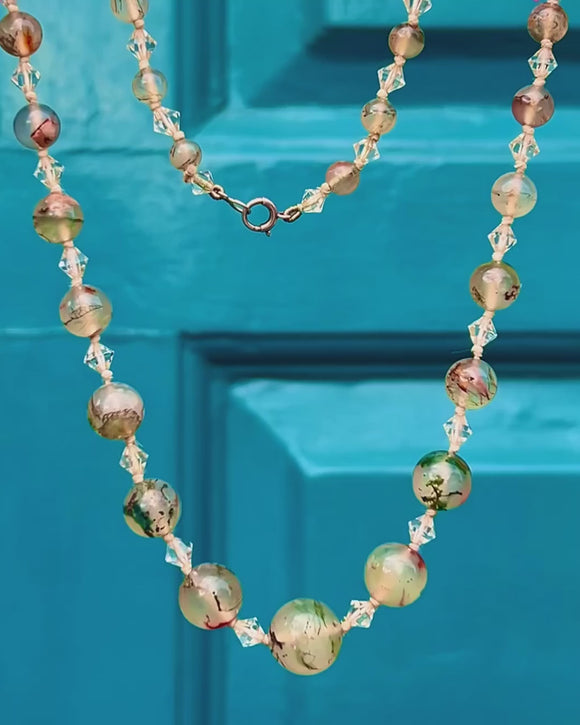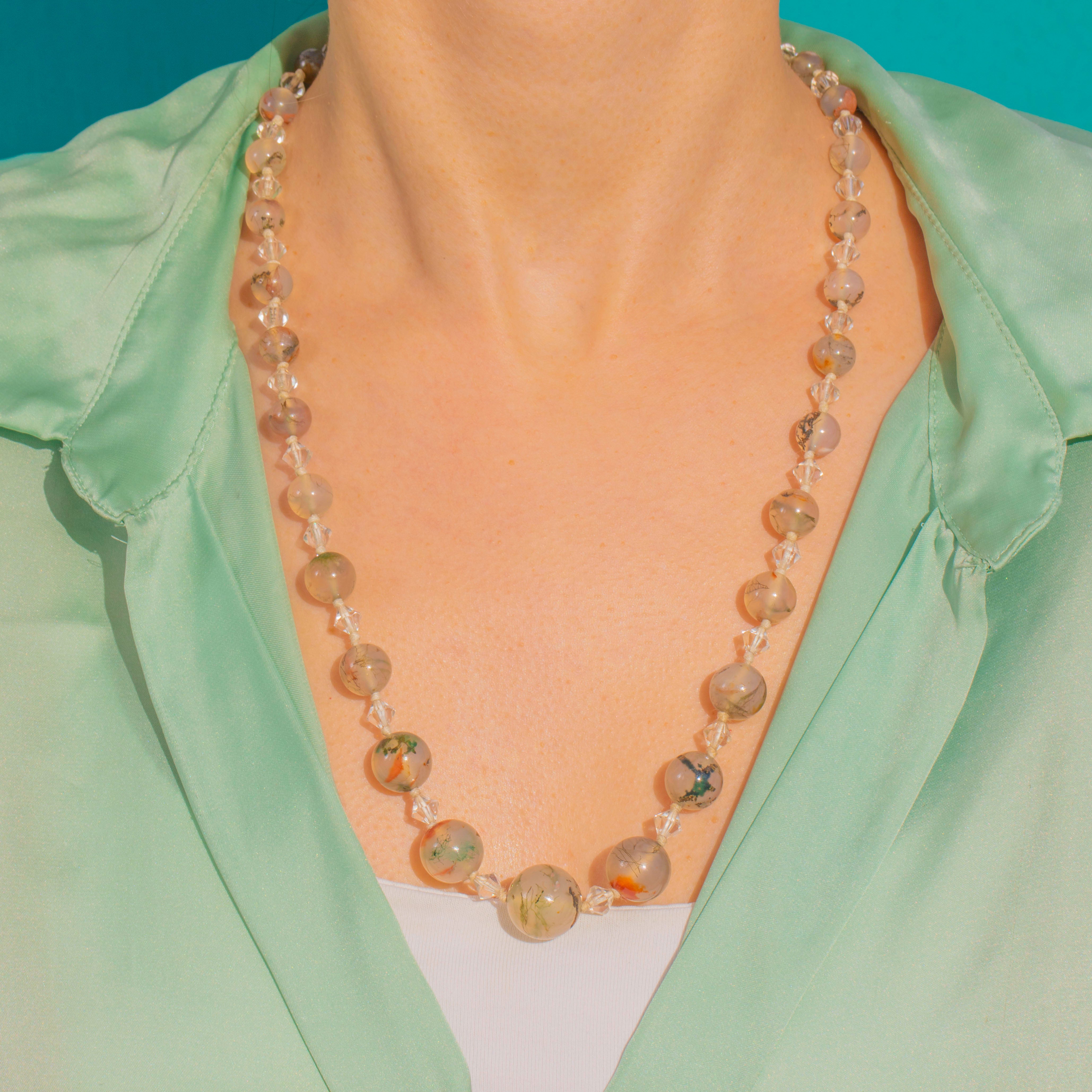 23" Art Deco Moss Agate & Rock Crystal Bead Necklace