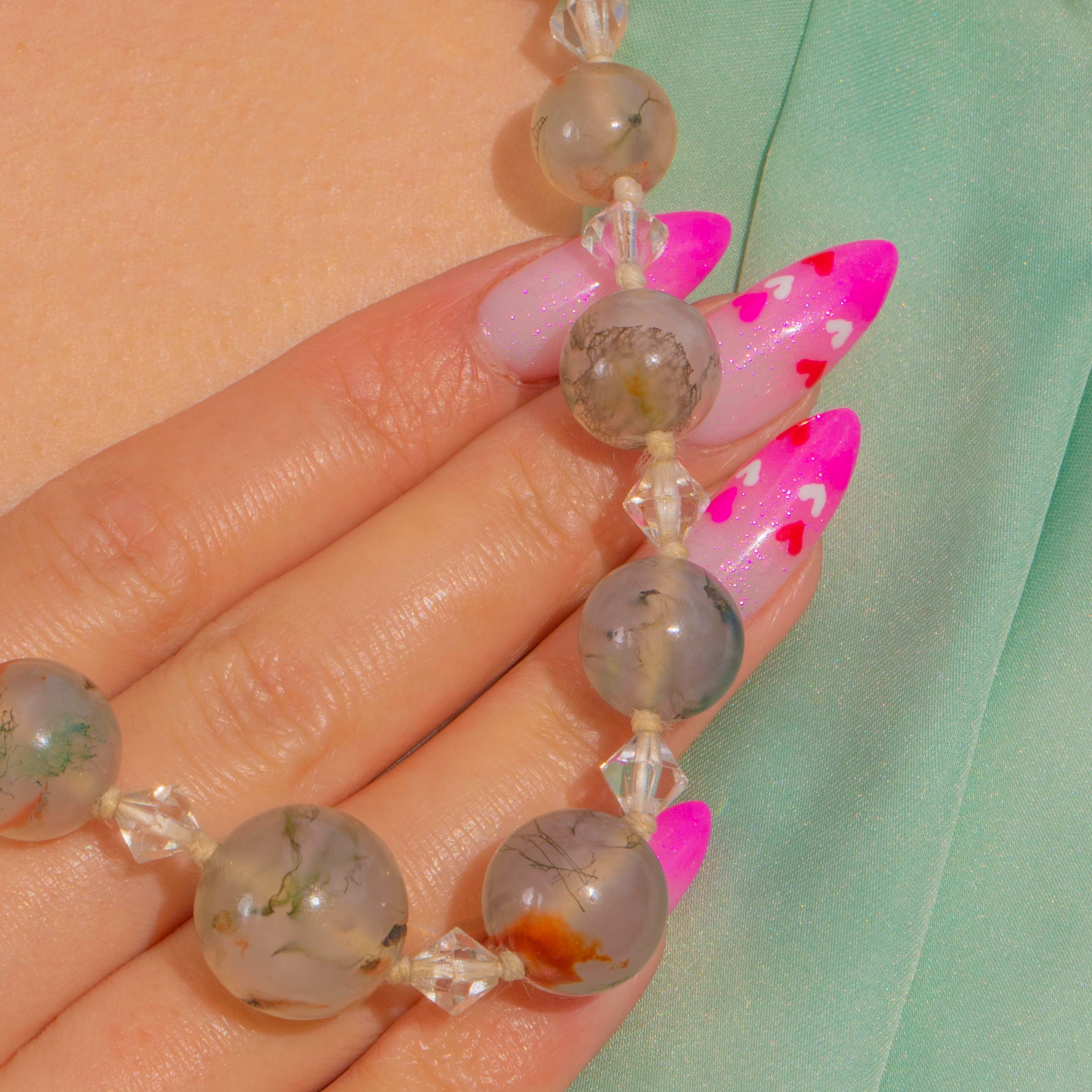 MATERIALS: Tests as Silver (clasp), Moss Agate, Rock Crystal.