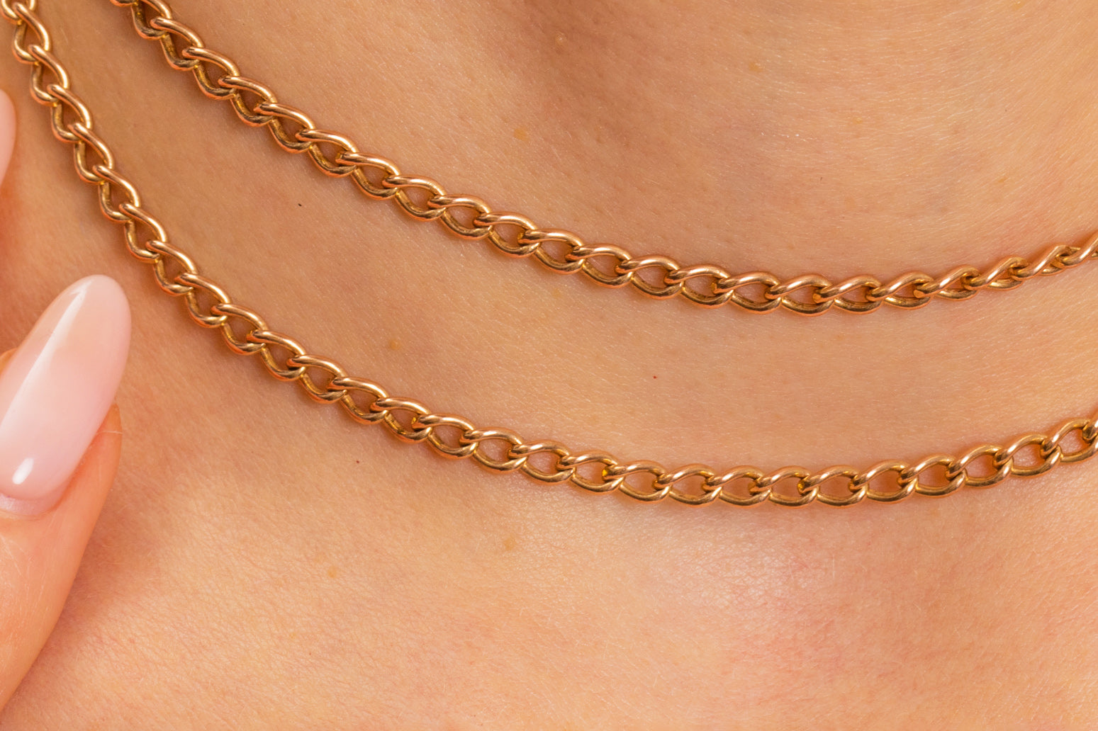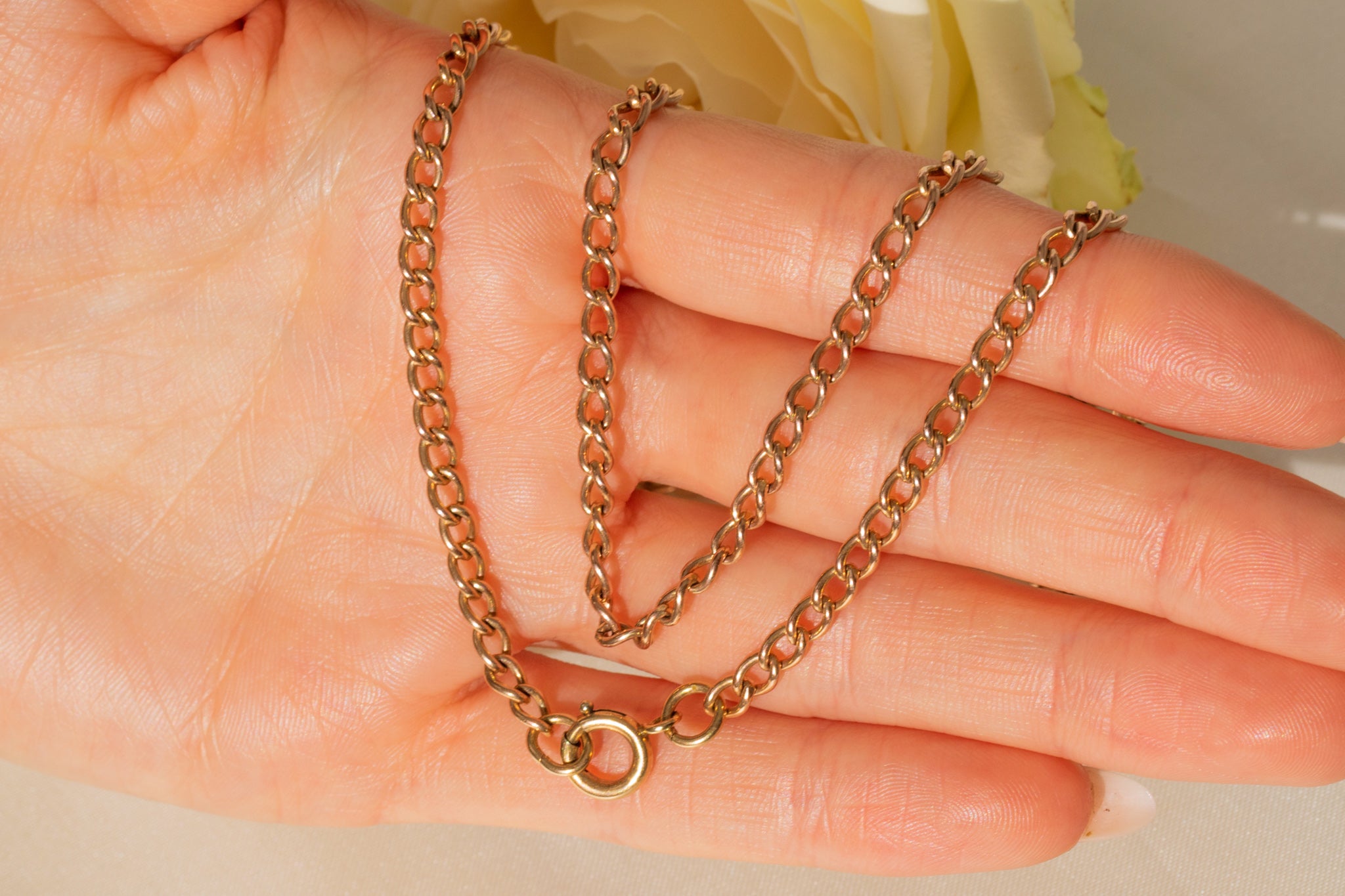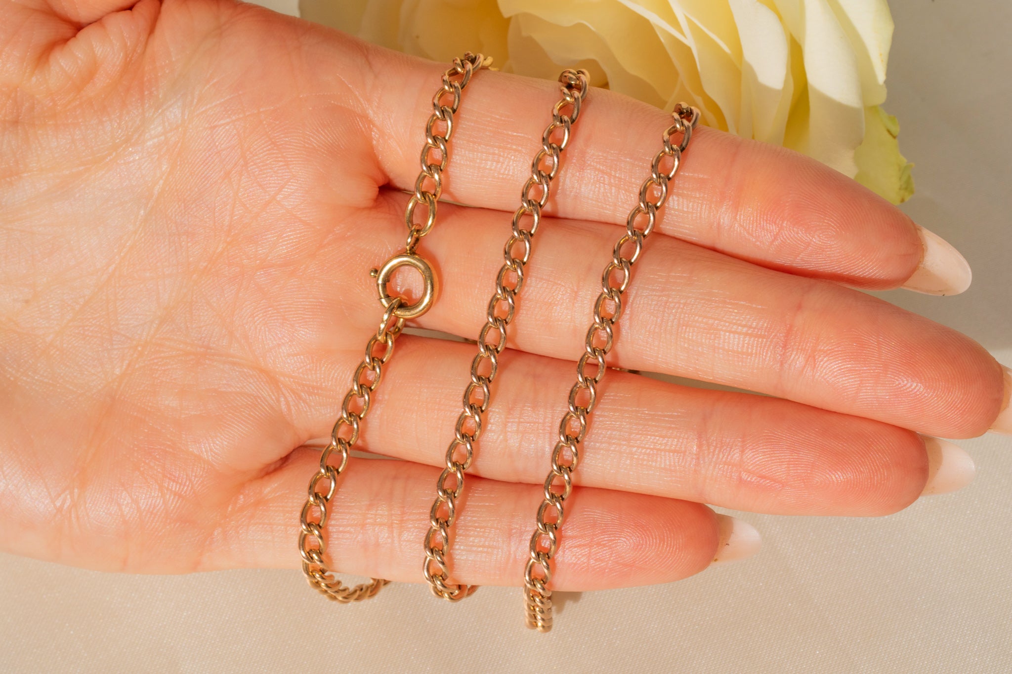 EXCELLENT. With little to report, this 26.5" antique 9ct Gold curb chain is in excellent condition! Her links are smooth to the touch, free from damage, and have a radiating glow throughout. The bolt ring is in perfect working condition allowing you to wear it securely with the utmost comfort!