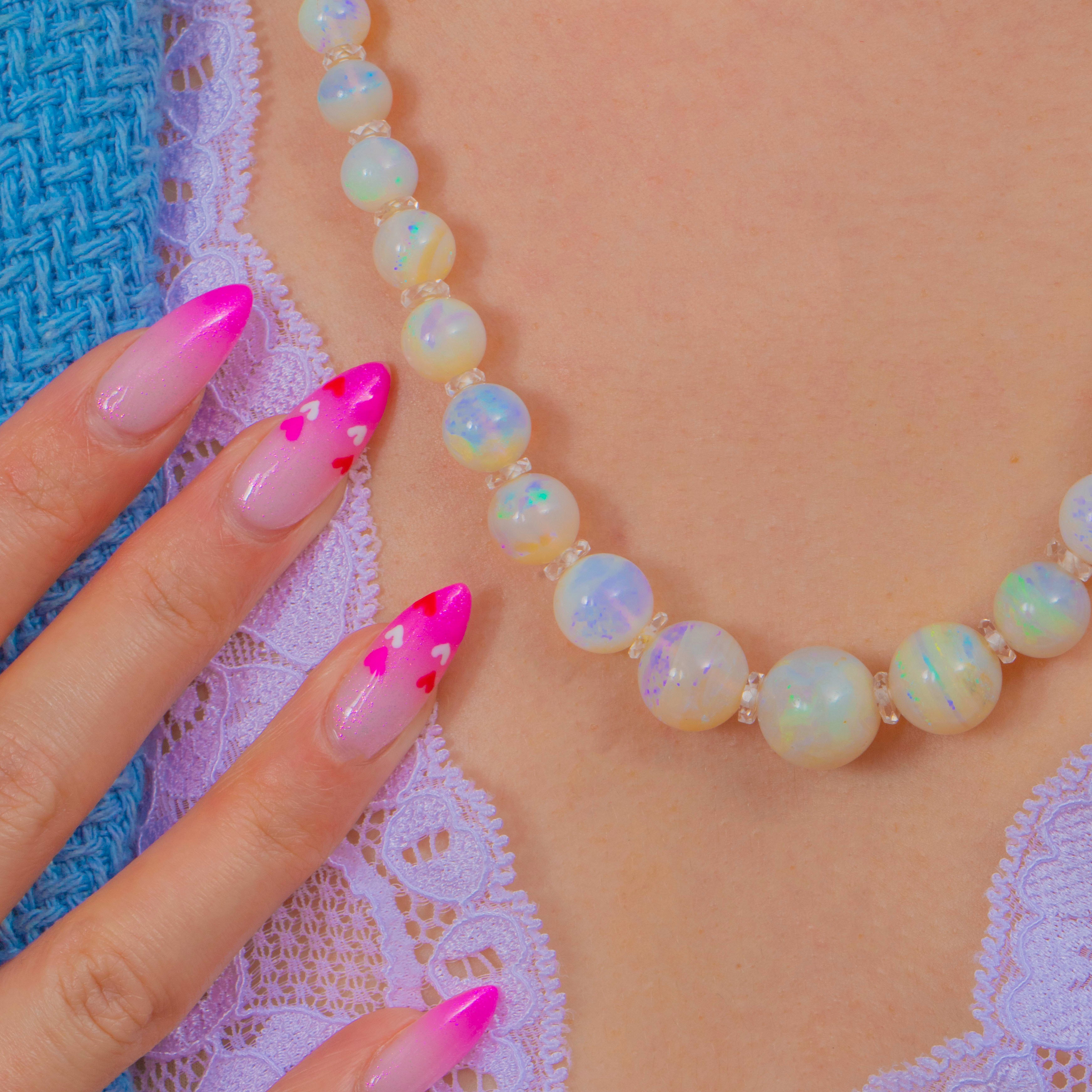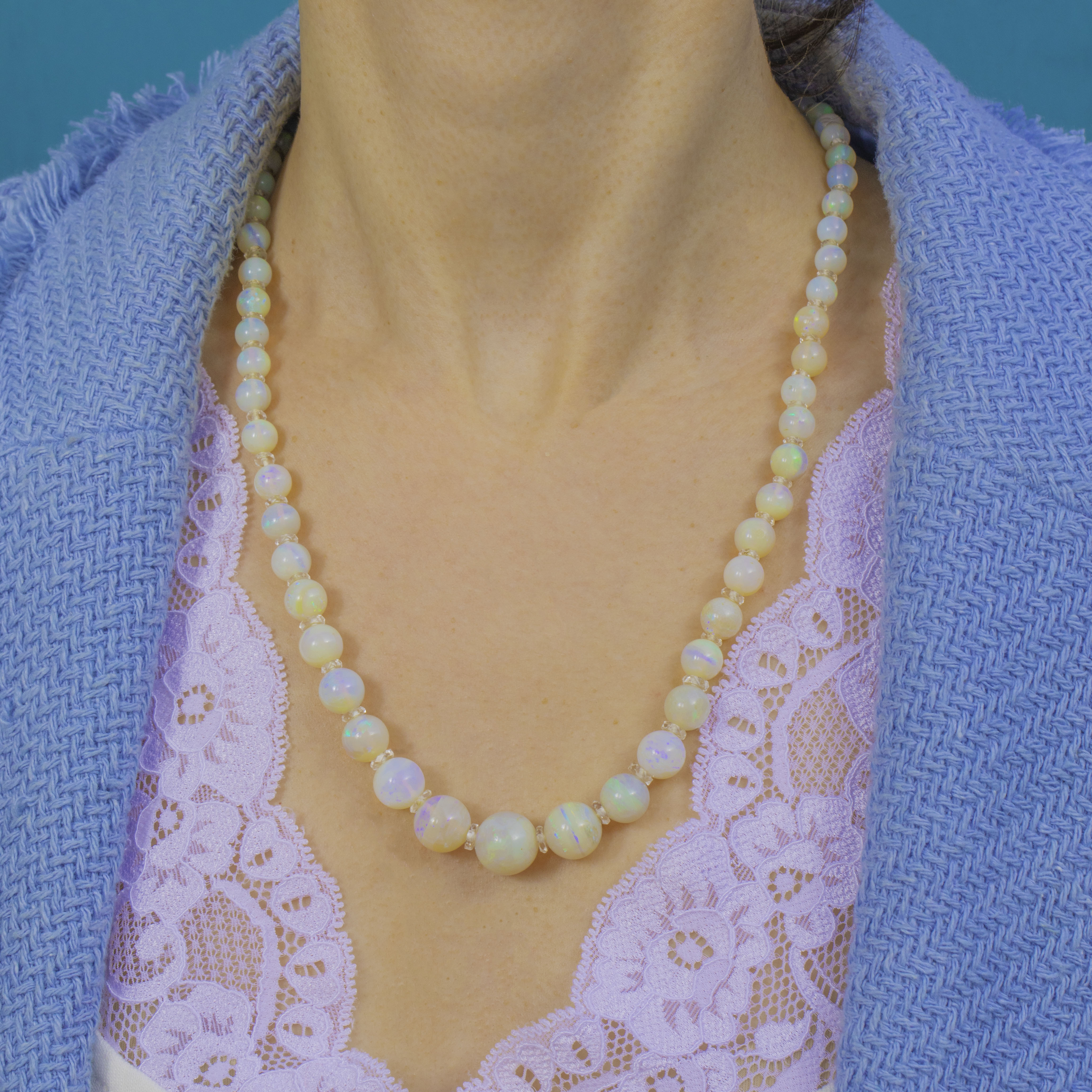 A luminous strand of Art Deco elegance, this graduated Opal necklace shimmers with ethereal play-of-colour, from soft blues and greens to delicate pinks and golds. Each spherical Opal is separated by sparkling Rock Crystal rondelles, lending rhythm, clarity and a touch of brilliance to the opaline glow.