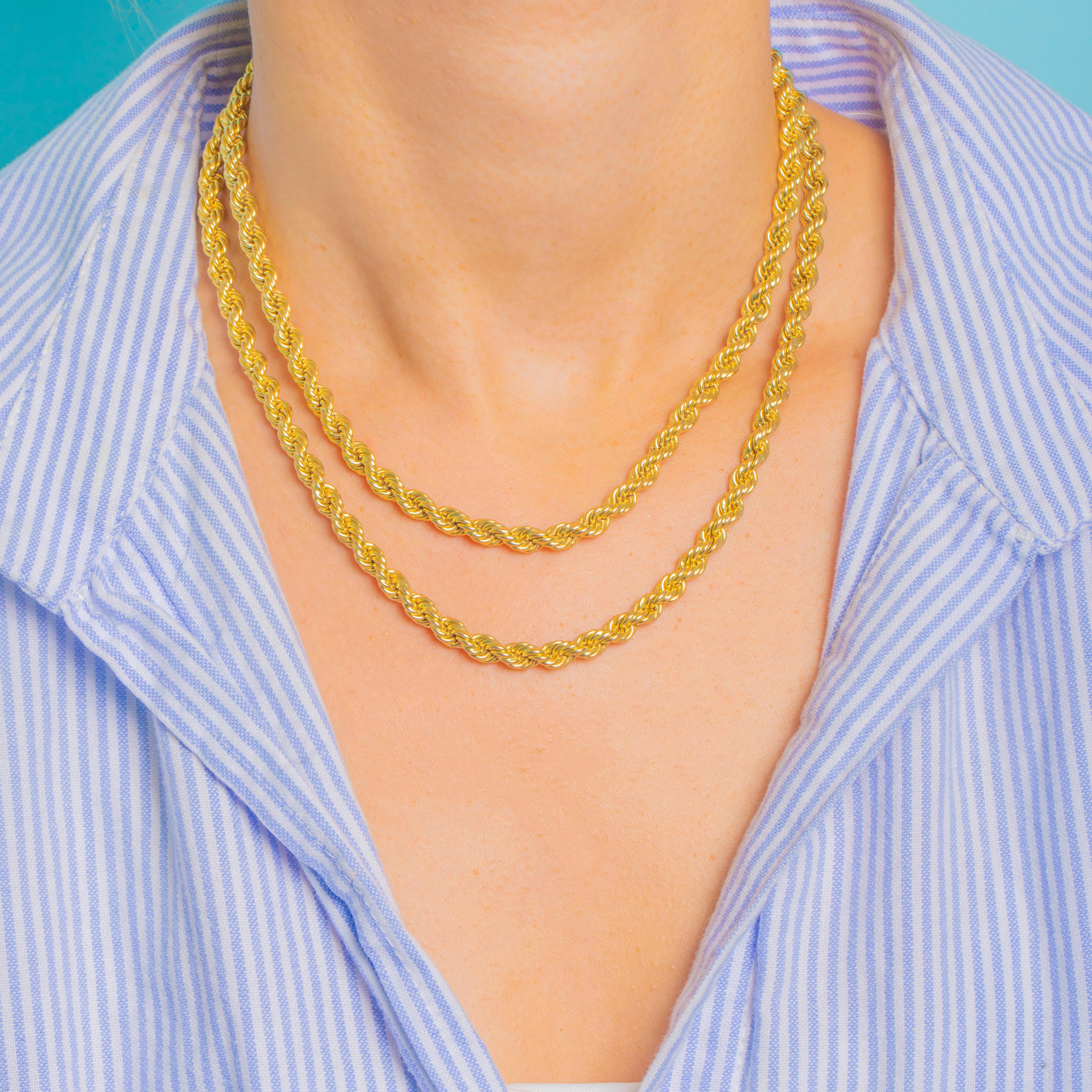 A luxurious and beautifully made 1970s rope chain in solid 9ct Gold, showcasing the classic twisted design that reflects the light from every angle. At a generous 30" length and 5mm thickness, it’s a statement piece that drapes elegantly and exudes vintage glamour.