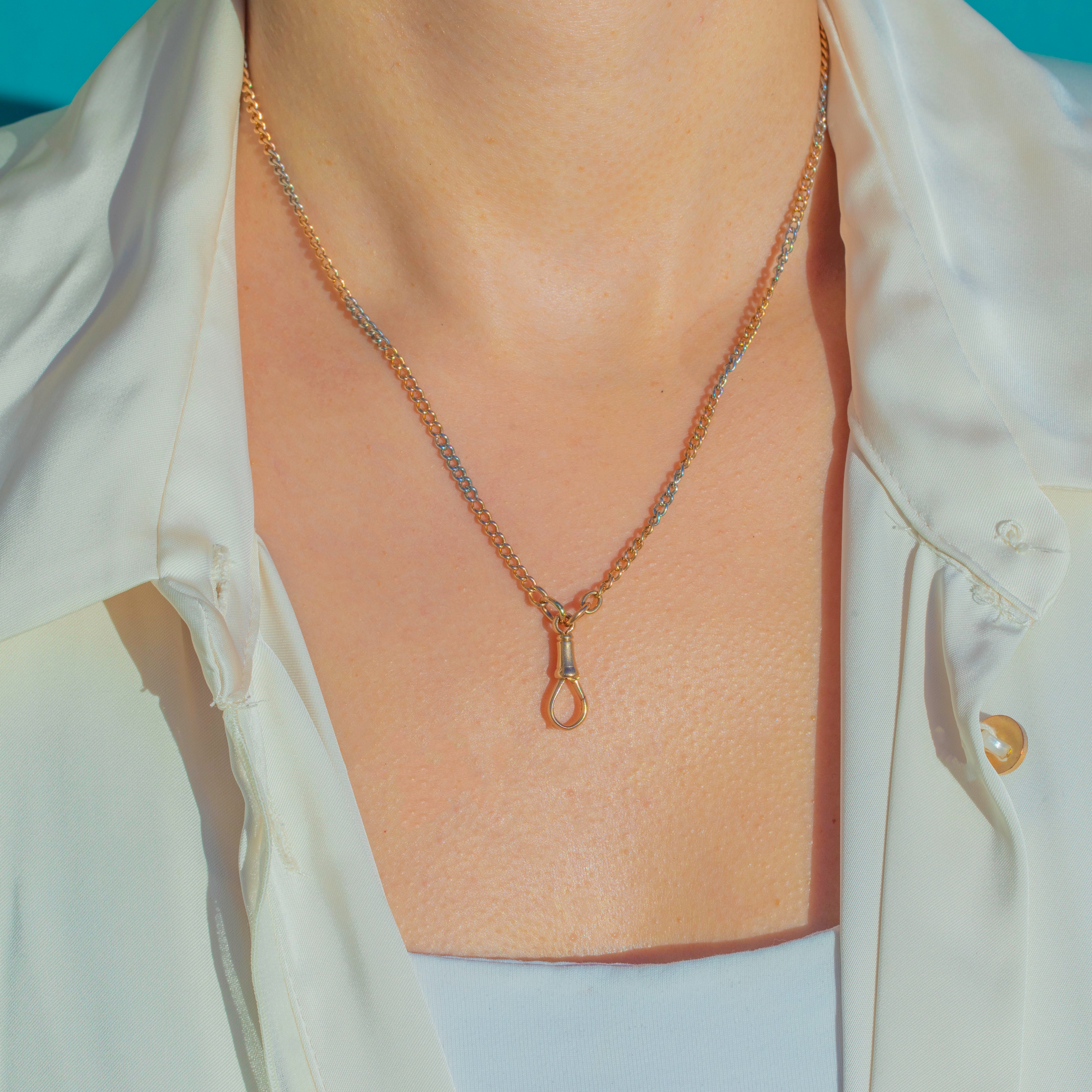 This 18ct Gold two-tone chain may be antique, but she's a sleek and modern way to wear your favourite charms and pendants! Circa 1900, these Victorian links alternate between warm Yellow Gold and cooler White Gold tones, giving it a subtle contrast that looks stylish layered or worn solo.