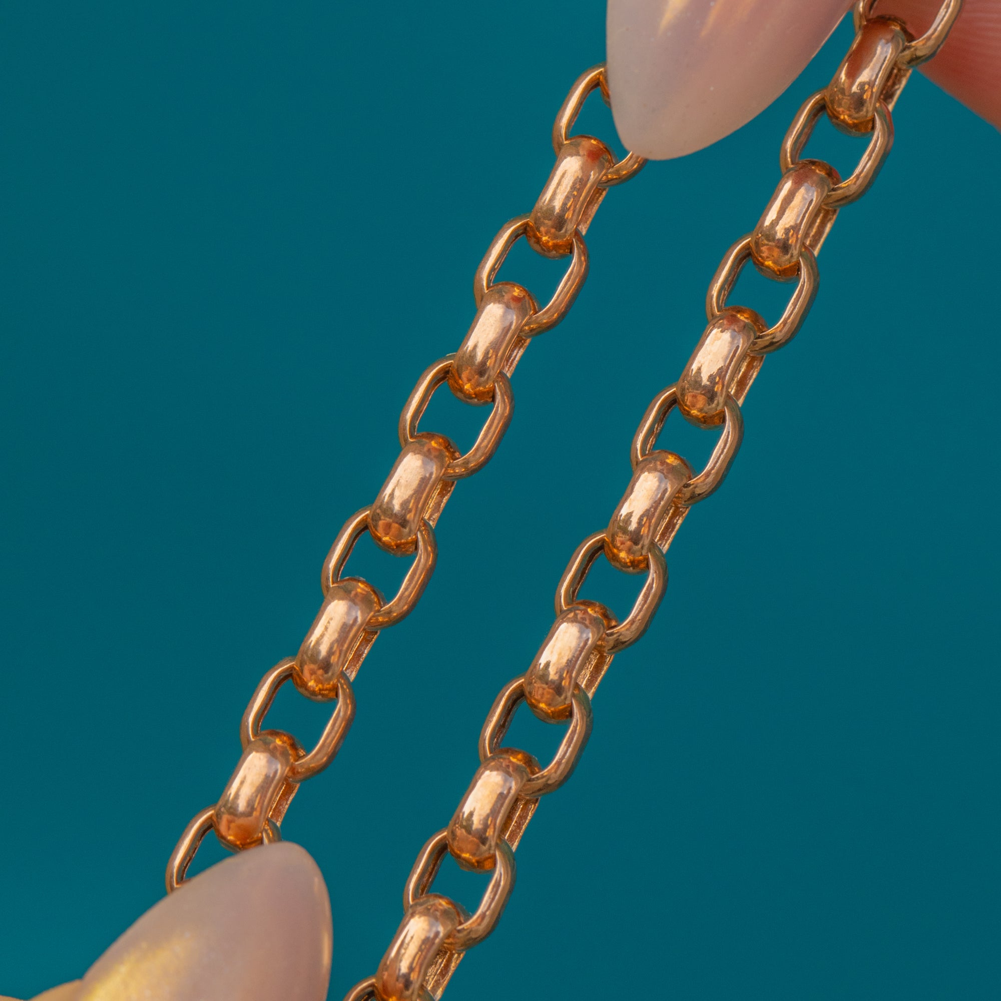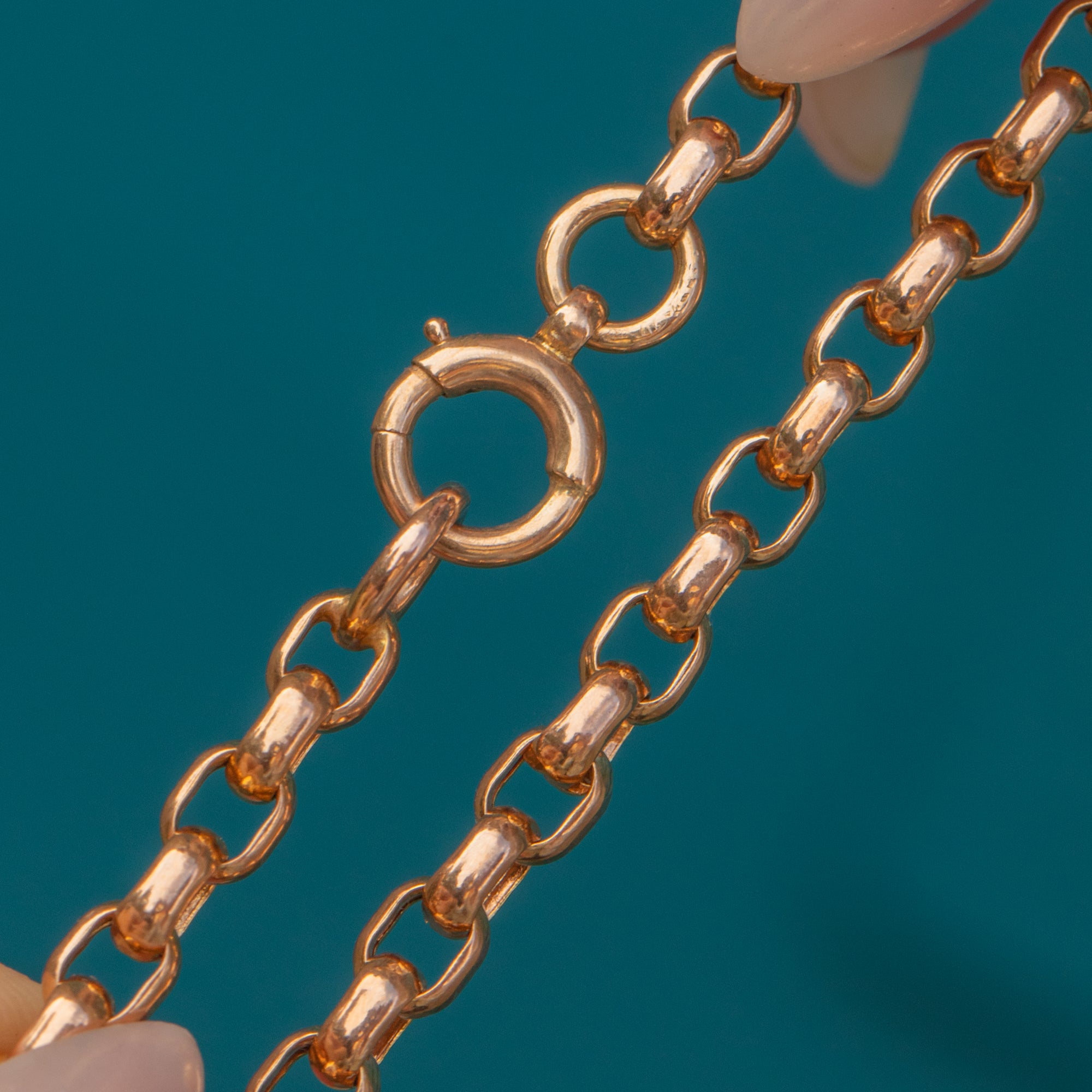 This chunky belcher chain has that rich rosy glow collectors love. The rounded belcher links give satisfying presence and a smooth drape, while the long 30" length makes it an easy everyday layer or a solid anchor for a favourite pendant. It’s fitted with a traditional large antique bolt-ring or "spring-ring" clasp.