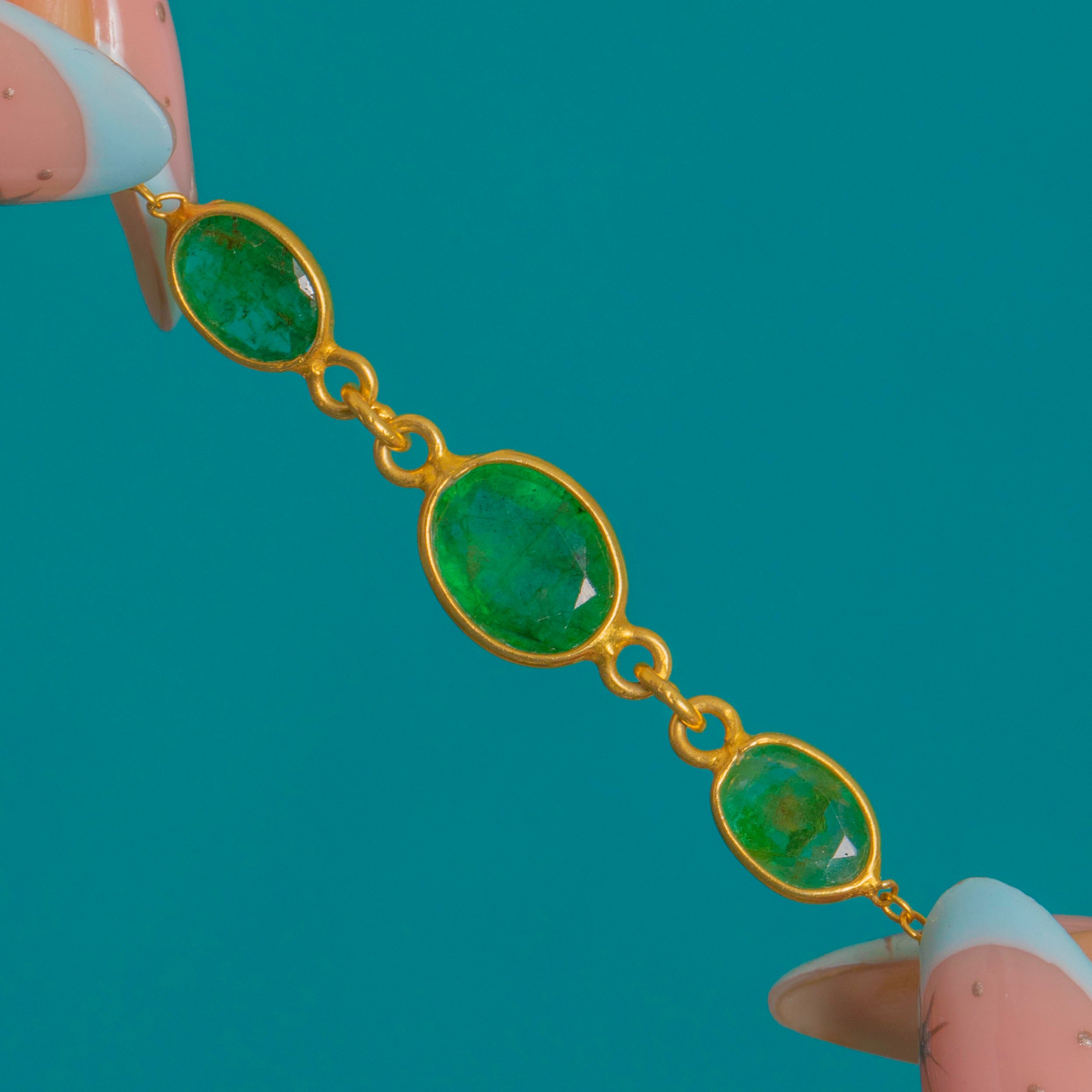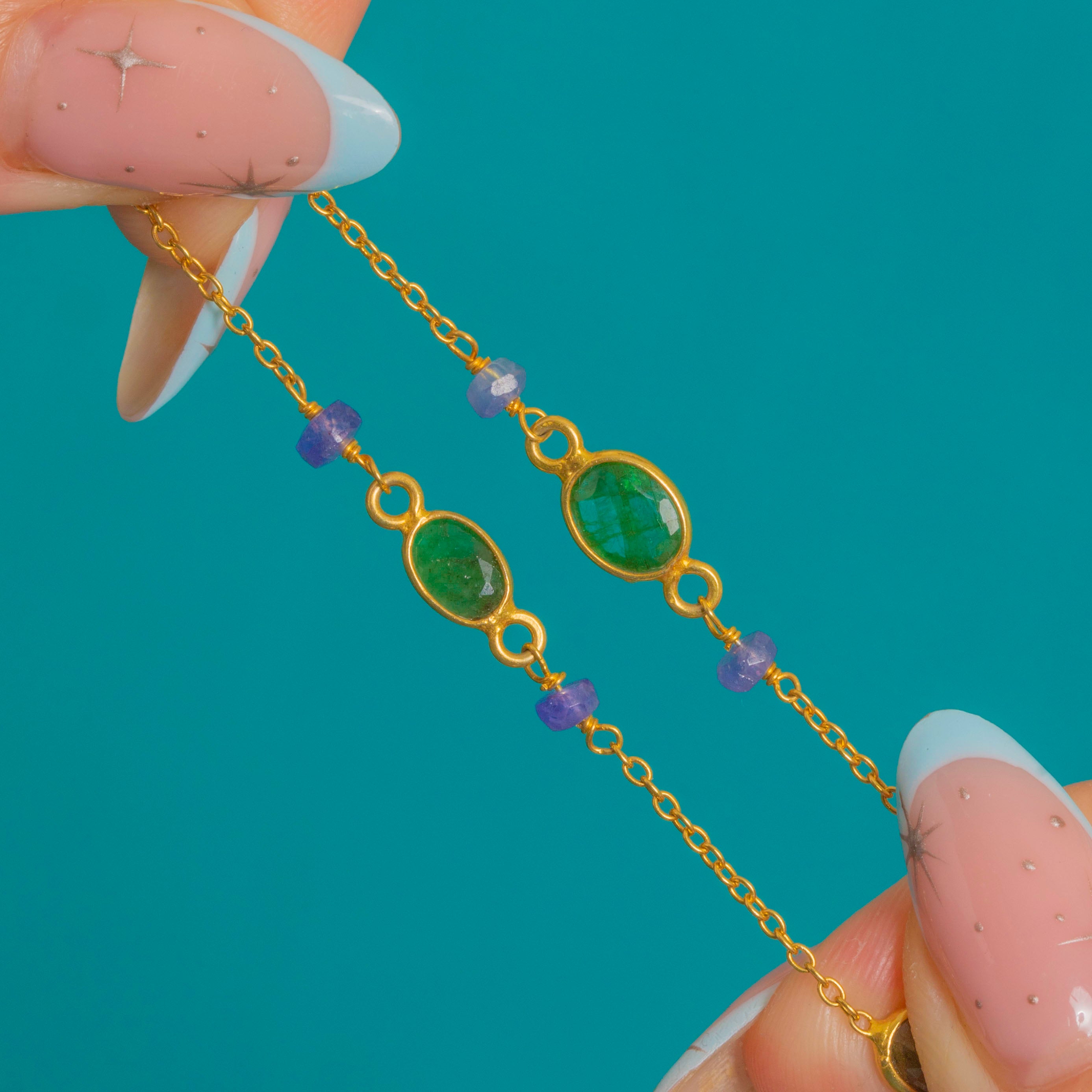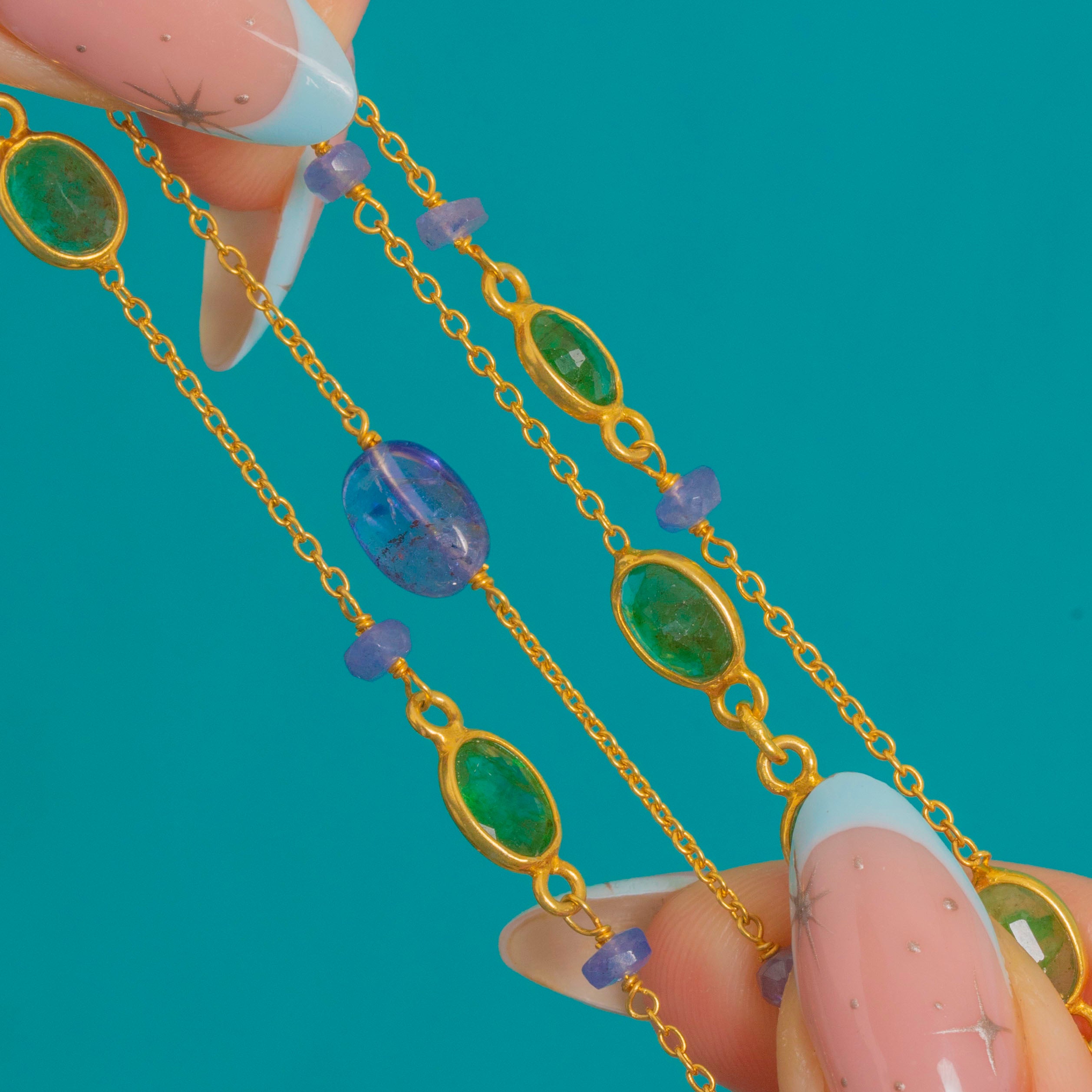 A graceful “by the yard” station necklace, glowing with verdant Emeralds and punctuated by velvety violet Iolite. The oval green gems are framed in smooth bezels and set along a fine 15ct Gold-gilded Sterling Silver chain, with petite Iolite beads and a single larger Iolite accent lending a chic pop of colour. The look is delicate, luminous and effortlessly elegant.
