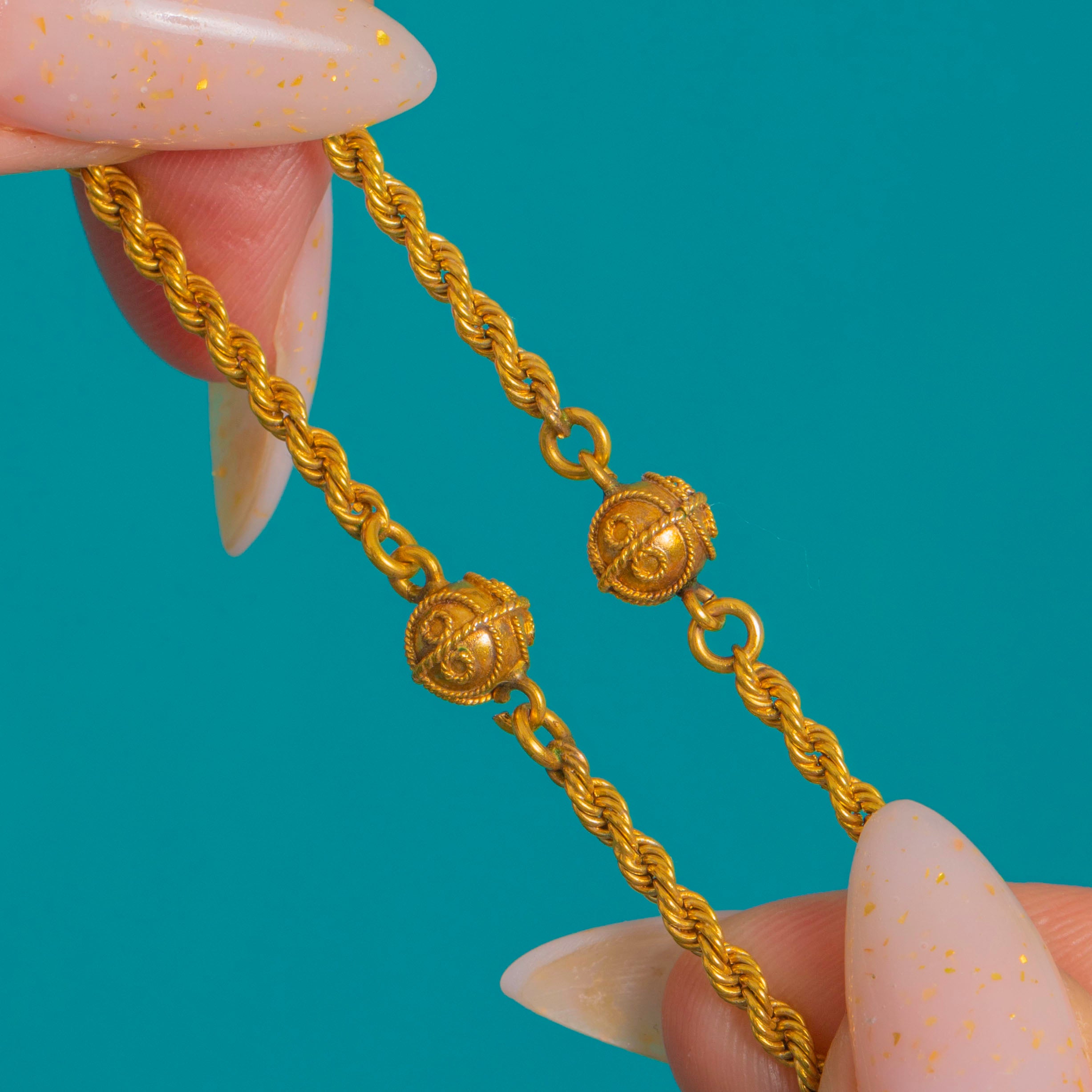 A sumptuous Victorian long guard chain crafted in bright 15ct Gold, its rope‑twist links punctuated by ornate cannetille orb detailing. The spherical stations are beautifully worked with applied cannetille and granulation, lending an elegant Etruscan Revival flair and a richly textured, luxurious look.