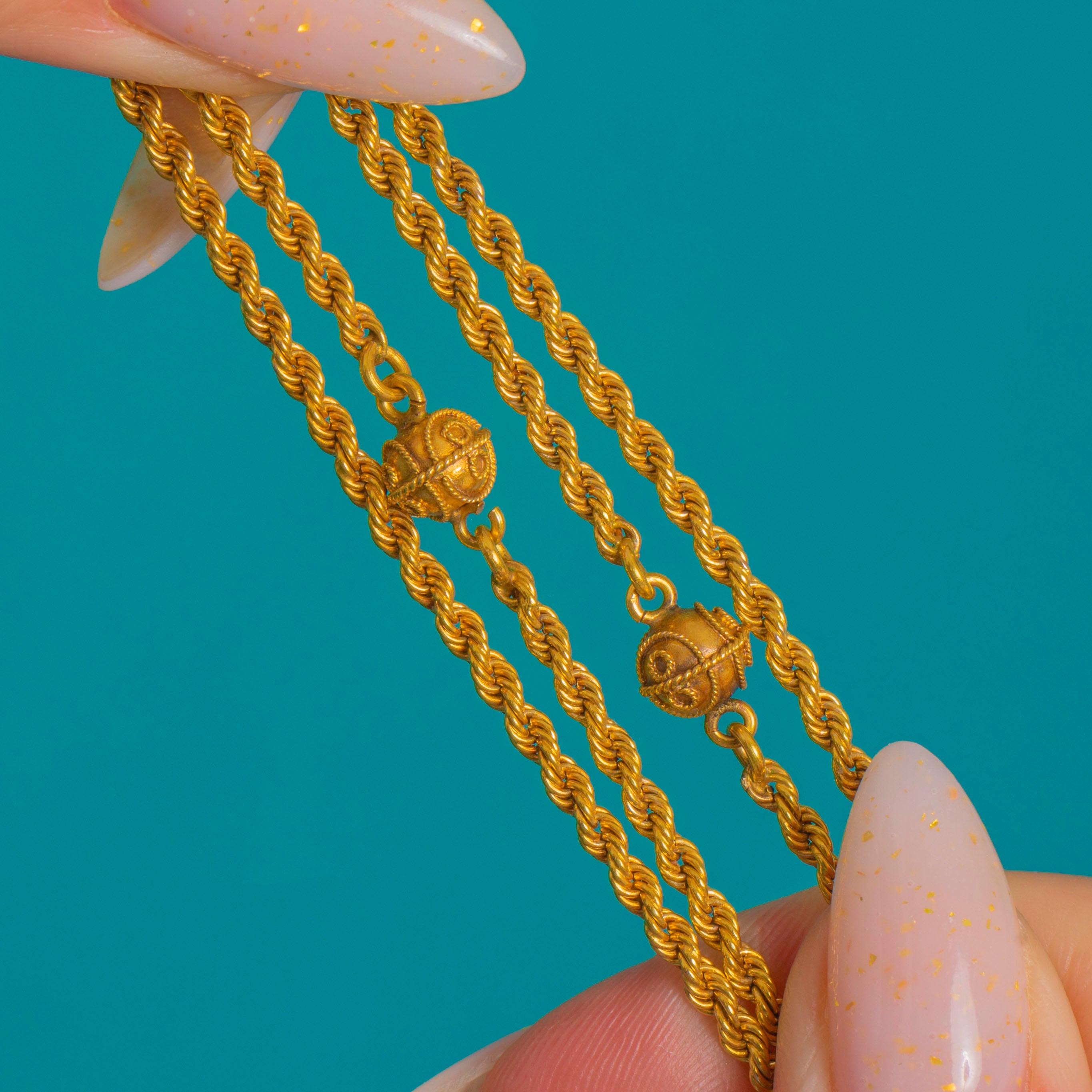 48" Bright 15ct Yellow Gold Rope Longuard Chain, Cannetille Orb Terminals