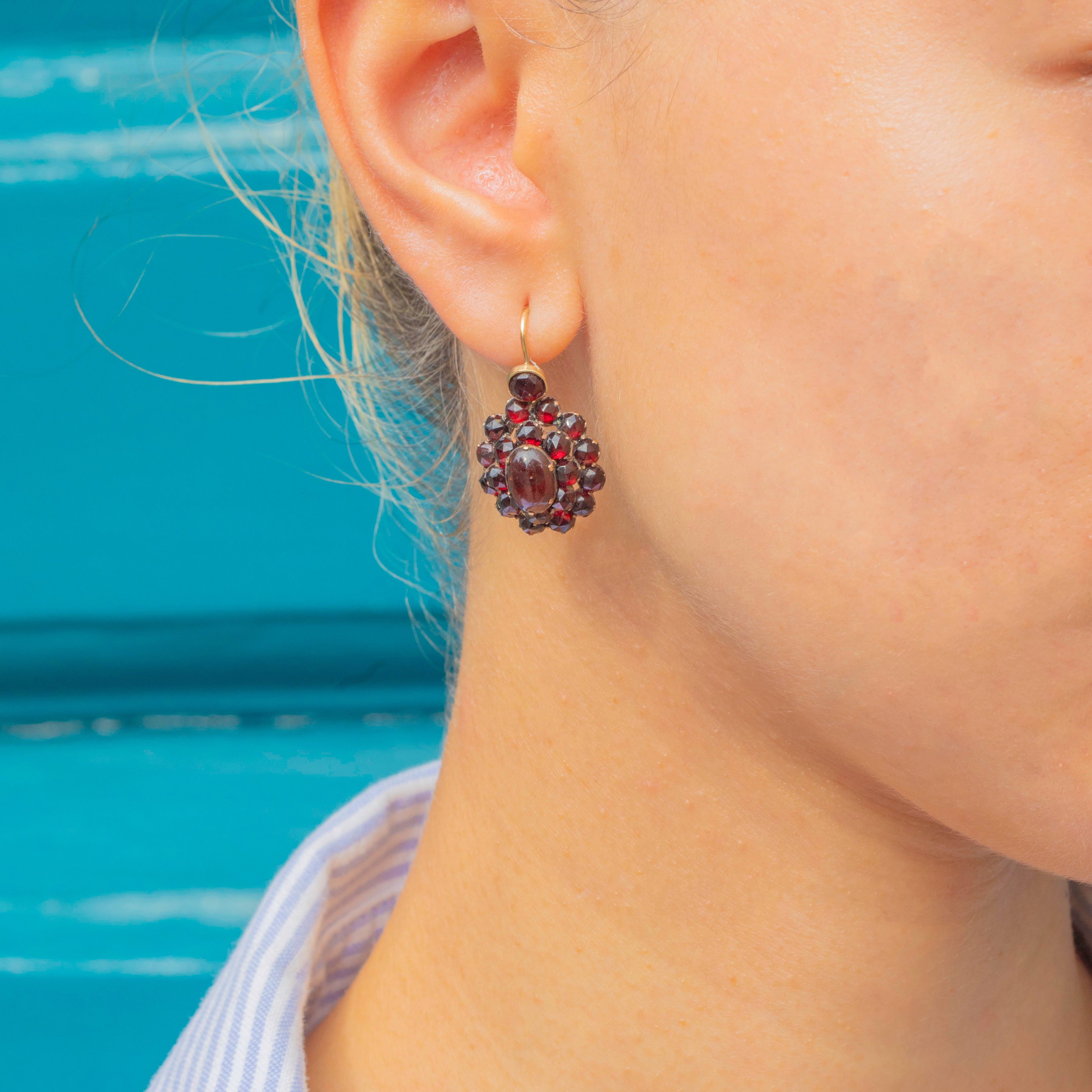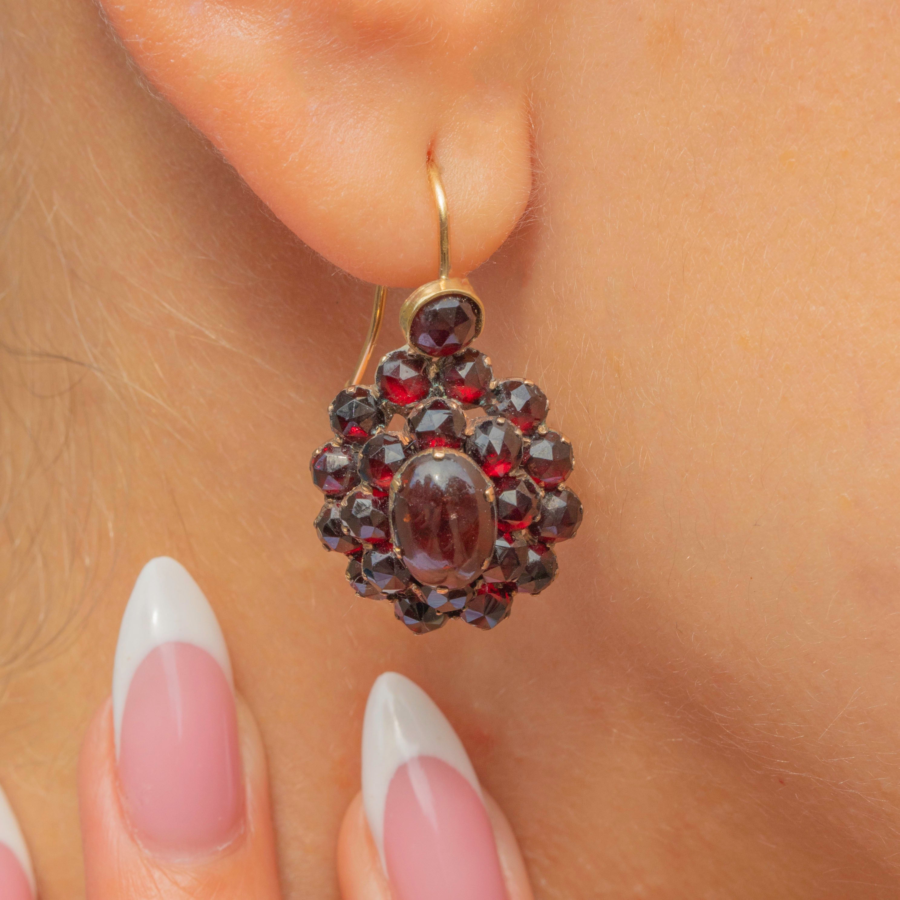 These striking Victorian earrings are crafted in 9ct Gold and set with deep, richly coloured Bohemian Garnets. Each earring features a central cabochon Garnet surrounded by a halo of glistening rose-cut stones, with a total estimated carat weight of approximately 5.00cts.