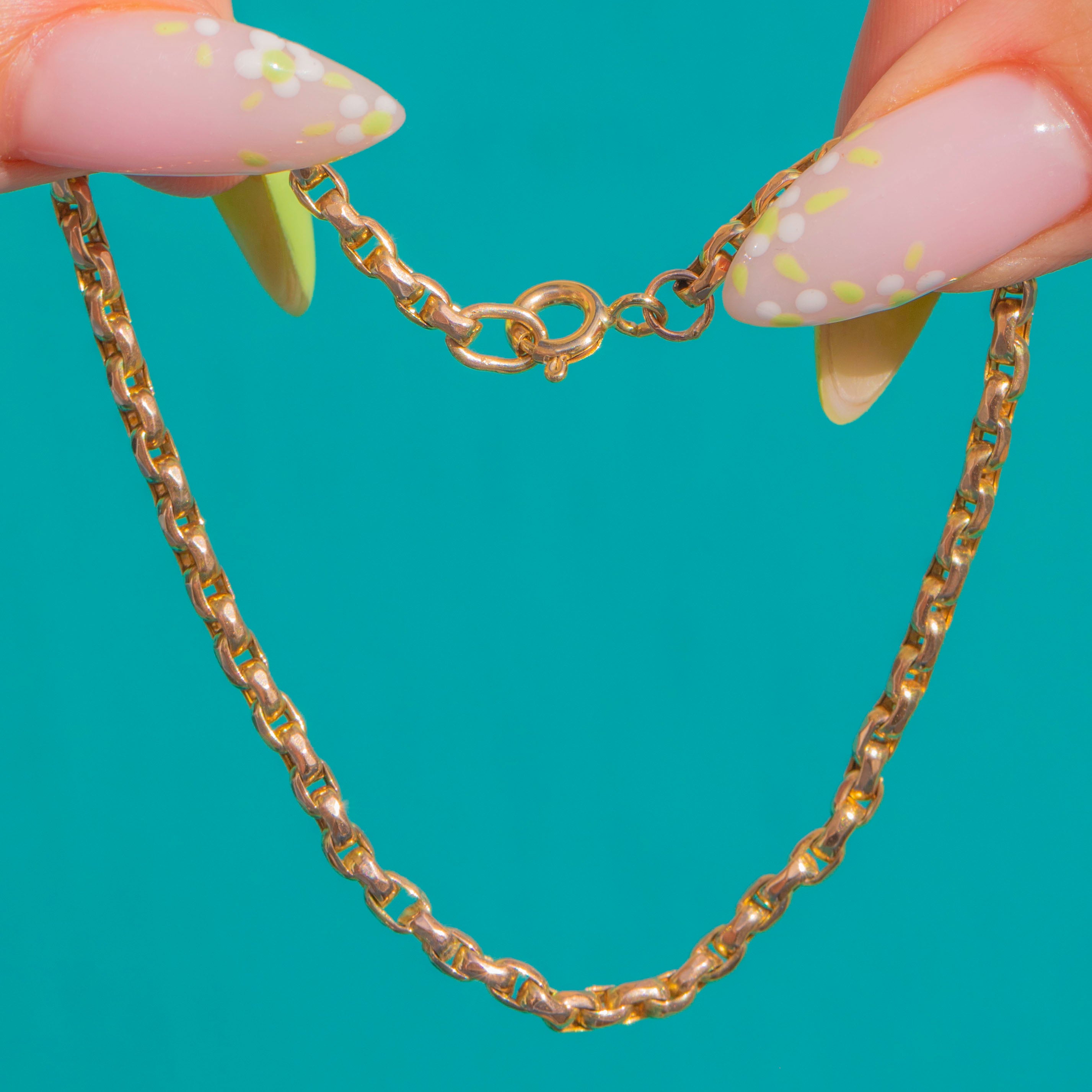 A timeless Victorian 9ct Gold Belcher bracelet, crafted with sleek, uniform links that catch the light with every movement. Its warm, golden glow and beautifully simple silhouette make it a quietly luxurious staple you’ll reach for day after day.