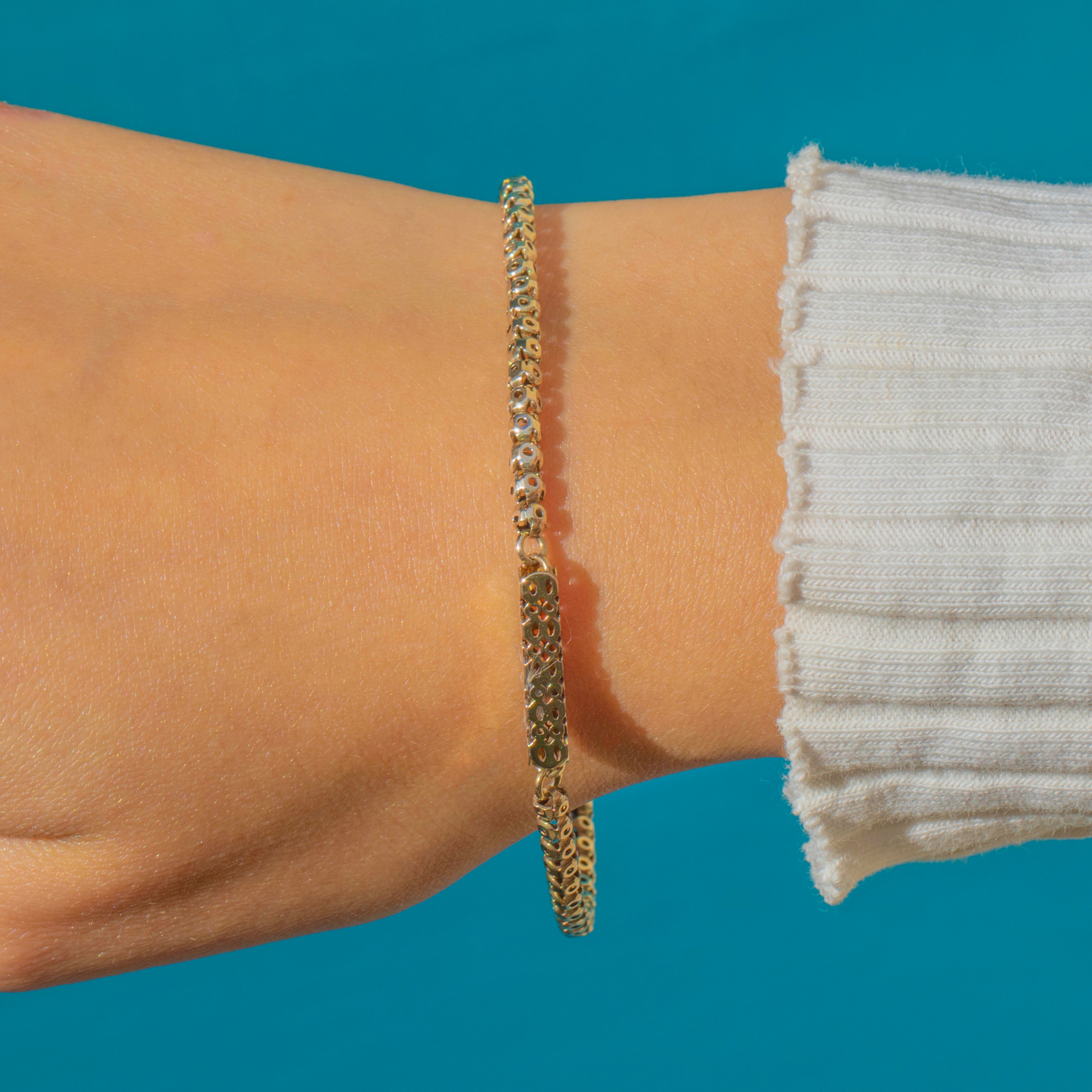 A beautiful Victorian chain bracelet crafted in 9ct Gold, featuring alternating pierced and box-style links. The intricate openwork gives the bracelet a light, lacy feel while maintaining a refined, elegant look characteristic of late 19th-century design.