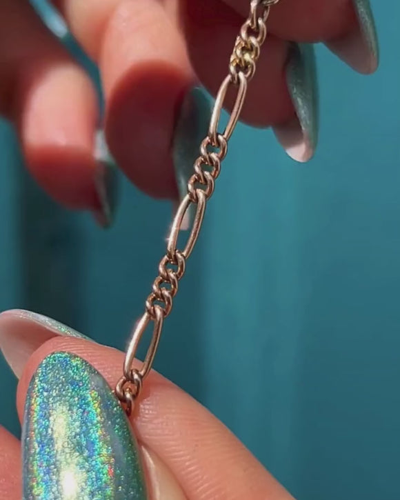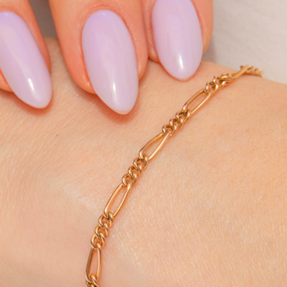 This antique 9ct Gold Figaro bracelet is sure to become a staple within your jewellery collection. Her Figaro links perfectly caress your wrist, crafted from sun-kissed 9ct Gold that radiates beneath the light.