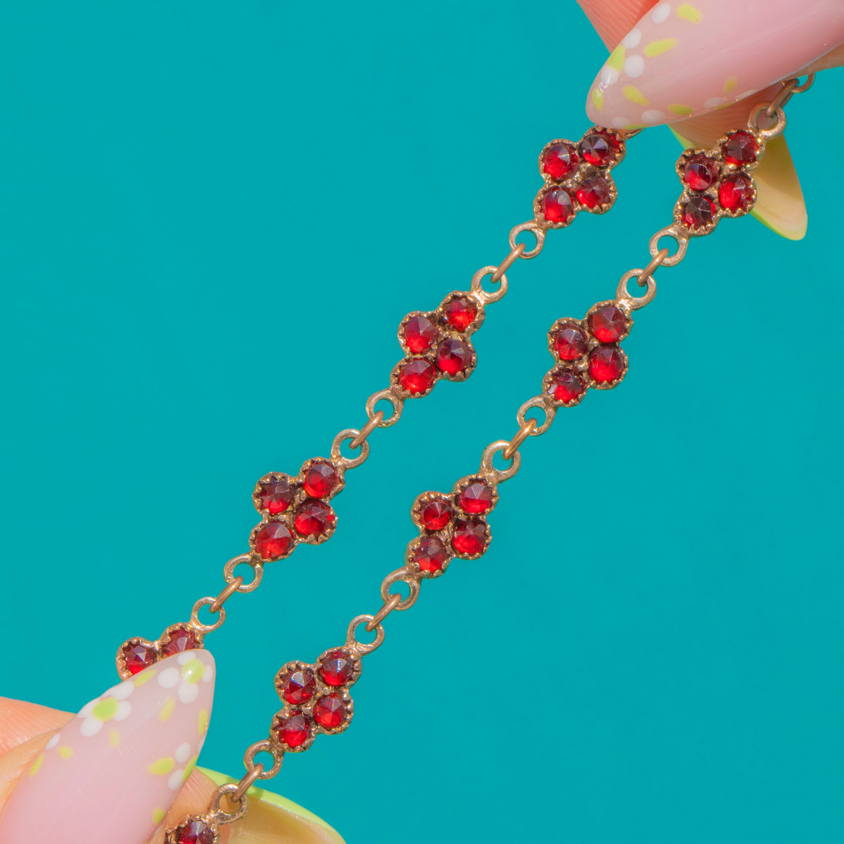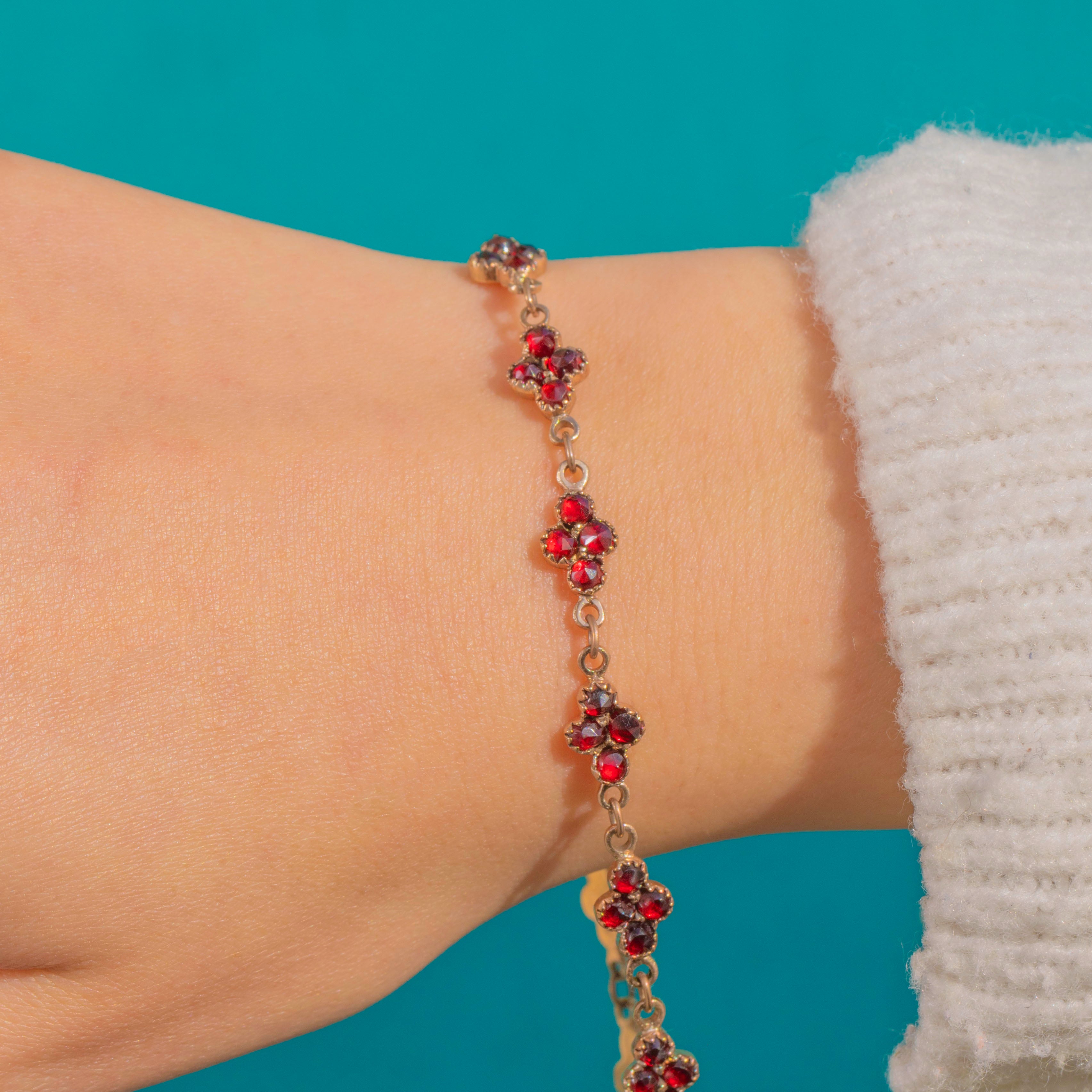 Rich, romantic and undeniably Victorian, this antique Bohemian Garnet bracelet shimmers with rows of petite quatrefoil clusters. Each floral motif is set with deep, wine-red rose-cut Garnets in scalloped closed-back settings, their saturated colour glowing against warm Gold tones.