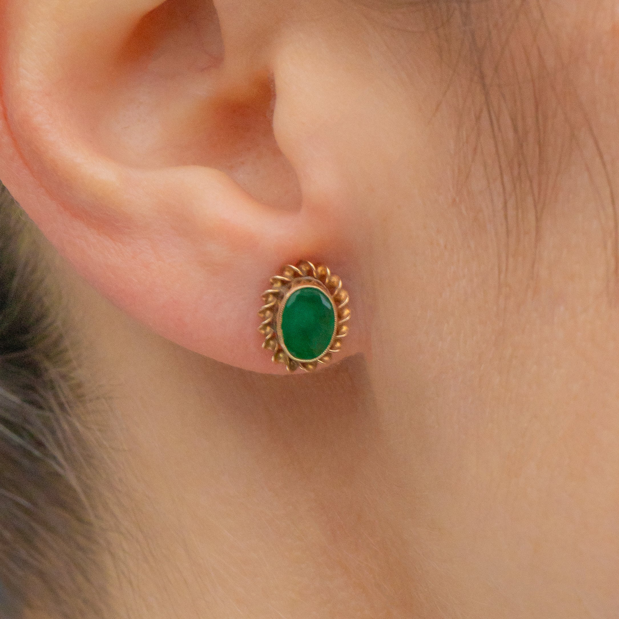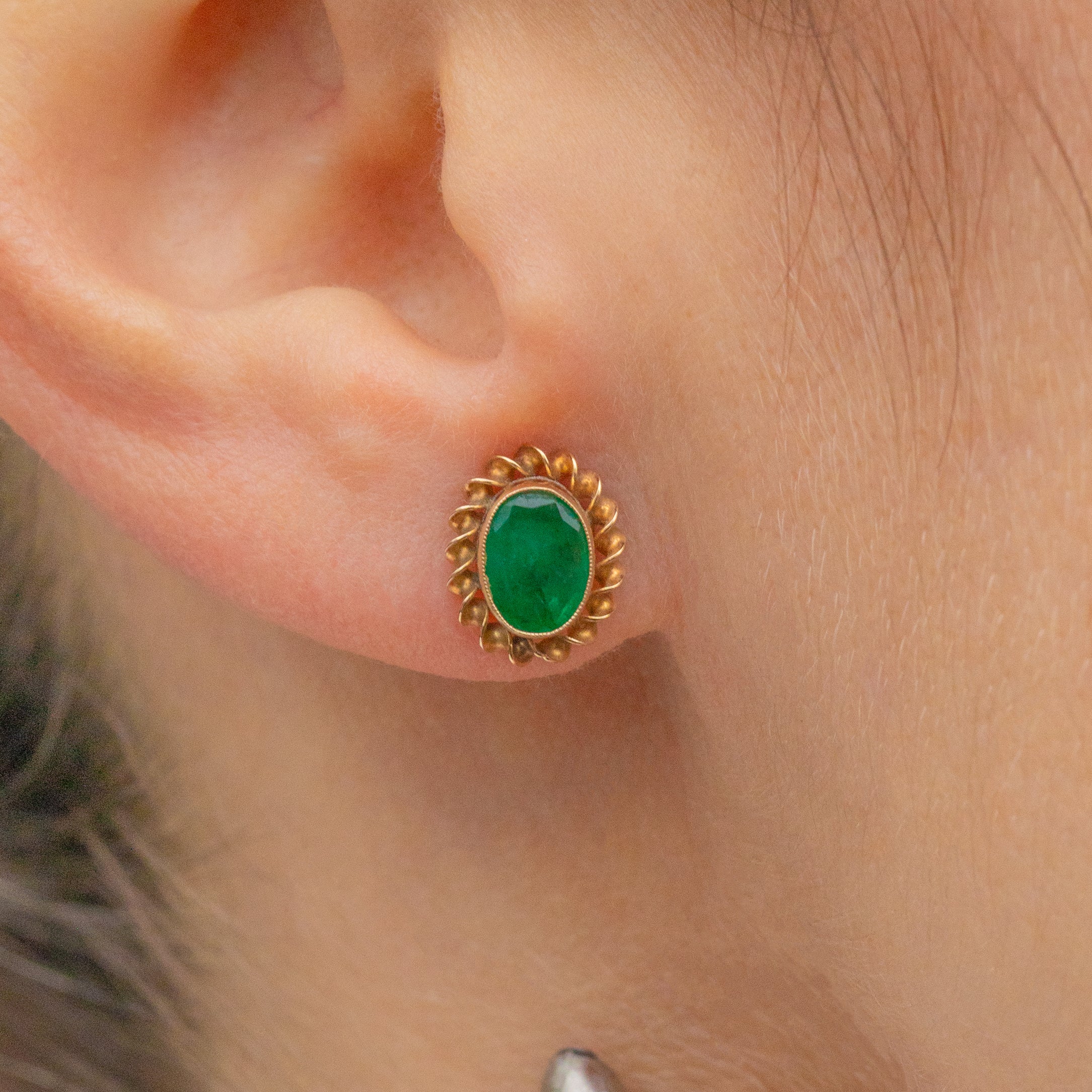 Each earring boasts a gorgeous Emerald radiating deep green hues, perfectly complimented by buttery twisted rope Gold borders. These Vintage earrings do not go amiss, and will make a cute addition to your jewellery collection!
