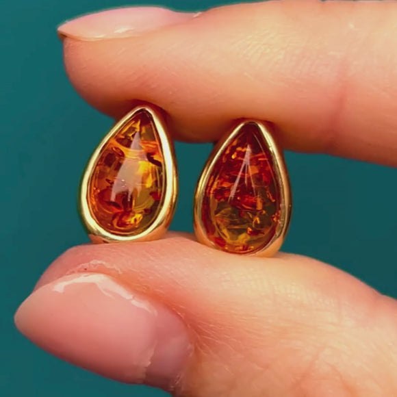 EXCELLENT. With securely set Ambers, smooth bezel settings and tightly fitting butterfly backs, these 9ct Gold Amber pear stud earrings are in excellent condition!