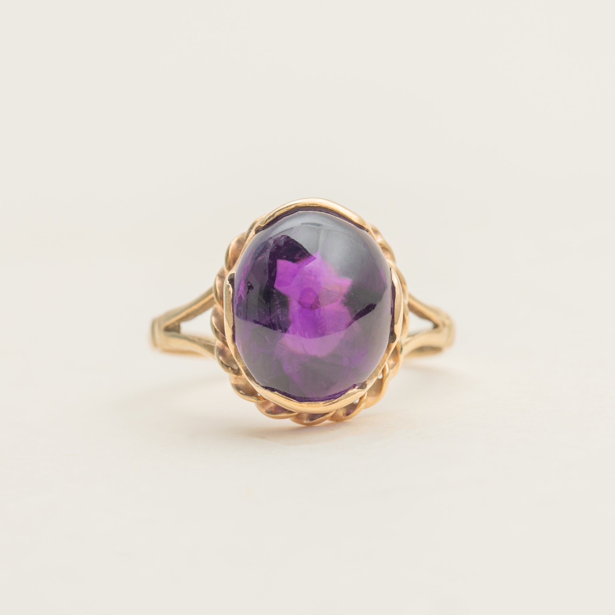 EXCELLENT This 9ct Gold Amethyst Cabochon Ring is in very good condition. The Amethyst is richly hued and well set into her 9ct Gold. There is a very slight scuff to the Amethyst, however, this is only truly visible under close inspection. The ring band has got a well-rounded shape, making her uber comfortable to wear.